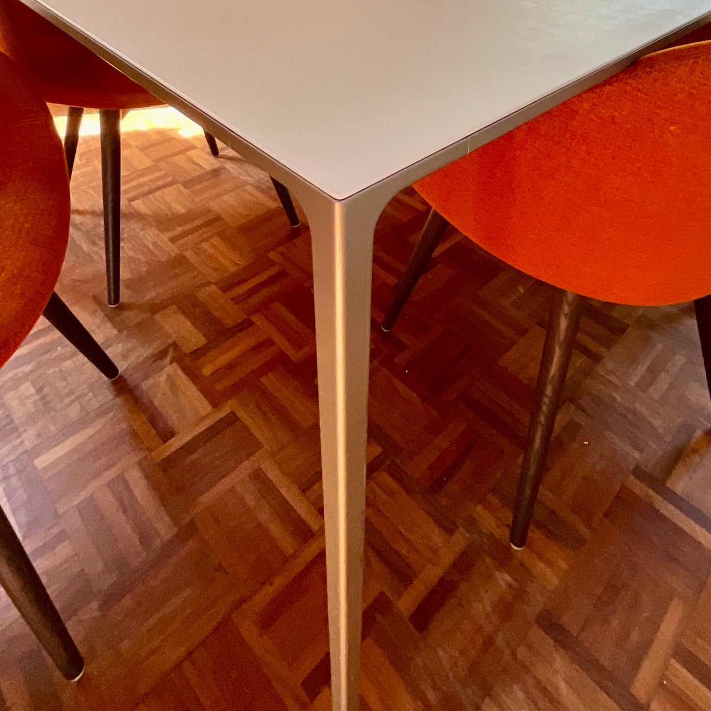 leg in 32 Palladio. Matt lacquered glass top in colour 108 Bianco Latte Opaco
