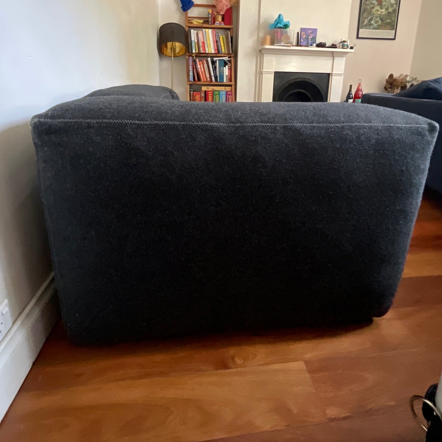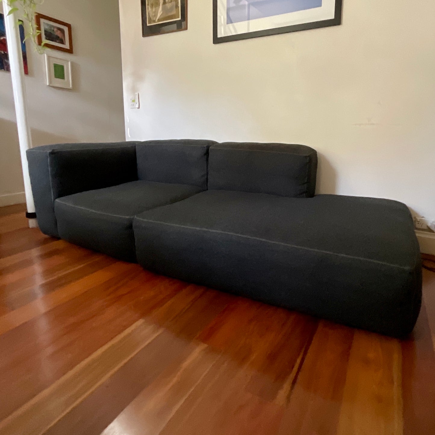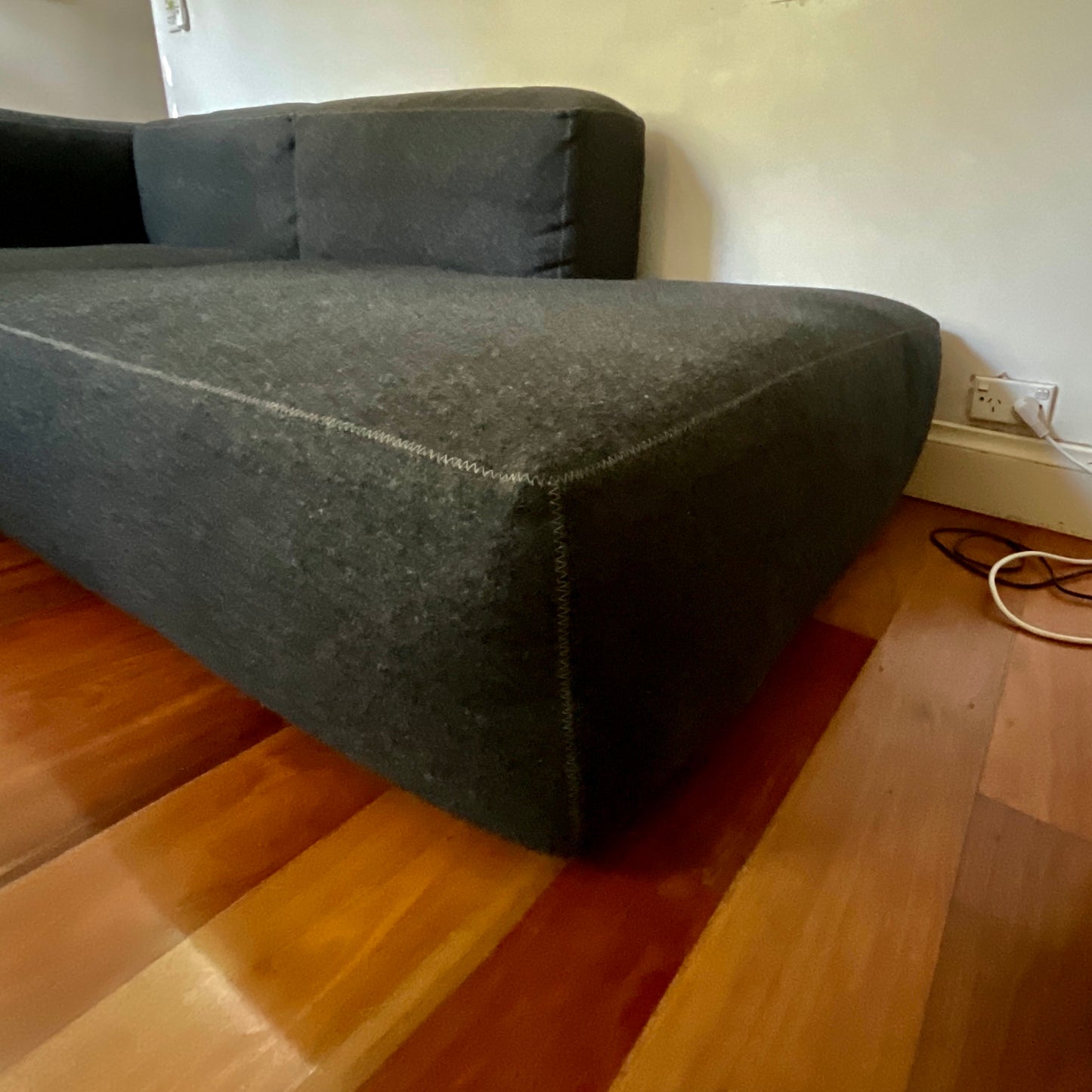 Rounded edges and soft cushions create a milder, relaxed tone with the Mags Sofa. Retaining the same strong aesthetic presence as its firmer, more pared back sibling, this version takes on a more fluid, poetic silhouette. Optimal comfort and durability are ensured by the sofa’s solid construction, which has been built using durable, high-density foam and covered with down padding for extra softness. The low frame has a distinctly lounge feel, which is reinforced by the deep seats and results in a more open, welcoming space. The sofa we have on offer is in two pieces. The sofa is upholstered in charcoal coloured felt.
