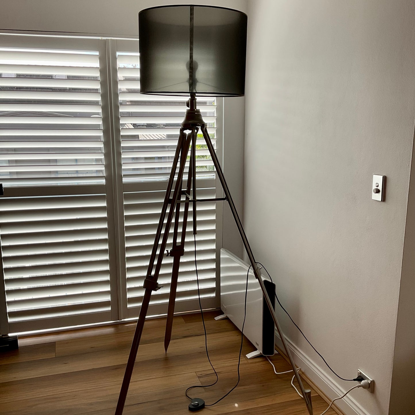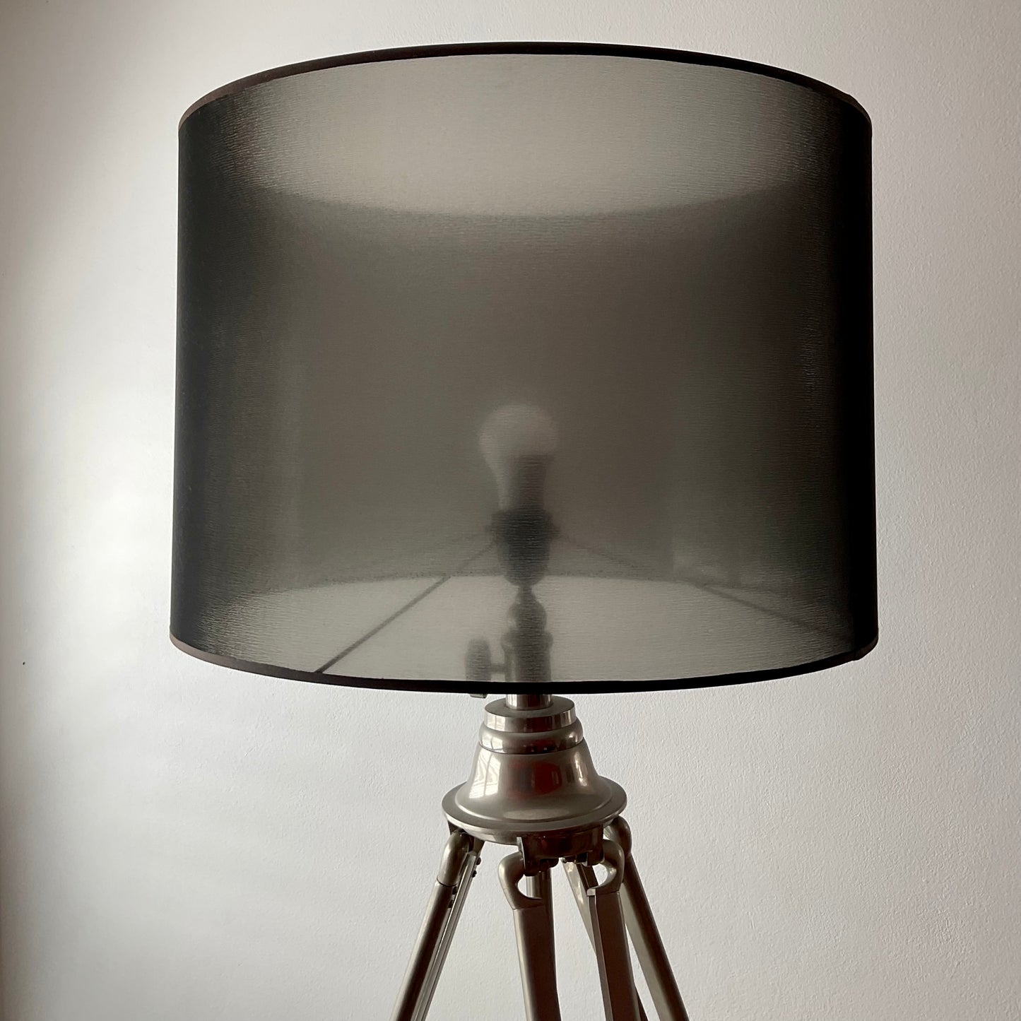 The Malabar floor lamp we have on offer has an industrial style tripod base with a black sheer shade.