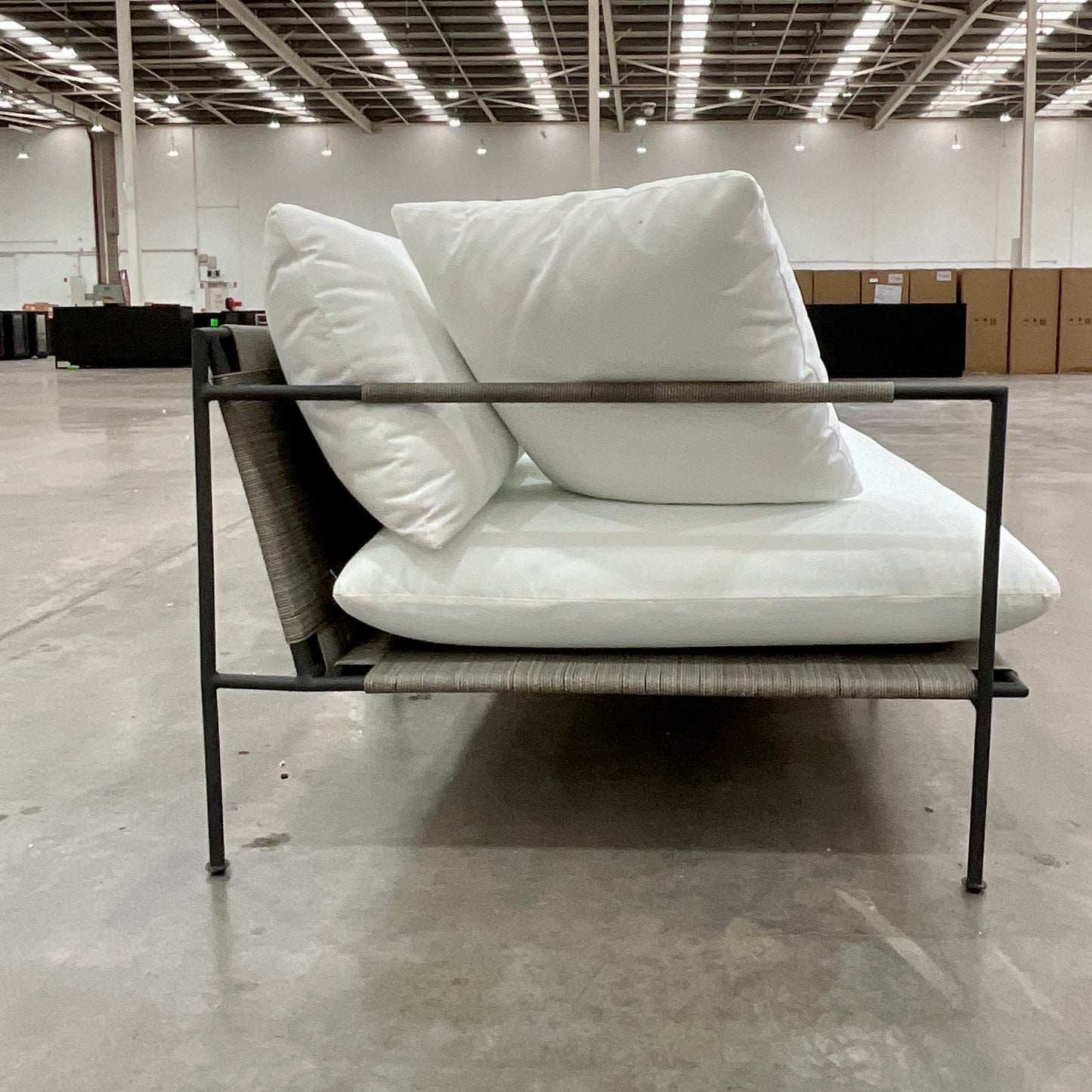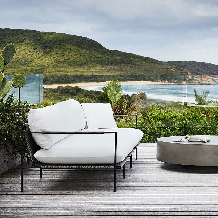 Inspired by the minimalist elegance of Scandinavian design, the Malmo outdoor collection features a slender powdercoated stainless steel frame, with a tightly woven seat base and wrapped arm detailing. Nodding to traditional techniques, the collection features a 'Kimono' style weave detail, on back and base, that will complement both modern and traditional alfresco spaces. Cushions are upholstered in high-quality sunproof olefin to stand the test of time. The sofa we have on offer is in white fabric.