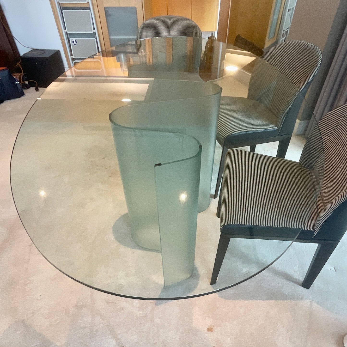 Marea dining table from the Italian manufacturer Fiam. Model made of transparent glass. Support of bent glass is made in the form of a wave, top of glass with a thickness of 12-15 mm can withstand loads of 200 lbs. oval Table for dining room in modern style.