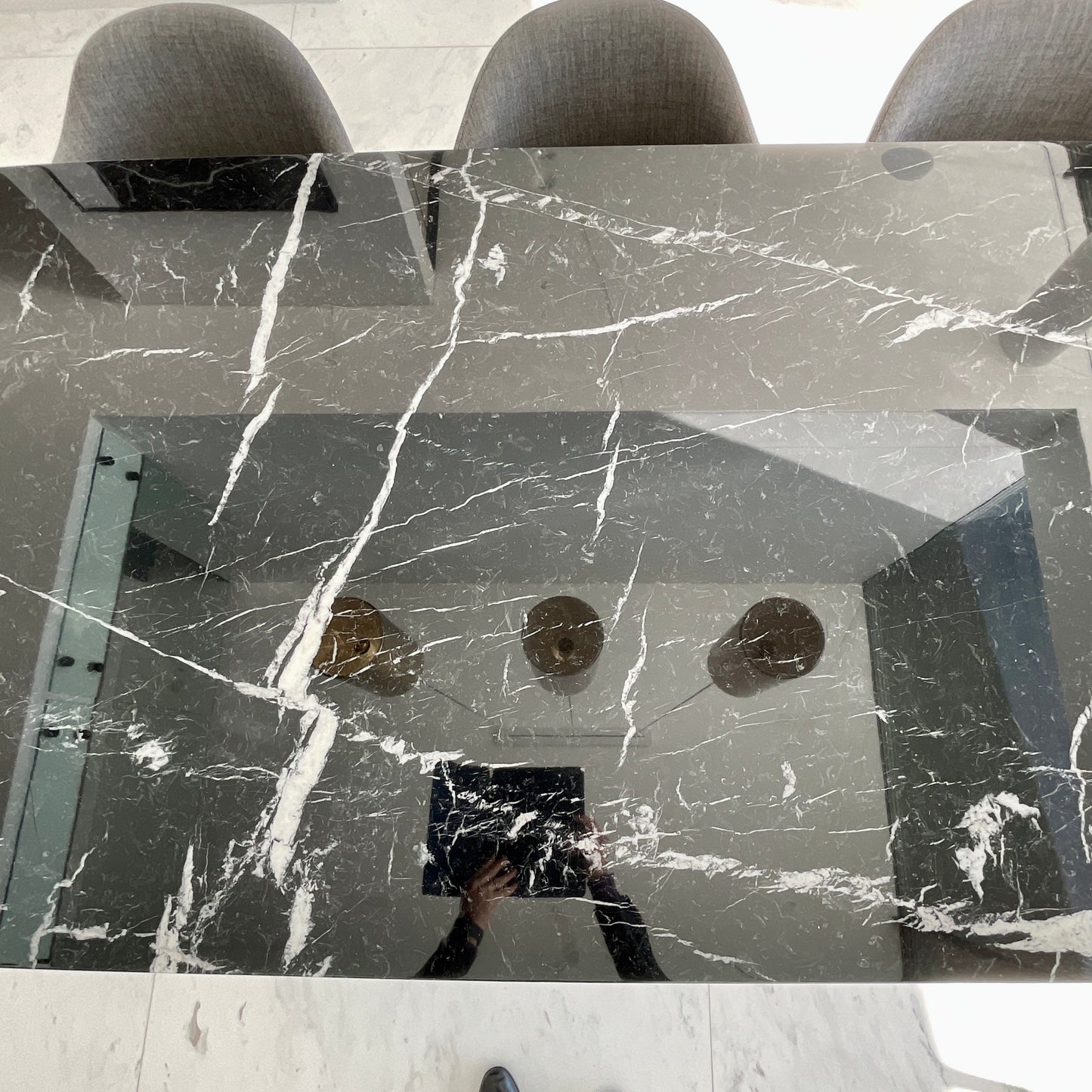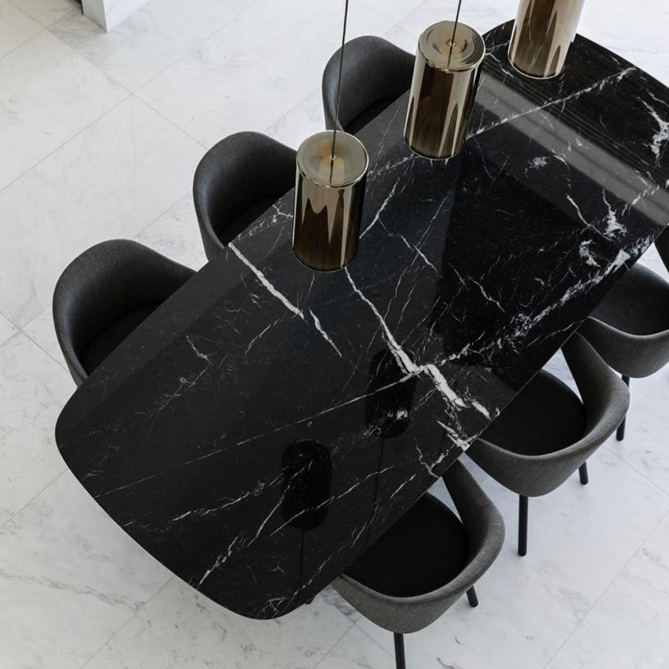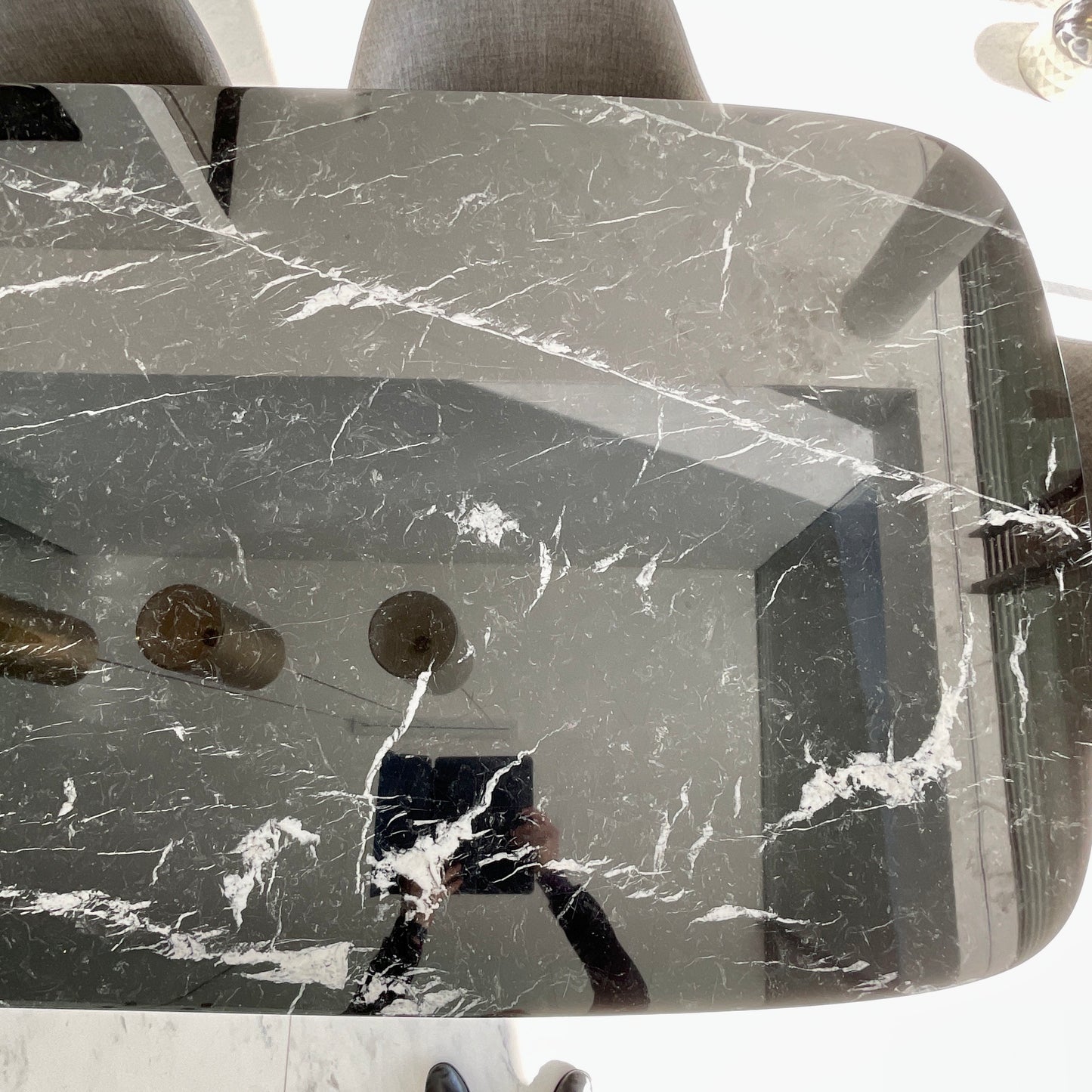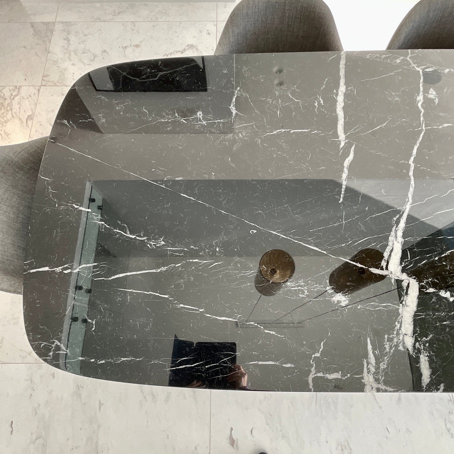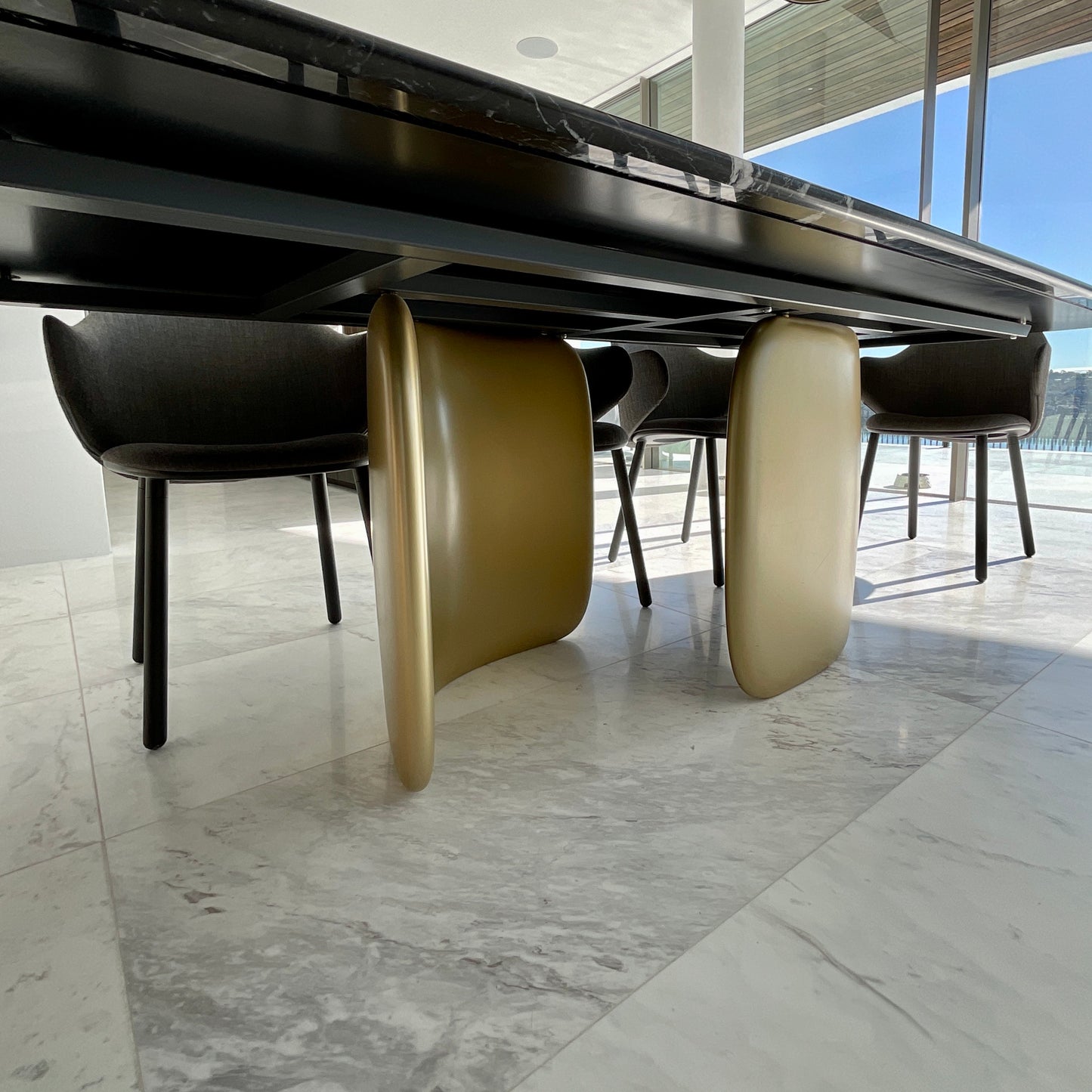 Two opposed elements embraced in a sinuous curve that create an illusory volume in a perfect balance game. As its name suggests, the Mellow table features soft and curvilinear shapes, with an enveloping base, made of two different elements. The table we have on offer has a Mat Brass Base with Marquina Marble top.