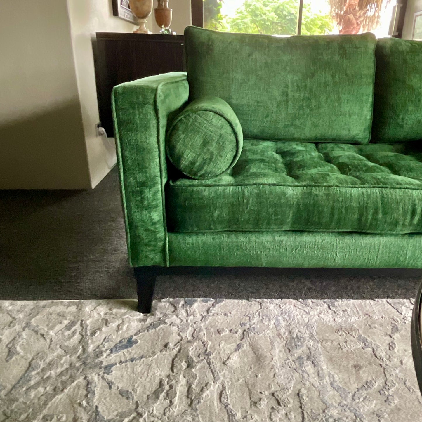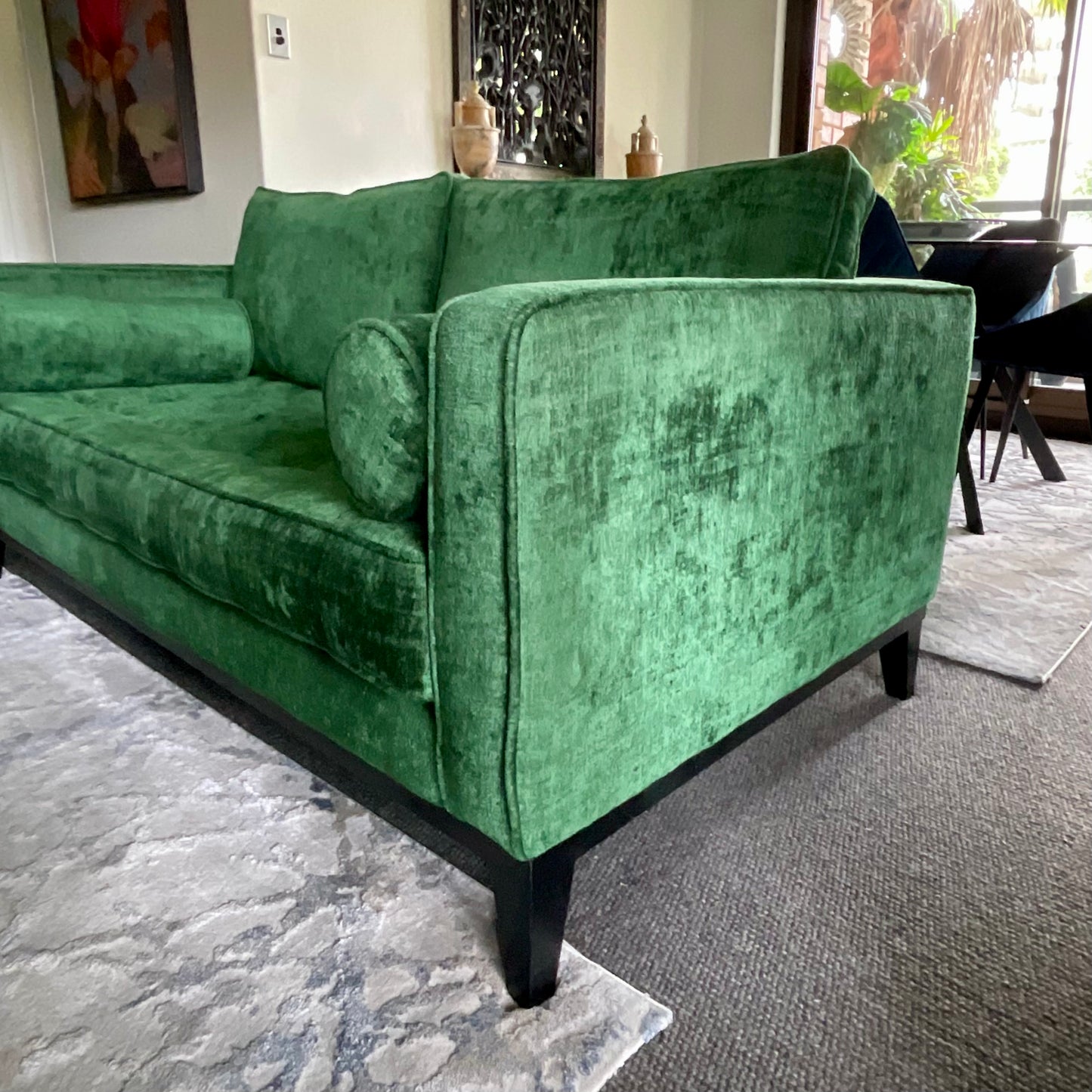 The Mia sofa is a modern classic design with its seat stitching and button details, bolster cushions, piping, timber legs and base will complement your living space. 100% Australian made.