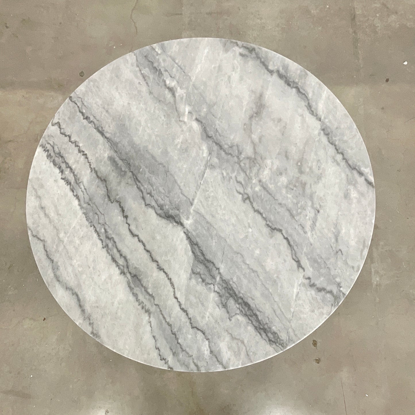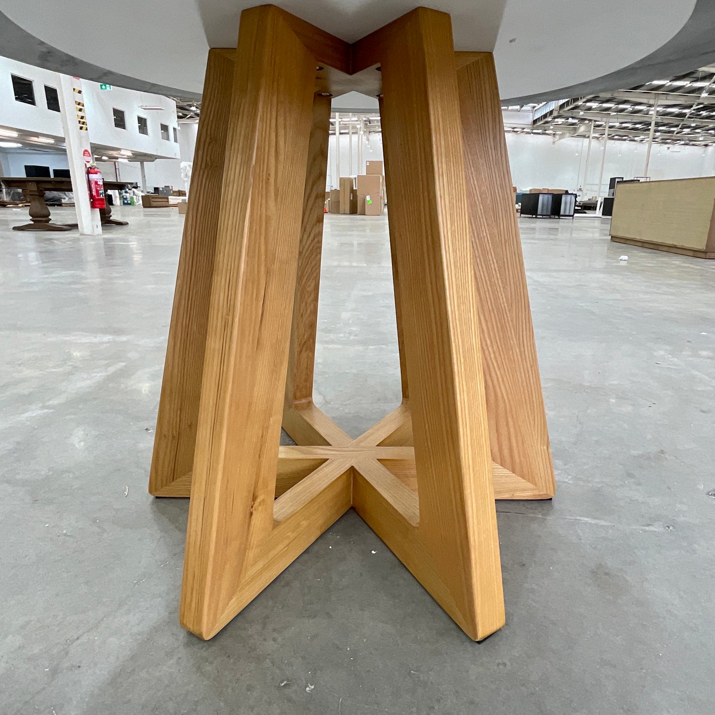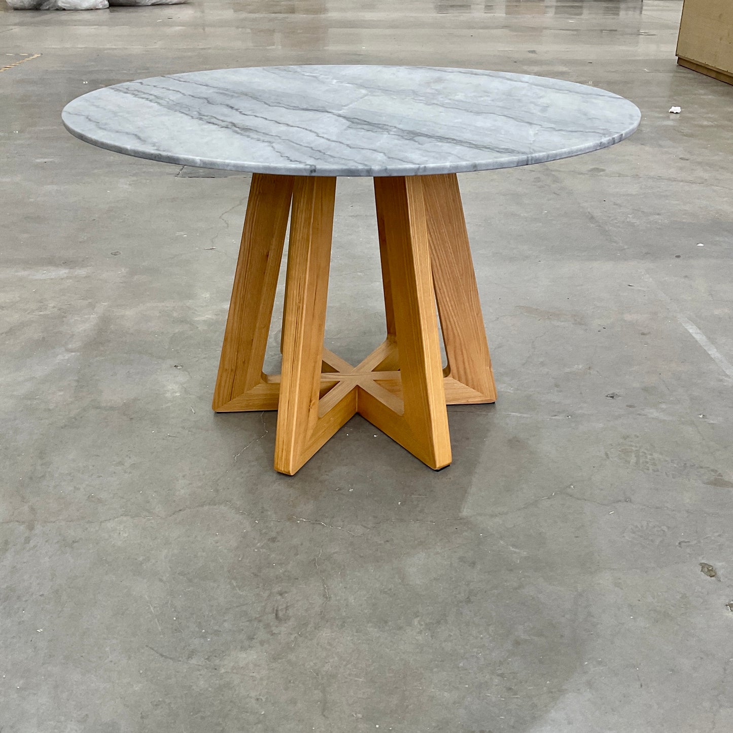 The Montara Round Dining Table offers a warm and inviting nature that welcomes a spot for casual daily dining, ideal for the laid back eat-in kitchen or a modern dining room. This unique design has a hand-carved pedestal base and offers versatility when combined with various styles of dining chairs. Crafted from solid timber with honed marble top and timber base, available in multiple sizes, the table is destined to become a classic. The table we have on offer is in grey honed marble with natural oak base.