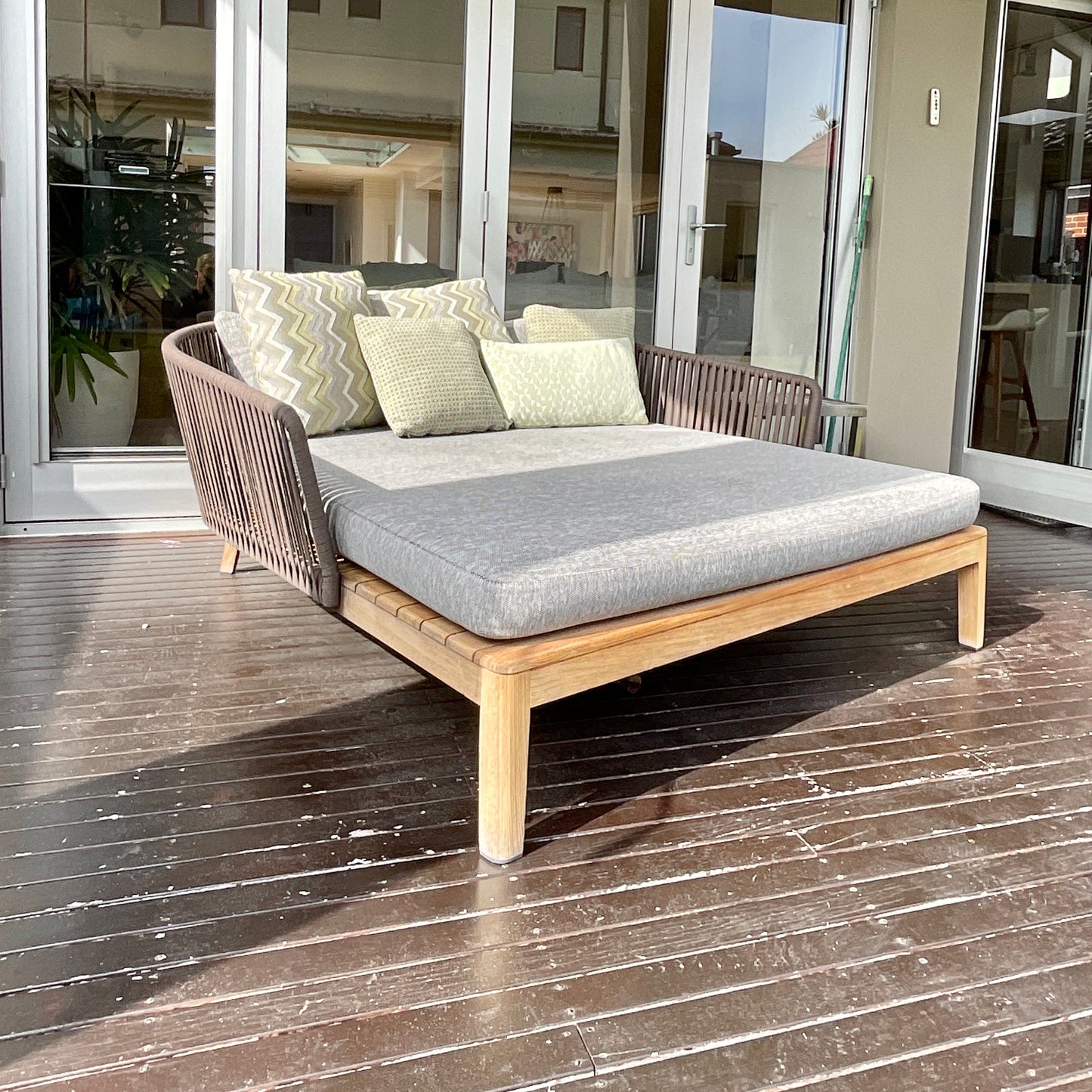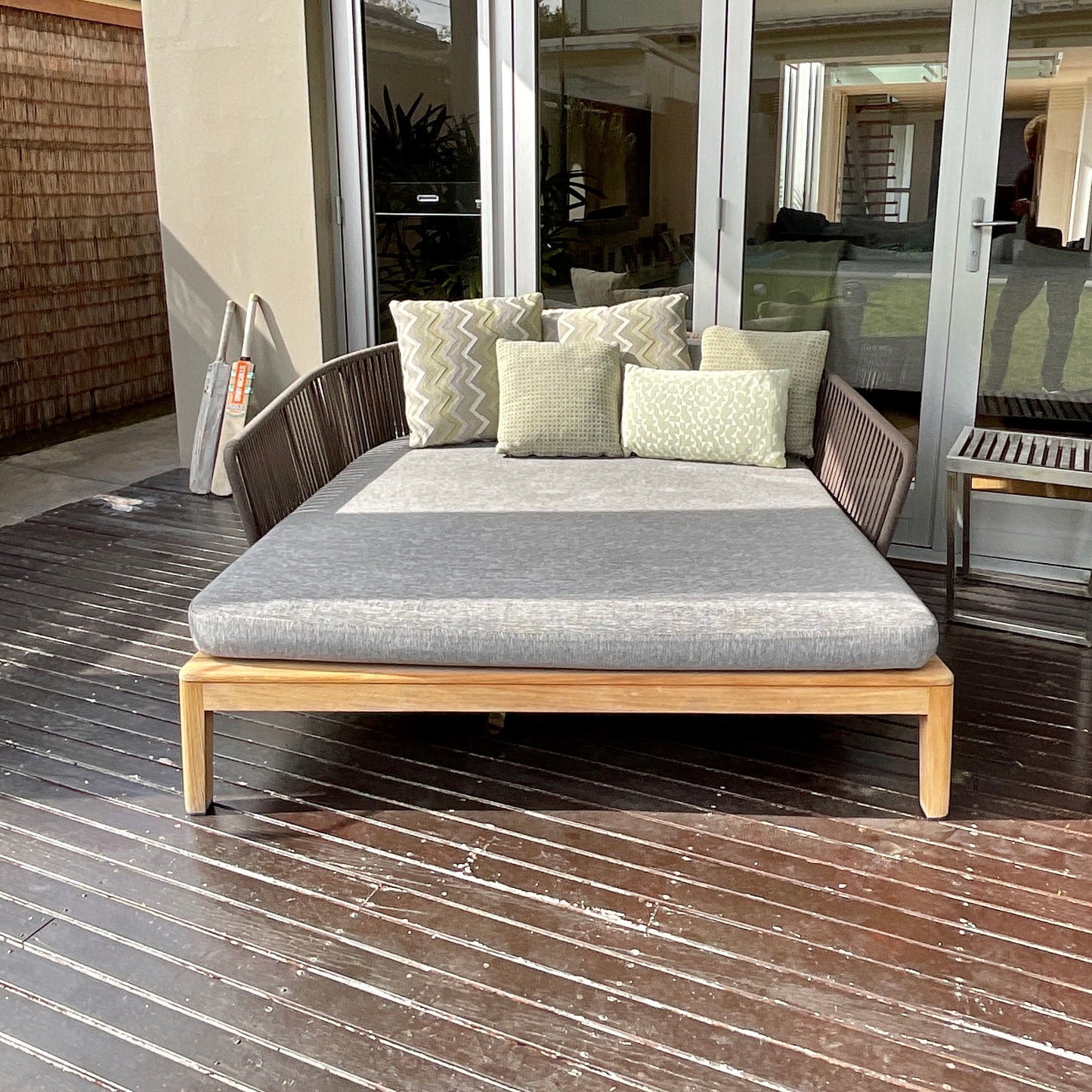 The generous Mood daybed offers room for two to snooze away in the sun, surrounded by a bunch of comfy outdoor cushions. The airy design has a warm combination of teak and handwoven Tricord that will immediately create an intimate and natural atmosphere on your patio. Available in Linen or Wenge, the Tricord yarn consists of polyolefin and is weather-resistant but has a very natural look and feel. Materials: Teak frame with Tricord backrest.