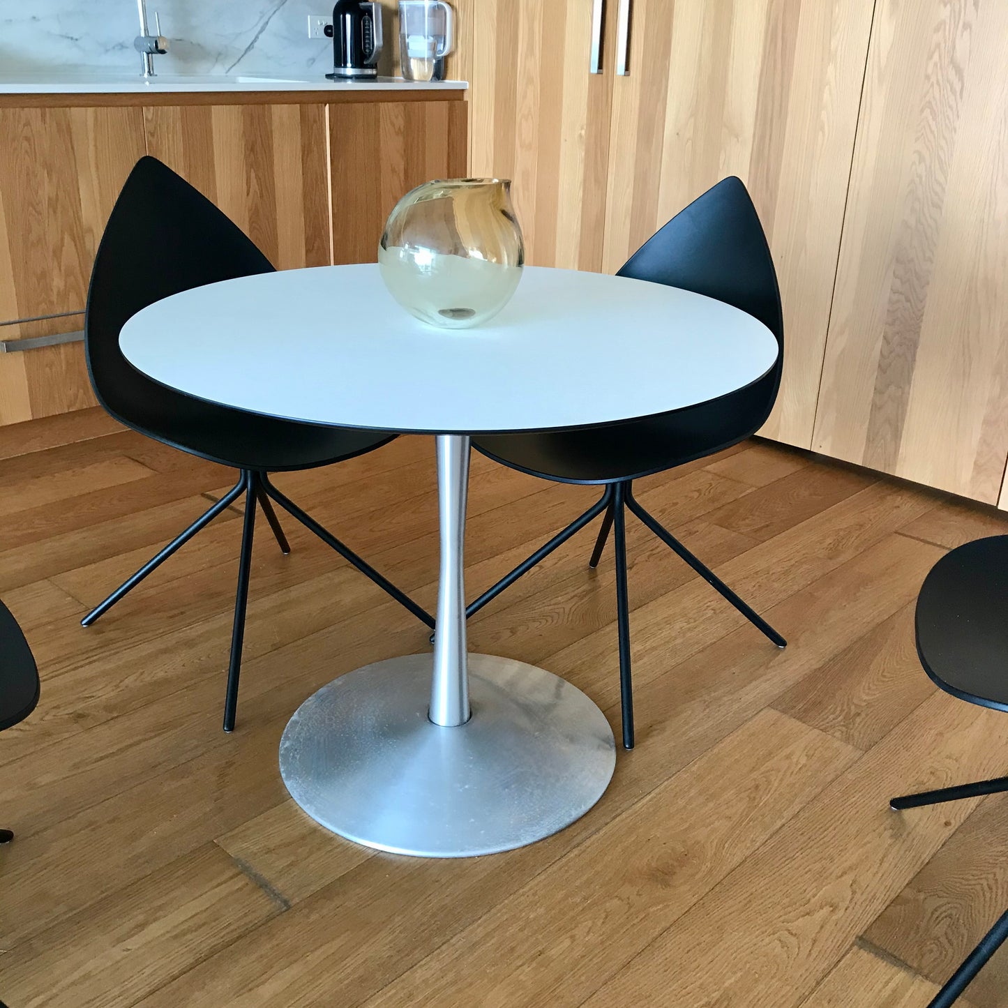 In a tight spot? Create calmness while optimizing your space with the round New York table. With an elegant table top and a minimalistic base, the table adds a spacious felling to your room while allowing for a small dinner party. The table we have on offer has a aluminium base and white top.