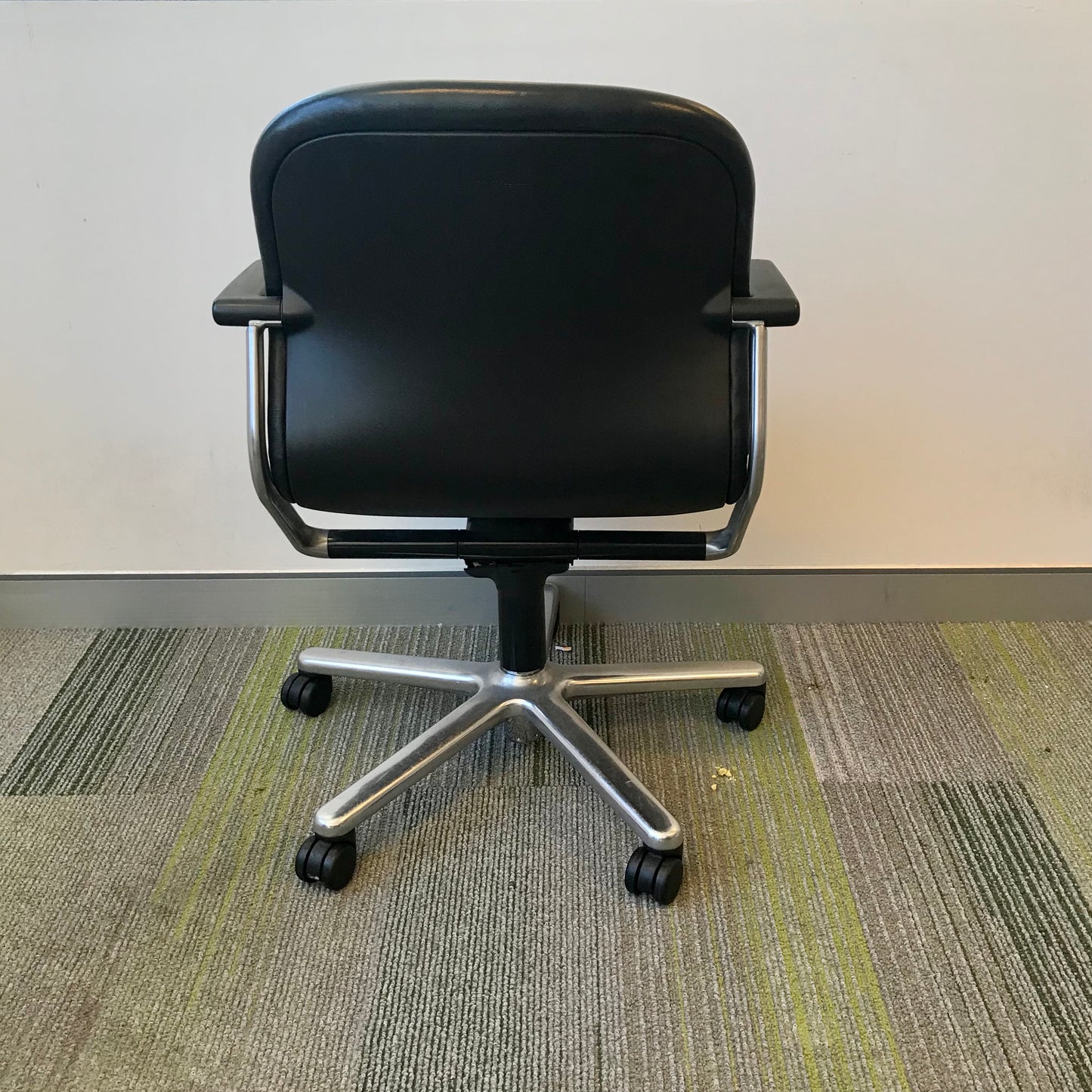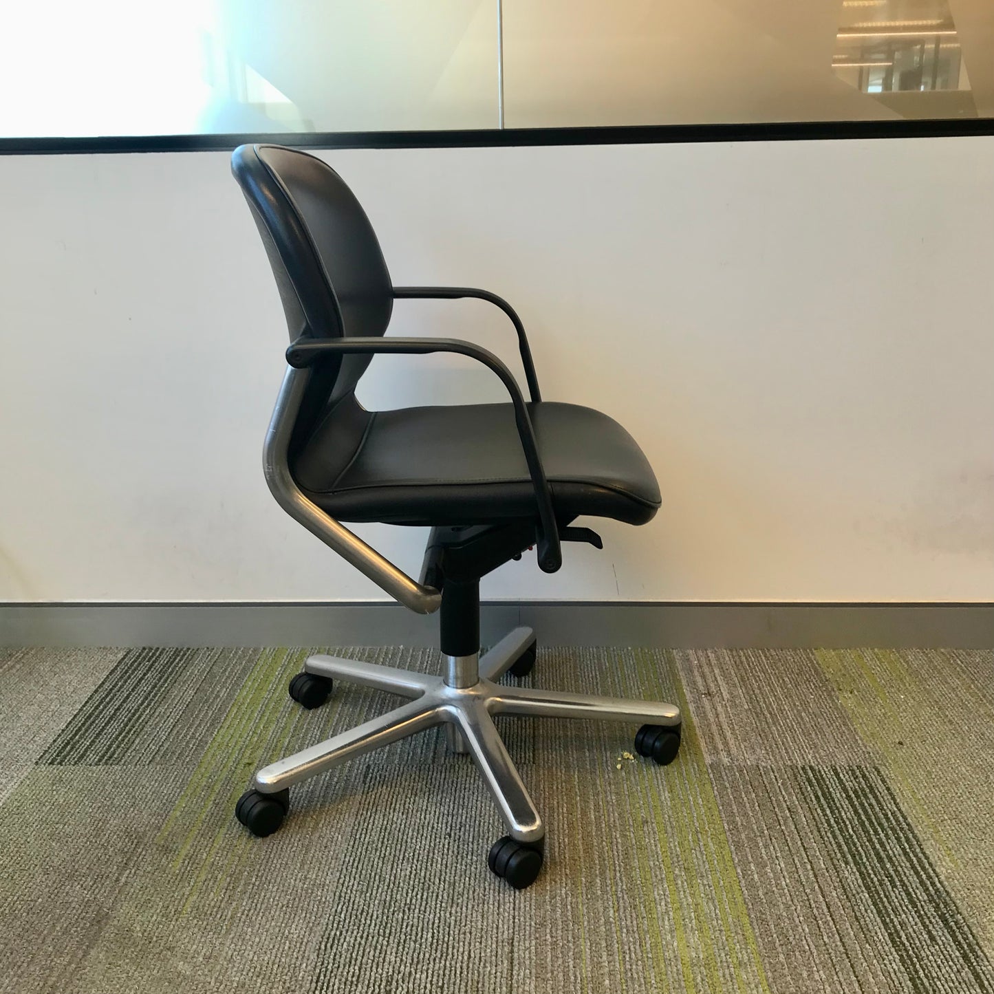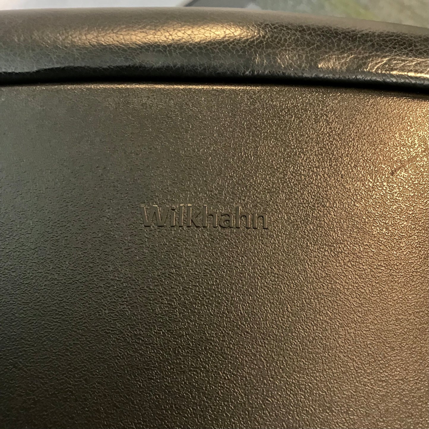 Simple desk chair by Wilkhahn. The chair we have on offer is in black leather. The chair sits upon a five star base with casters. The chair swivels and is height adjustable.