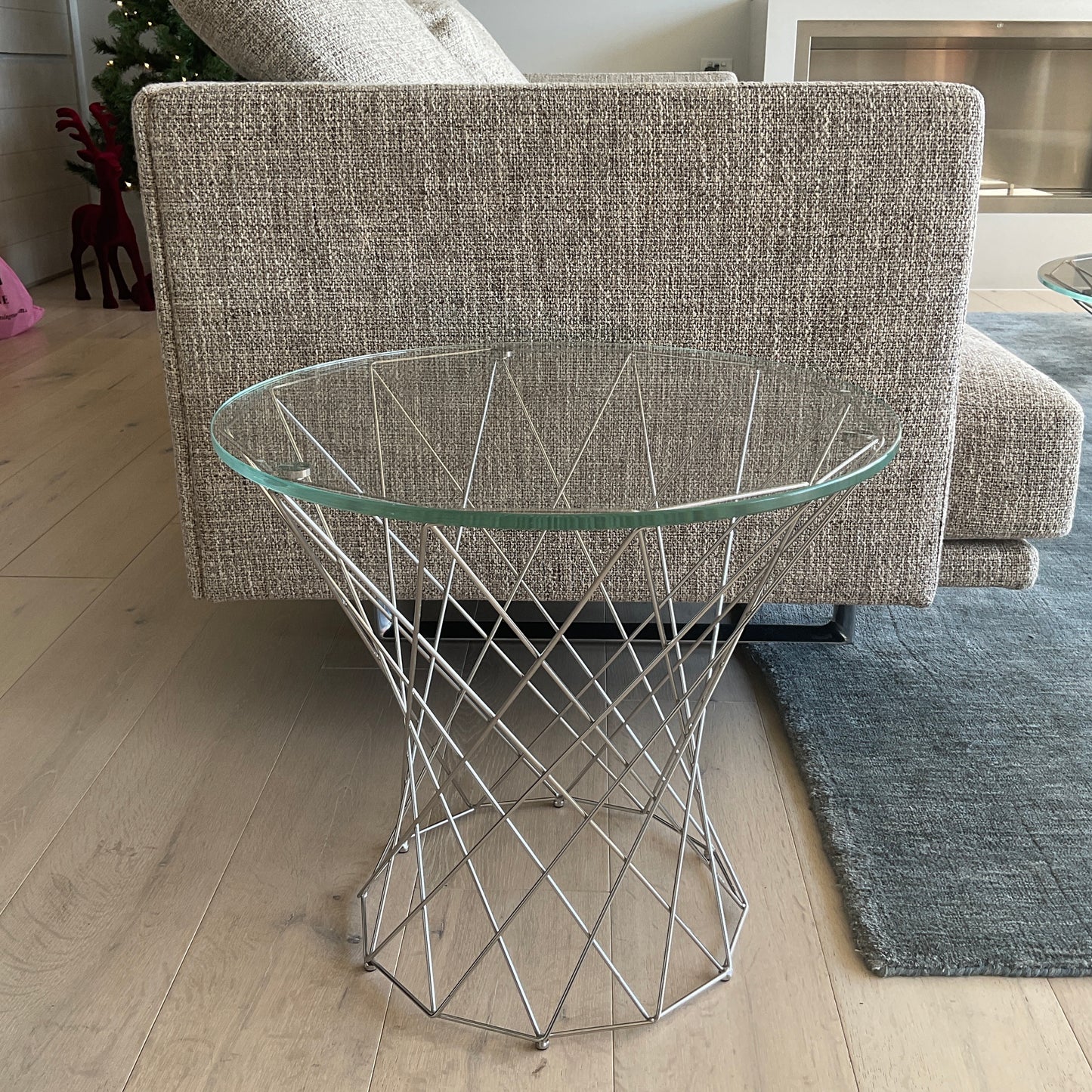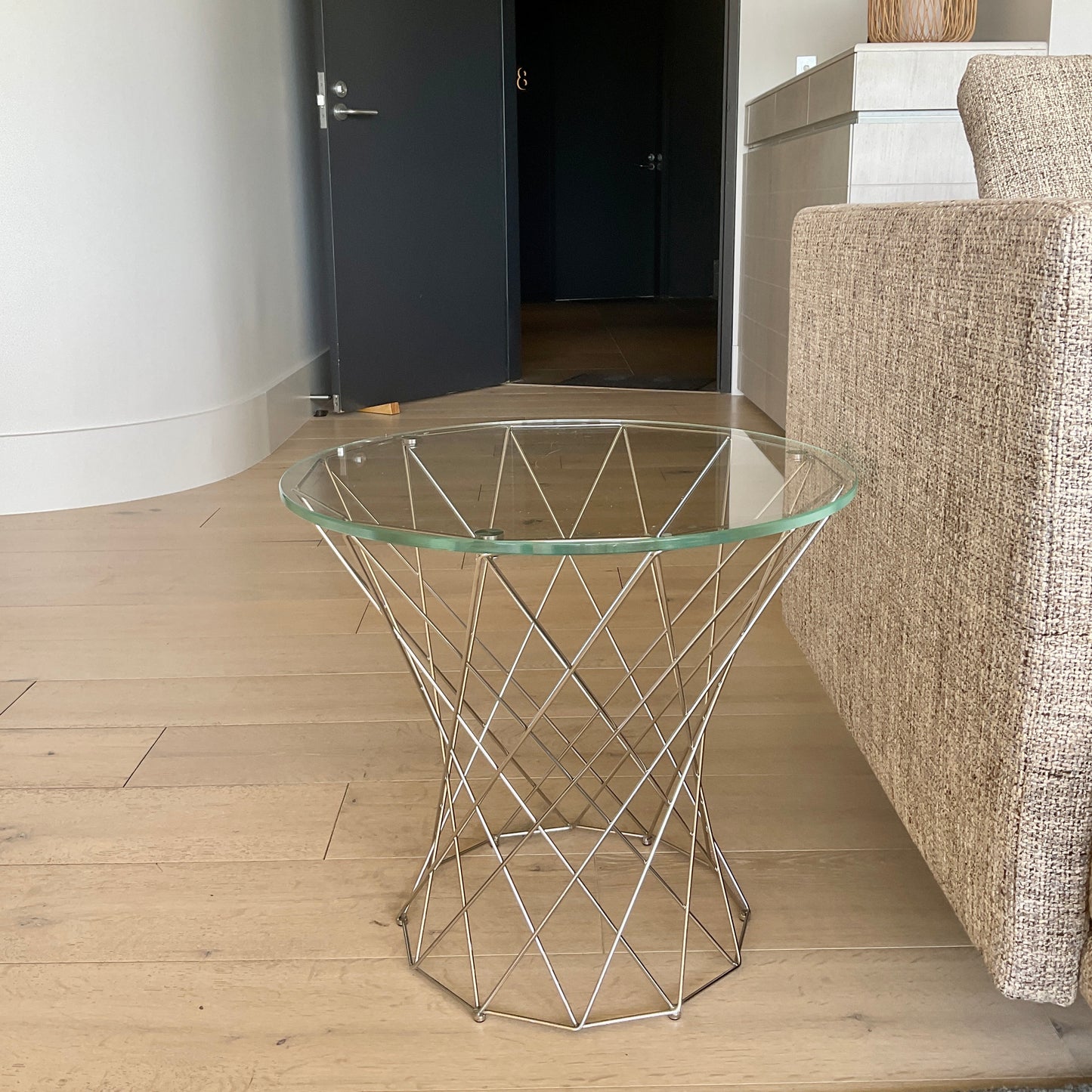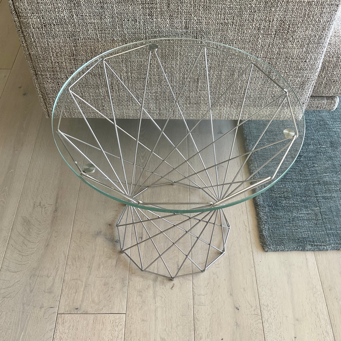 The Oota Table wants to be seen. A very special companion, as splendid and elegant as a jewel. The delicate trellis work supports the round glass top that subtly and atmospherically reflects the light. The table we have on offer has a polished stainless steel base with clear glass top.