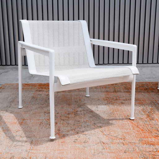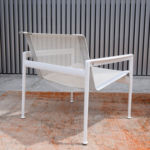 Richard Schultz designed the collection in 1966 at the request of Florence Knoll, who wanted well-designed outdoor furnishings that would withstand the corrosive salt air at her home in Florida. Through the years, the 1966 Collection has earned a special place in the world of outdoor furniture and is considered a classic design for the garden. The 1966 Collection has also been chosen to be included in various museums, including the Permanent Design Collection of the Museum of Modern Art, New York (MoMA). We emphasize exceptional durability. We have re-engineered the furniture to incorporate the best modern materials, including Teflon thread, powder coat paint and stainless steel. The item we have on offer is the lounge chair. It has a white frame with white mesh and tape.