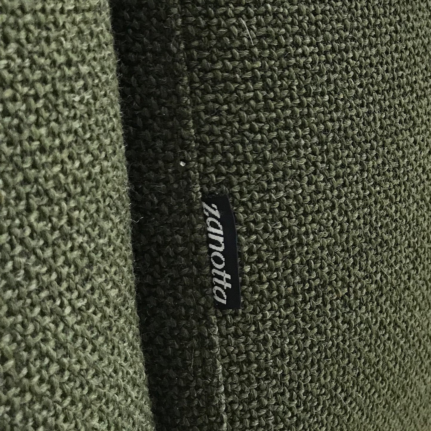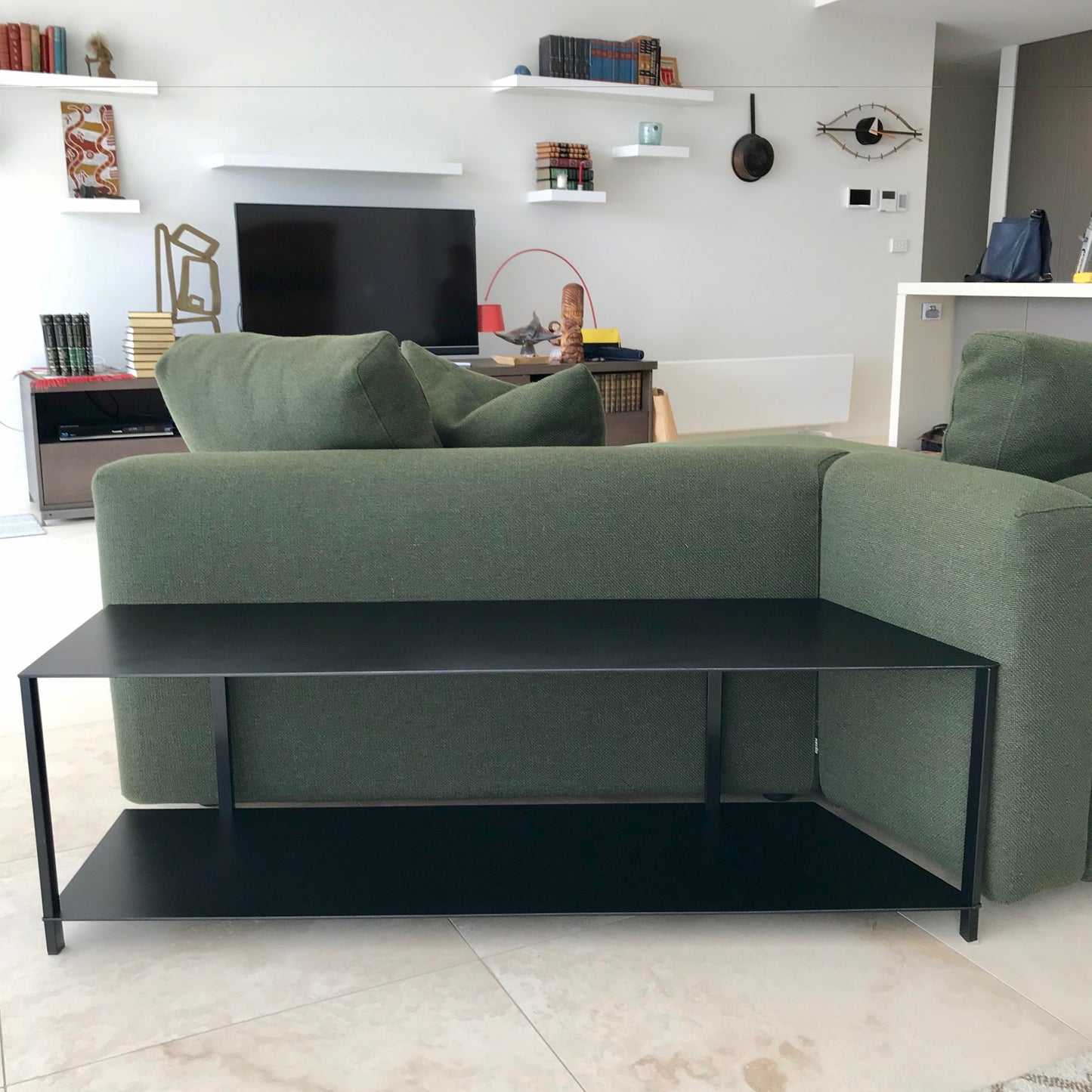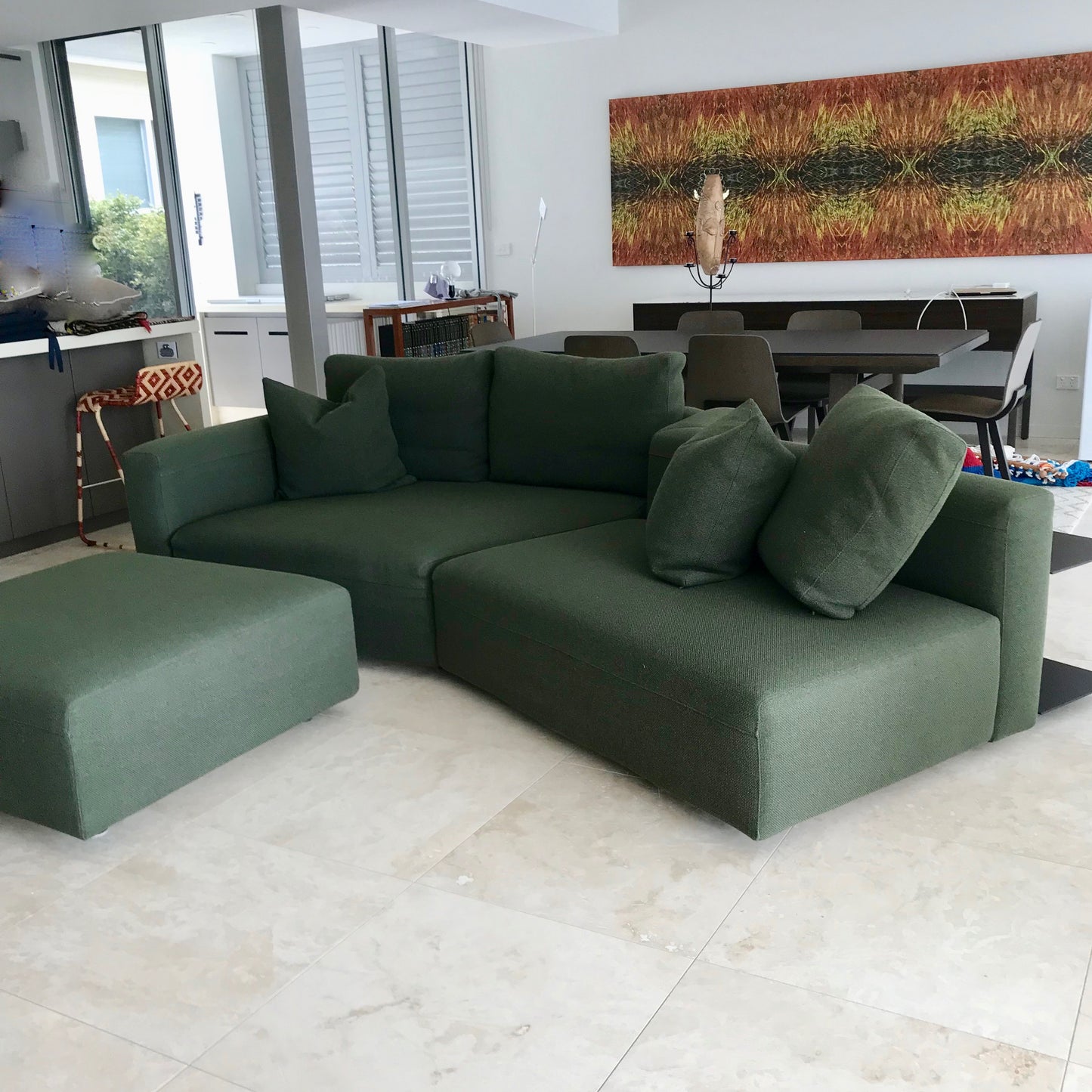 Party couch can be composed with different modules. The sofa we have on offer is made up of two pieces with an ottoman and shelving unit. The upholstery is a dark green fabric.