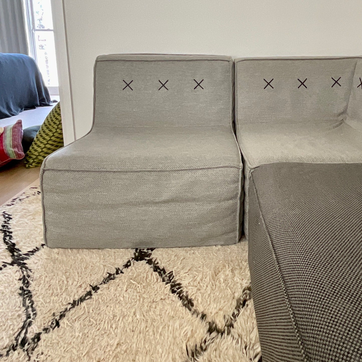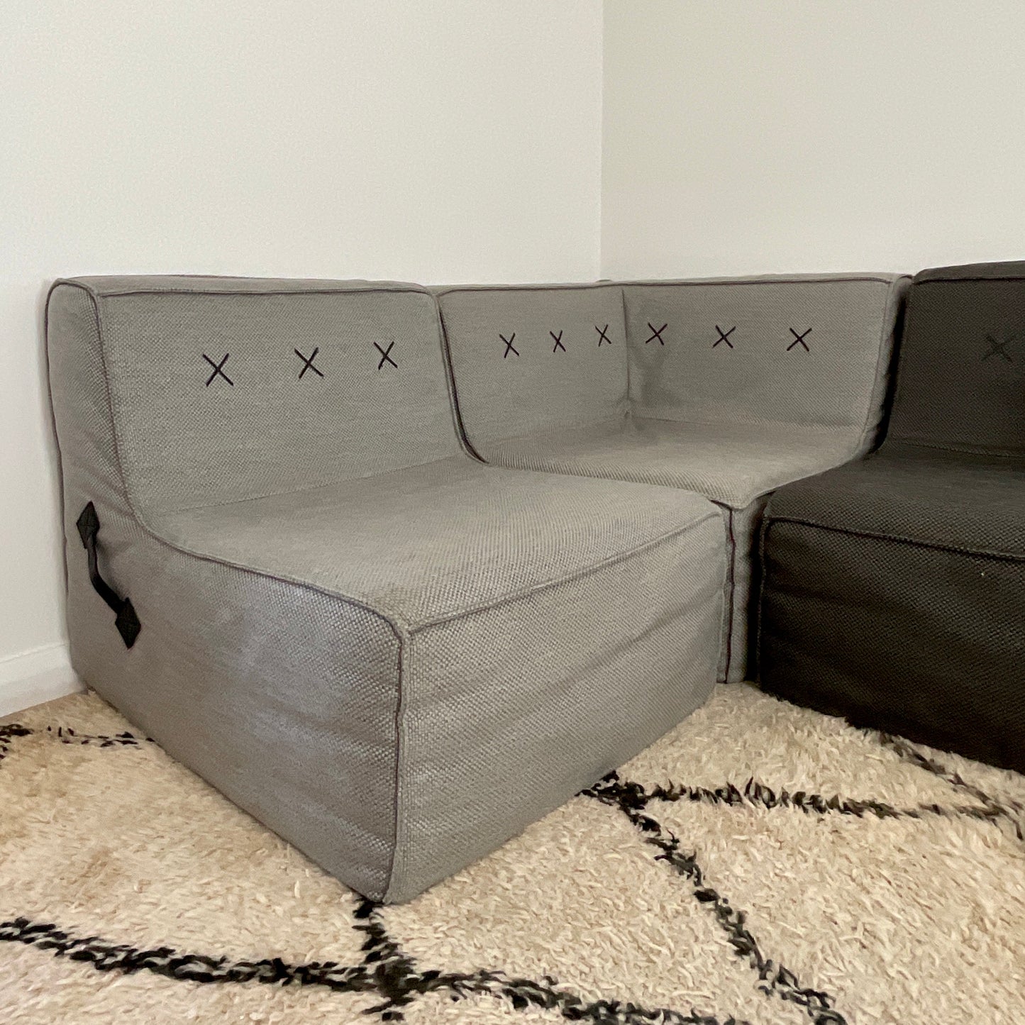 The original and the best: Quadrant Soft is the modular sofa that has been winning hearts since 2010. It comprises of different sized and shaped modules, each sold individually and made of dense foam that is lightweight and easy to manoeuvre. Your household can switch up the sofa’s configuration to suit your lifestyle – whether it’s relaxing, playing or socialising. Have fun mixing and matching fabrics to create the standout sofa of your dreams. Finishing touches include leather crosses and handles embossed with the Koskela logo. The Quadrant Sofa also comes with removable covers for ease of maintenance over the lifetime of the product. The covers can be easily zipped off for spot cleaning or dry cleaning. You can replace the covers over the years as your space changes, and inject a refreshed feel at a low financial and environmental cost. The sofa we have on offer is made up of a single seat unit, corner module and two seat unit.
