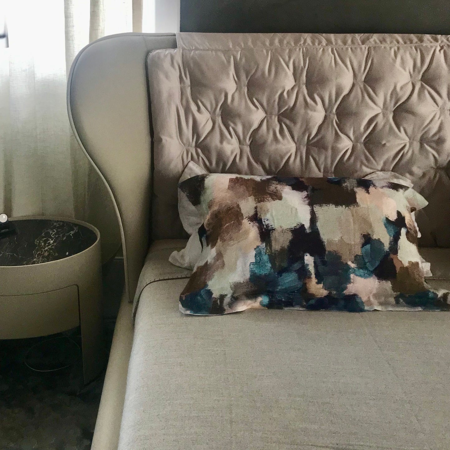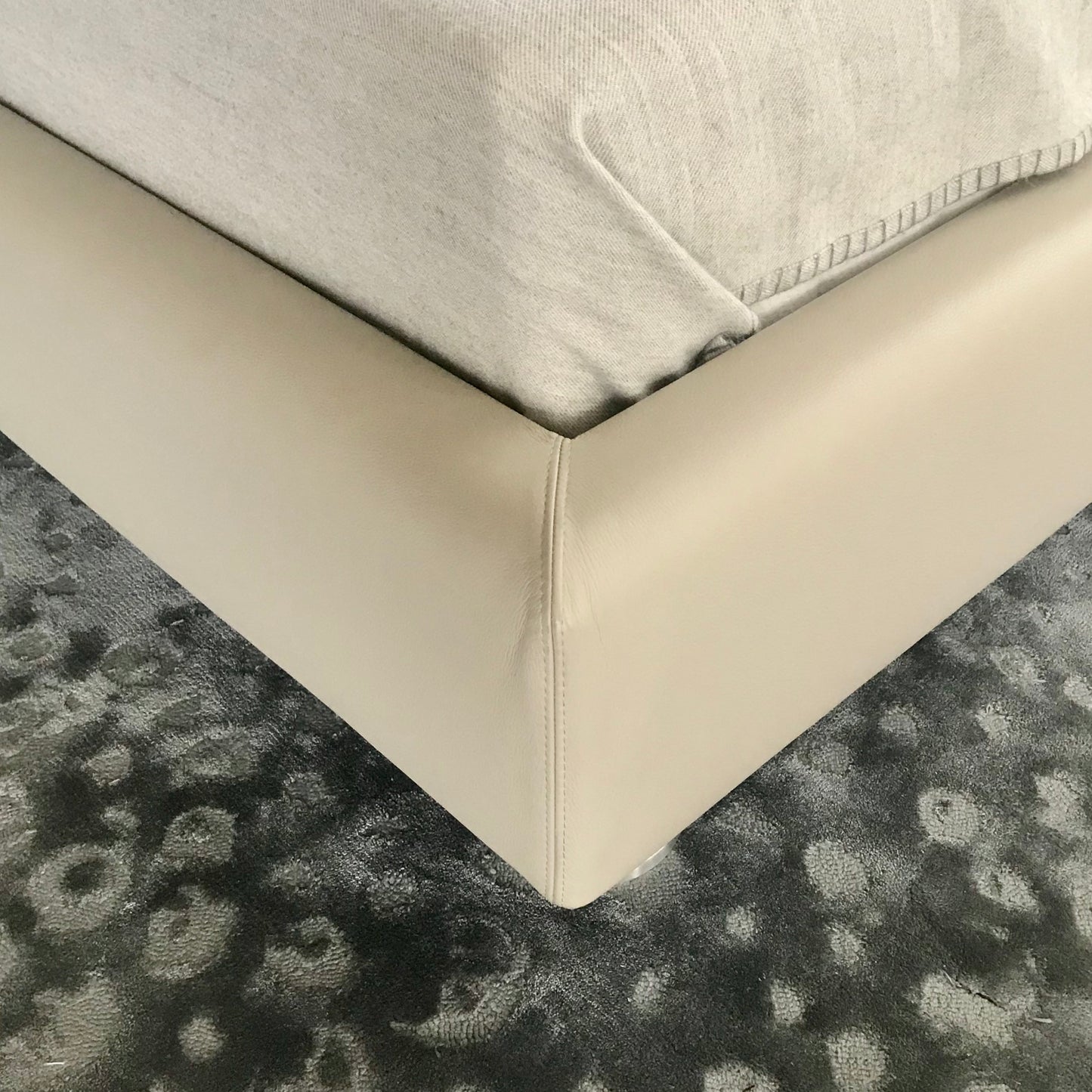 A bed with a ‘winged’ shape that is a precious rest. Winner of the Wallpaper* Design Award for the "Best Bed 2005" category, the Rea bed is far from the cold minimalist lines and gives comfort thanks to its soft elegance. A series of double beds with the headboard frame in rigid compact polyurethane, cold-foam flexible polyurethane and poplar plywood. The bed slat base, is in ultralight planked wood covered with fibre and corner reinforcements in painted metal. The slat base supports are adjustable and the central crossbar is in painted metal. The feet are in solid pau ferro and metal. For the headboards, a fibre quilt is available on demand. The completely removable upholstery is in fabric or leather. The bed we have on offer has a leather colour with additional Quilt cover that sits over the headboard for added luxury. The bed comes with a mattress by Poliform