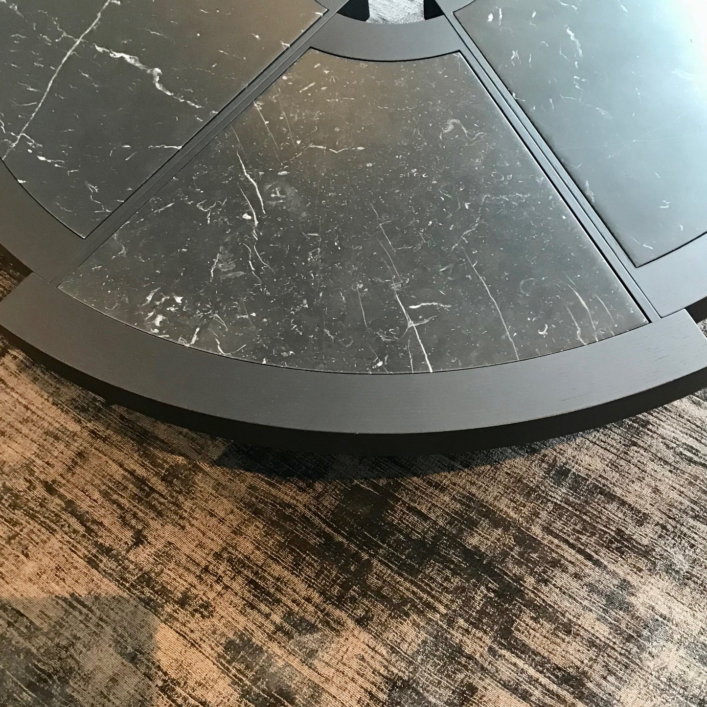 The 529 Rio Coffee Table is a round side table constructed from six wedge sections of varying radiuses, set out of alignment alongside each other with an outside edge of solid natural oak or open-pored black-stained oak. The six non-aligned sections, forming the table top with a hole in the centre, are available in three different finishes: rattan with natural oak edges, white Carrara marble with natural oak edges and black Marquina marble with open-pored black stained oak edges. Six legs in the same finishes as the edges form the base of the side table. The table we have on offer is in oak stained black with marquina marble.
