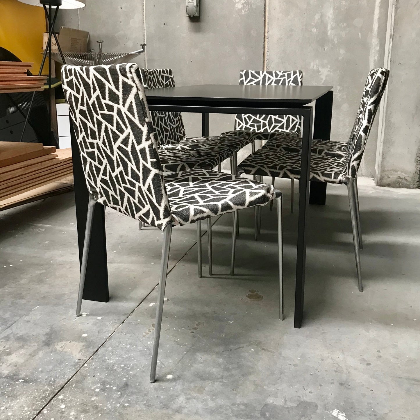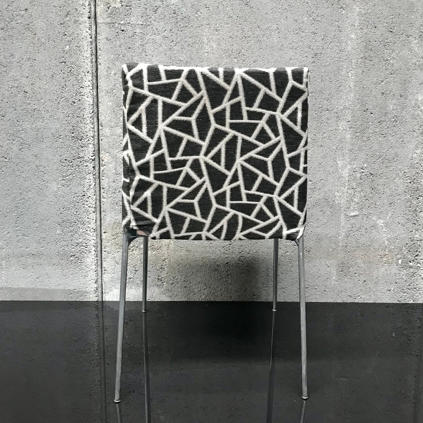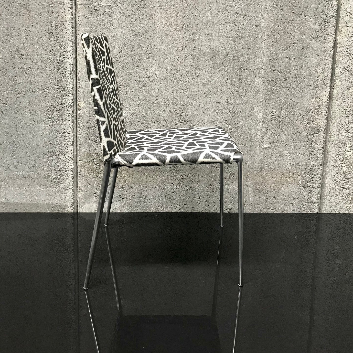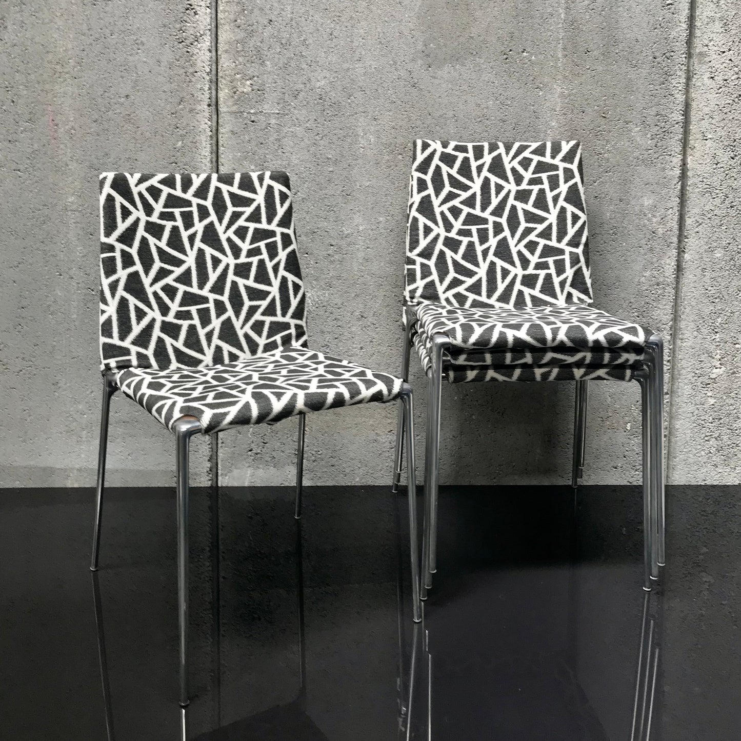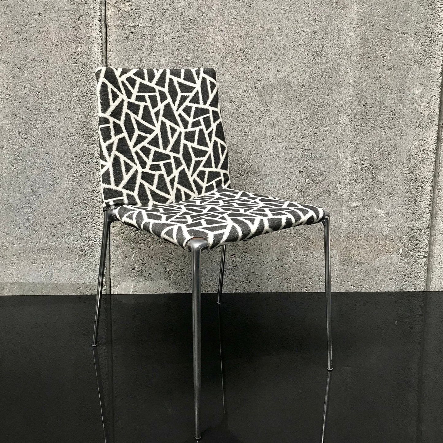 With its light and nimble look, Alma is a new chair for highly flexible use, designed for both home and contract use, also thanks to good stackability. The chairs we have on offer feature an aluminium frame, and seat and backrest with removable fabric covers in a abstract charcoal and white pattern.