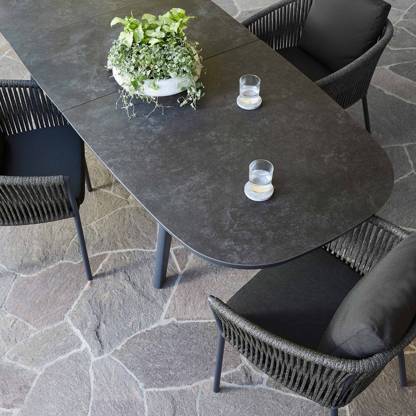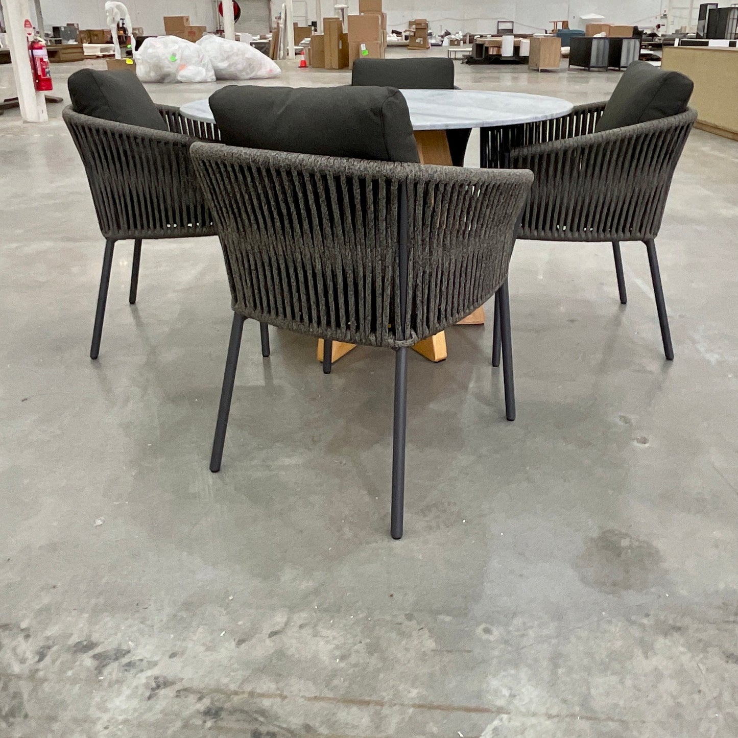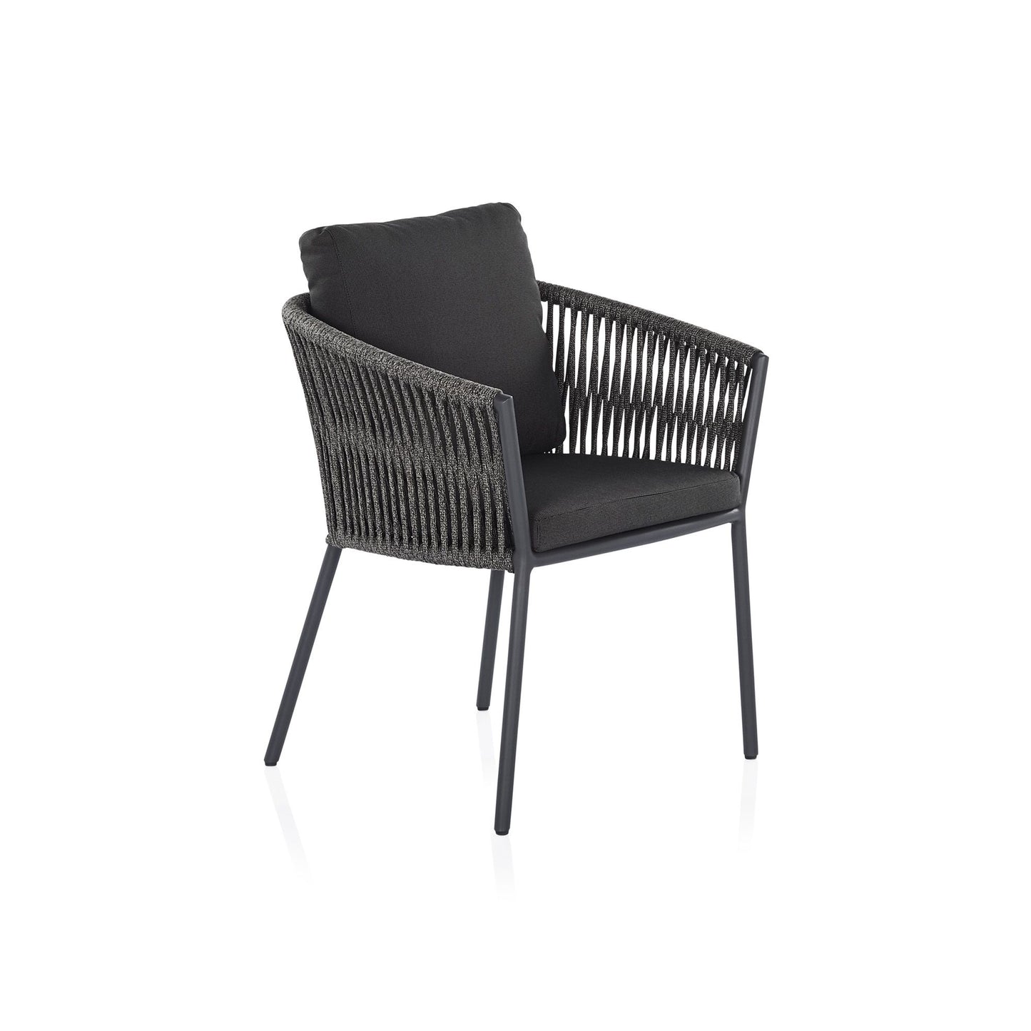 Chic and durable meet in the Catalina Outdoor Dining Chair by Coco Republic. This charming dining armchair features a dual persona crafted from rope set atop a four-legged aluminum base with a durable powder coat finish. A cushion with foam insert is covered in weather-proof fabric. Place two or four of these chairs around a round dining table for an intimate dining spot in the kitchen or dining room.
