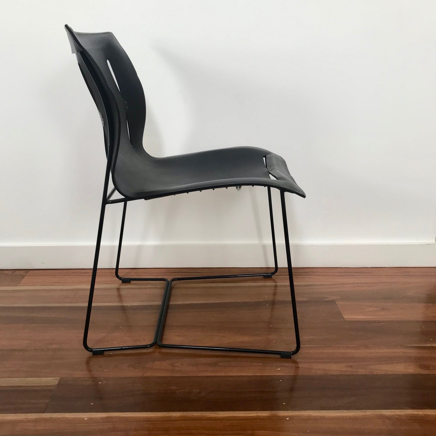 The logic of minimalism determines the shape and materials of the Cuoio Chair. Leather and steel are the components of surface and framework. Minimalist and timeless. Cuoio is the archetypal chair. Its slits in the back are its secret. They give shape, comfort and set visual accents. The Cuoio Chair comes both with and without armrests, entirely in black. The chairs we have on offer are armless in black saddle leather.