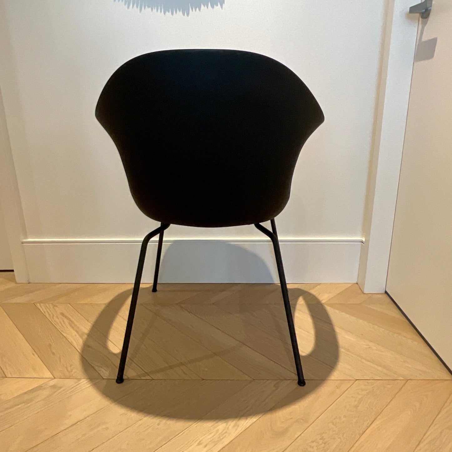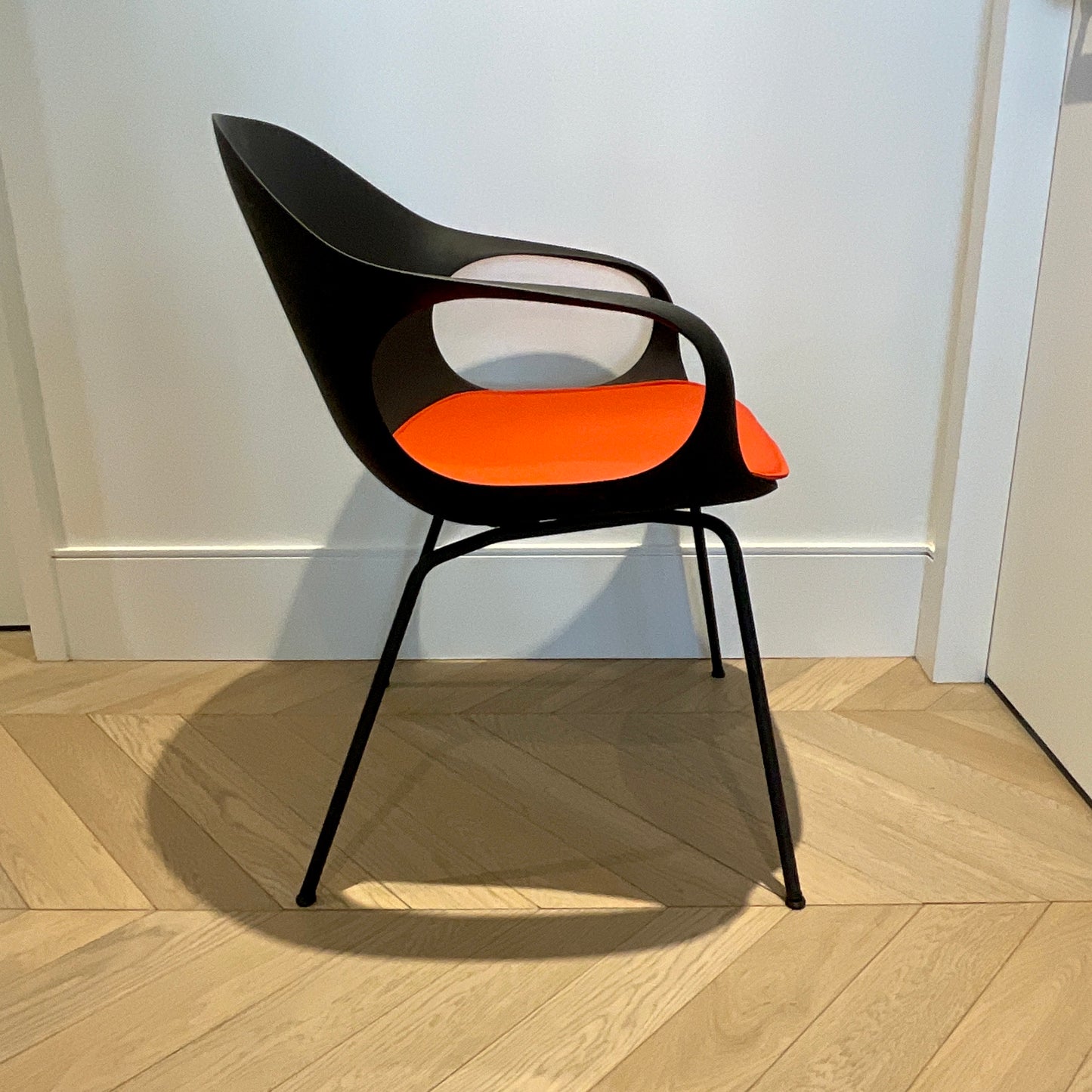 Italian made and design. The Elephant Slide dining chair is a new addition to the Elephant collection of green space chairs. The Elephant Sled has the same wide, all-embracing structure as the rest of the collection, the seat made in the hard polyurethane. The chairs we have on offer are in black with an orange seat pad.