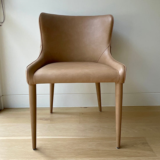 Curvy contemporary dining chair with sculpted shape and waterfall seat. The chairs we have on offer are in tan vegan leather.