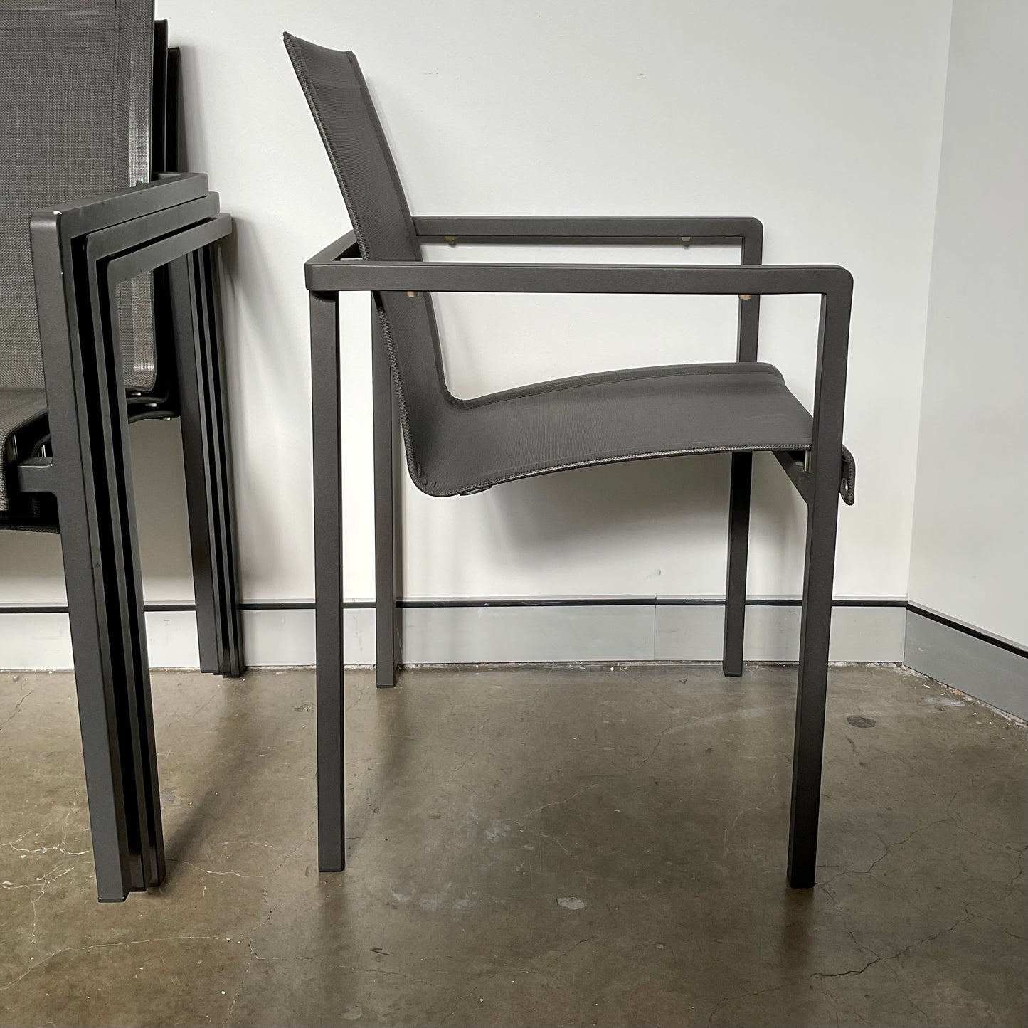 A striking angular frame with a curved seat that seems to float. The Natal Alu outdoor chair combines functionality with impeccable class and strong charisma. The rounded corners on the armrests soften this stackable armchair design. The materials are both easy to maintain and weather-resistant. The chairs we have on offer are in grey.