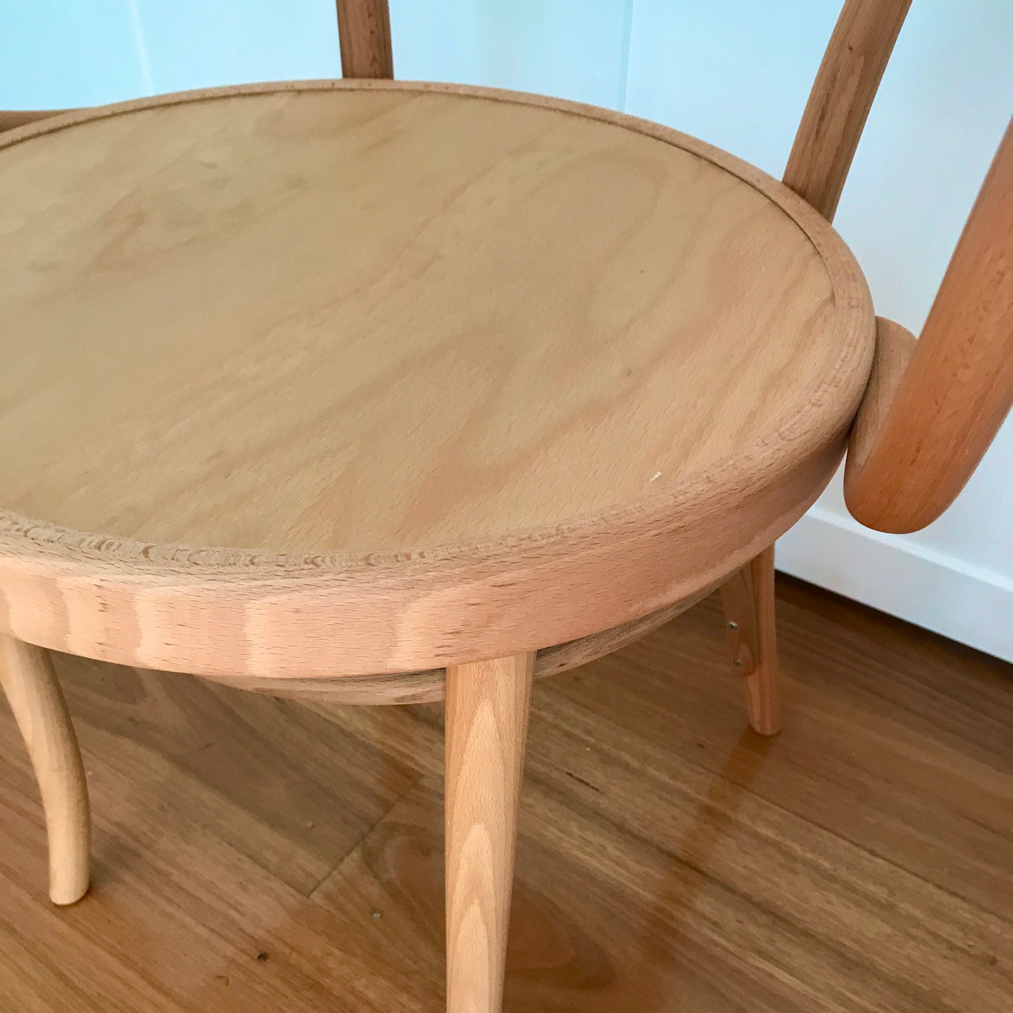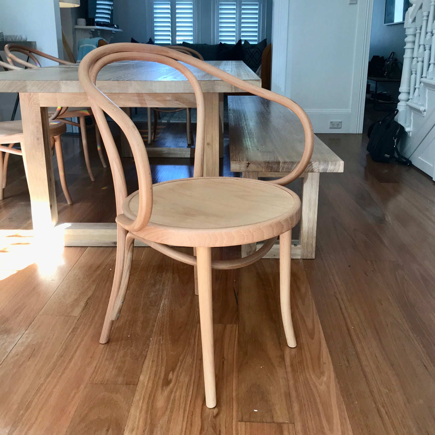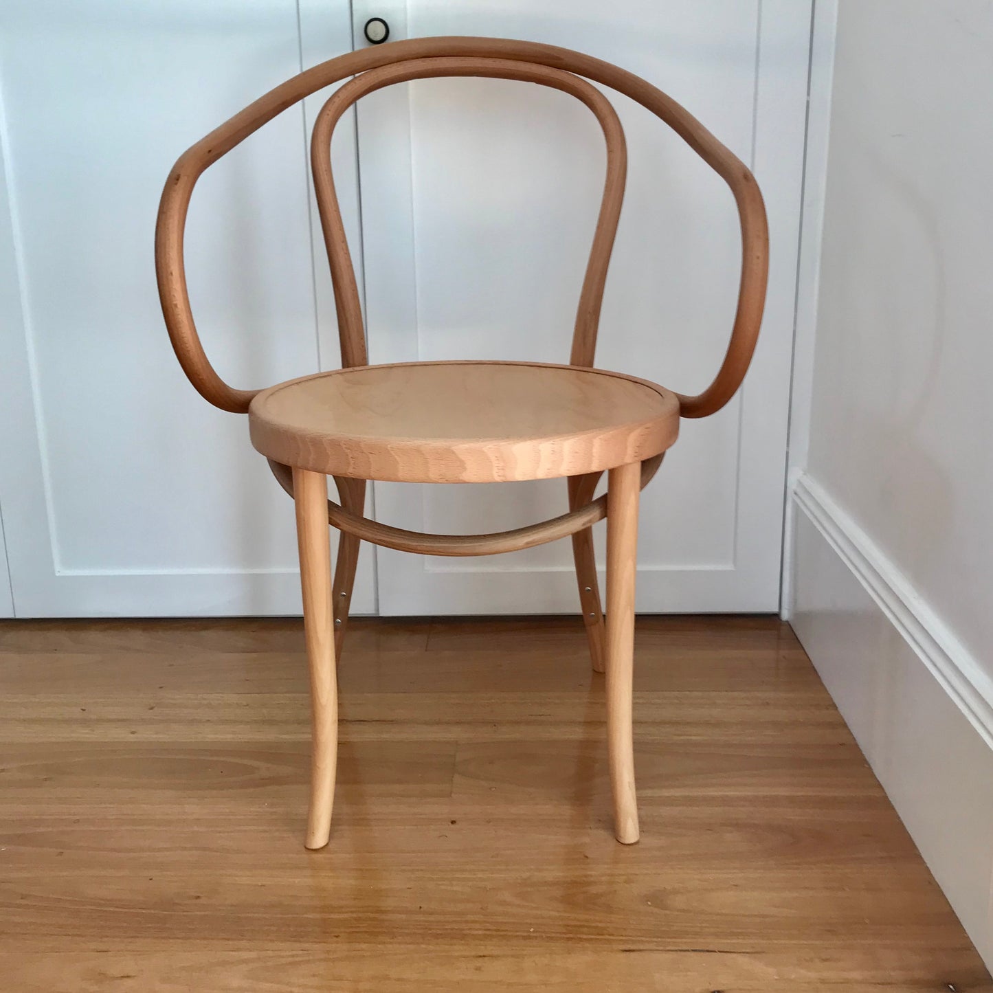 This classic bentwood armchair was widely used by the French Modernist architect Le Corbusier during the mis 1920's. The chairs we have on offer are in Golden Oak with Beech Seat.