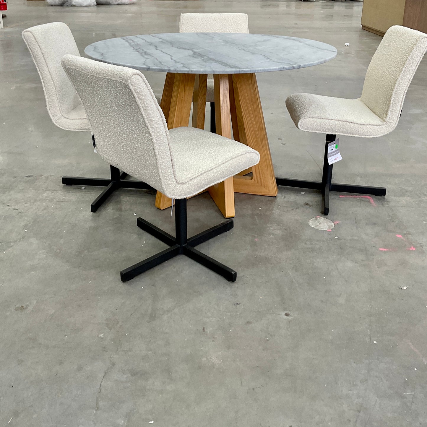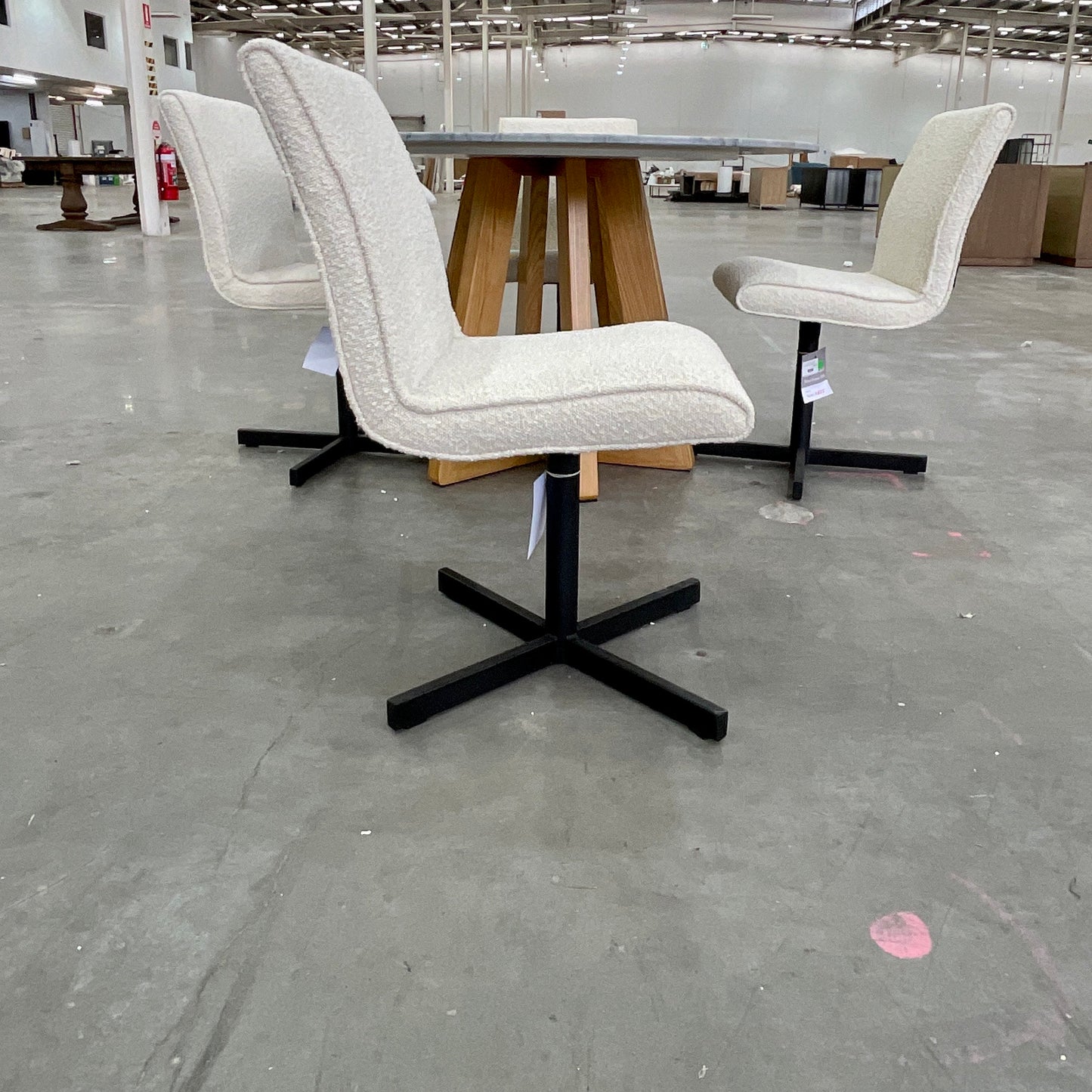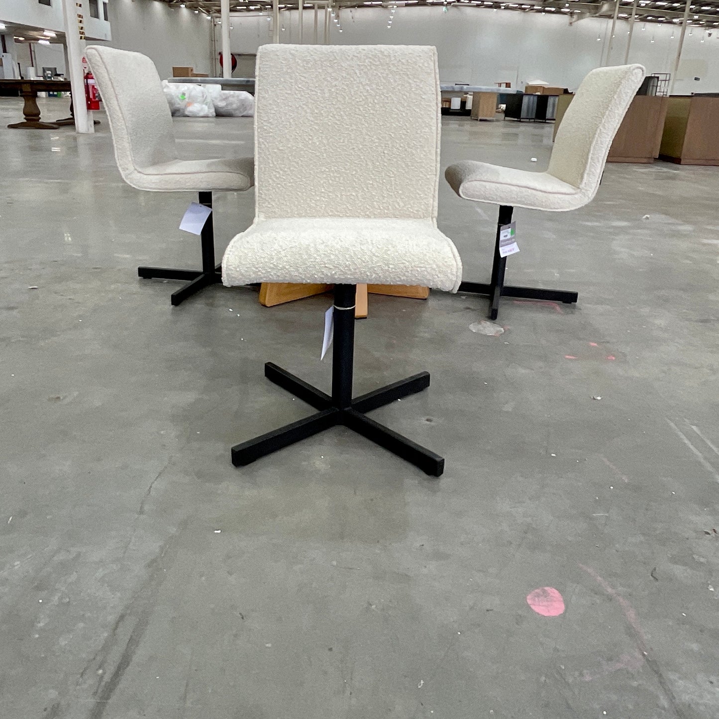 The Tala swivel chair features minimalist contemporary lines offset by a functional powder-coated stainless steel swivel base. This shape is a comfortable modern classic that ensures you work or dine comfortably for hours on end. The chairs we have on offer have a black base with a Cream Boucle upholstered seat.