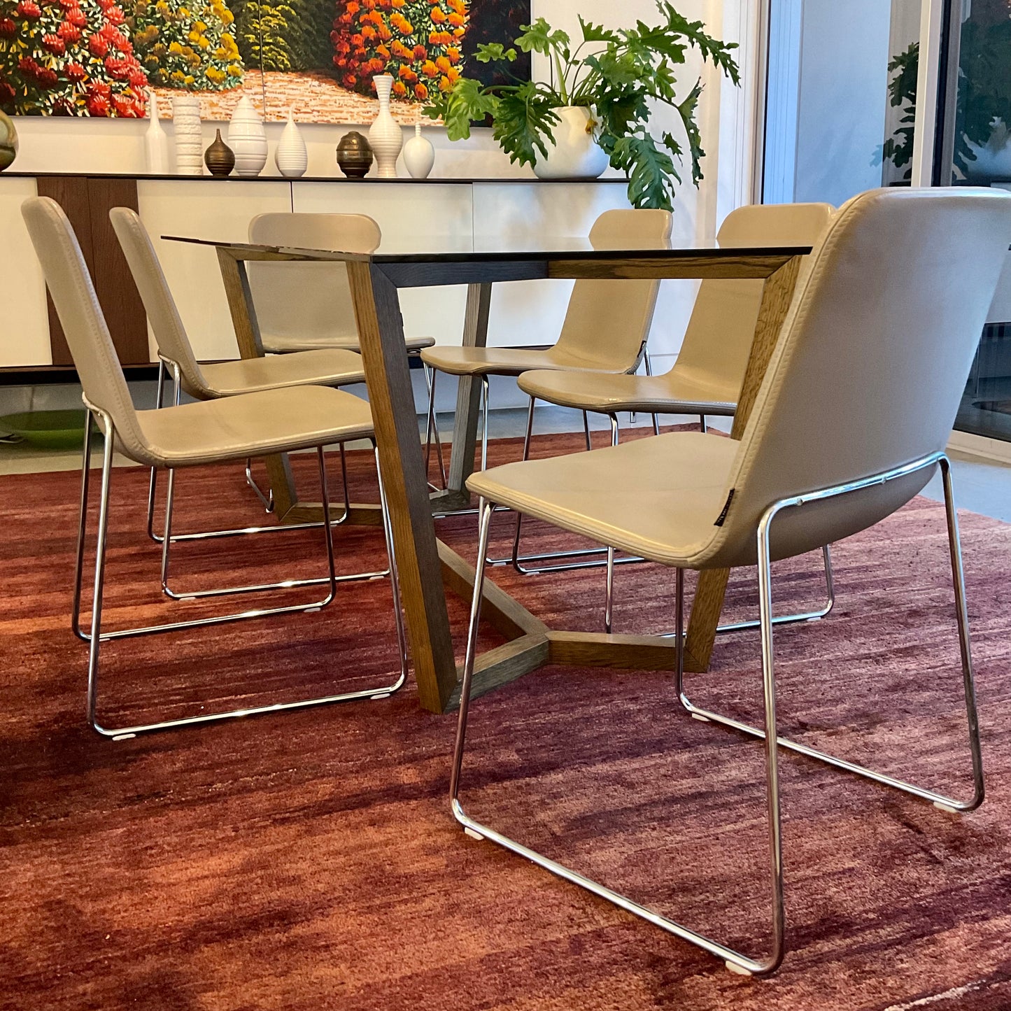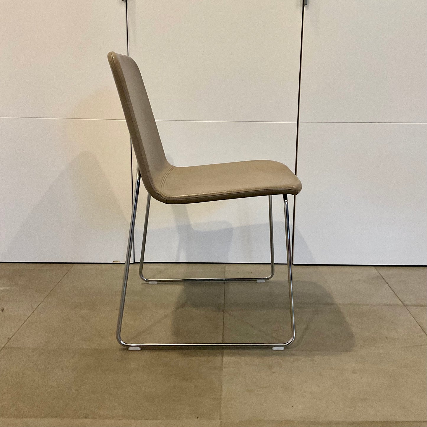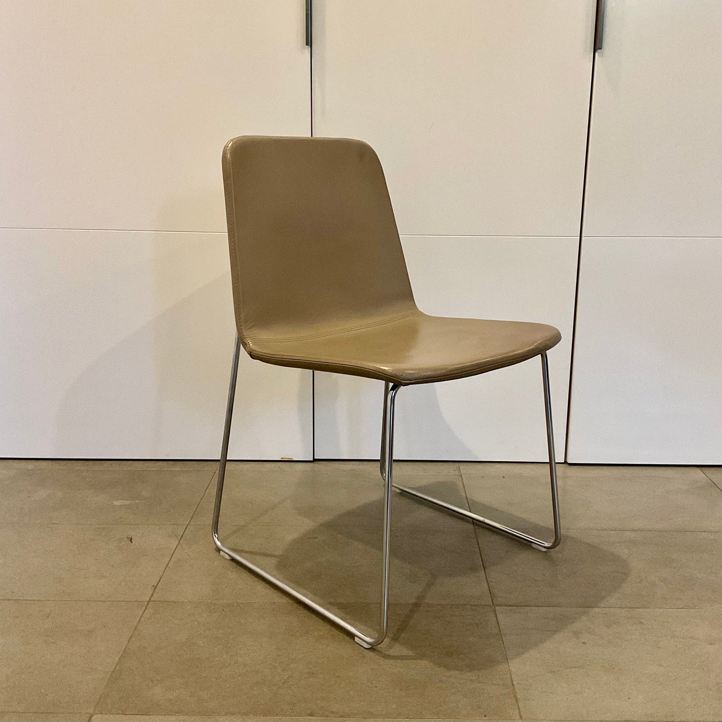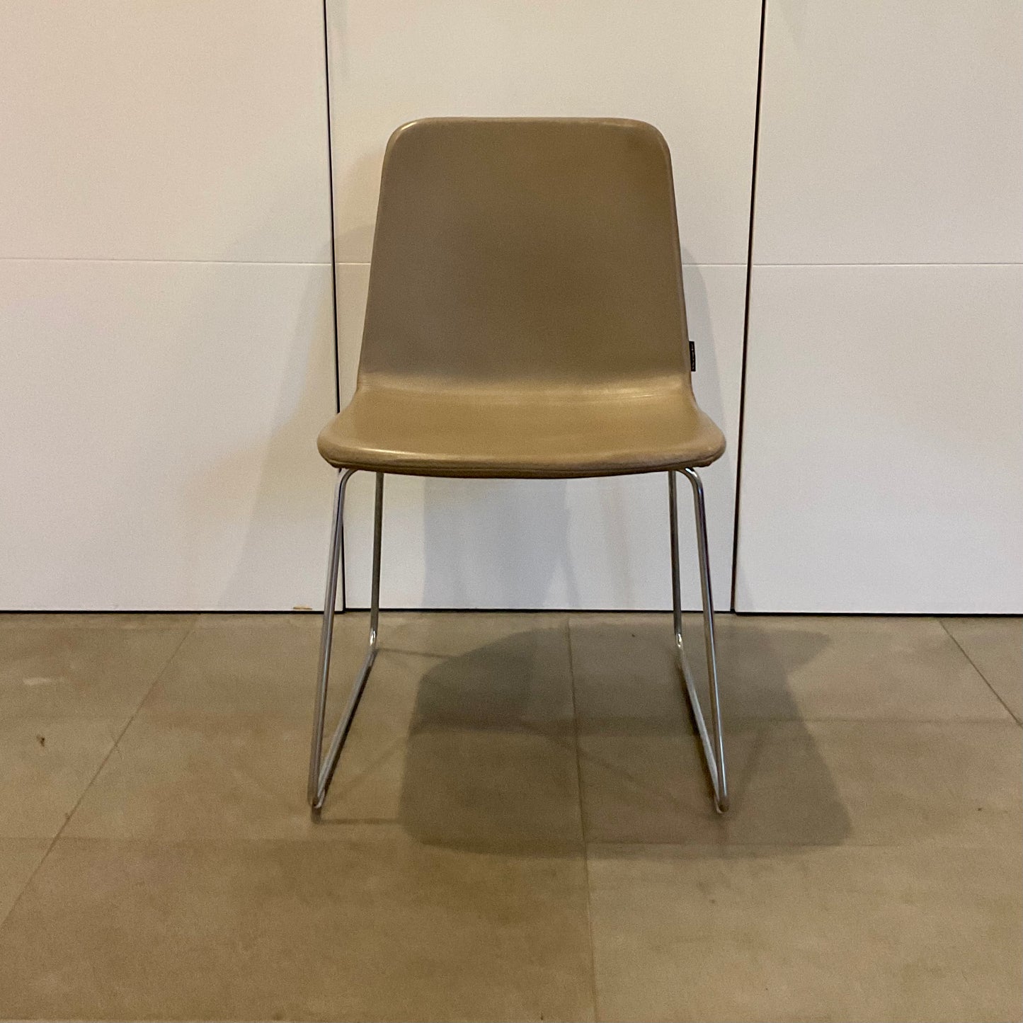 The Layer chair we have on offer has a polished chrome sled base. The chair is upholstered in Cosmopolitan Allegro Leather. Viccarbe collection shows the value and references for a contemporary style of living, with a wide range products for comfortable living. It is distinguished by great simplicity, innovate elegance and global brand awareness. Also, it can relate to the user thanks to its natural integration into different surroundings. This collection is ideal for people who live in the present and think of the future.