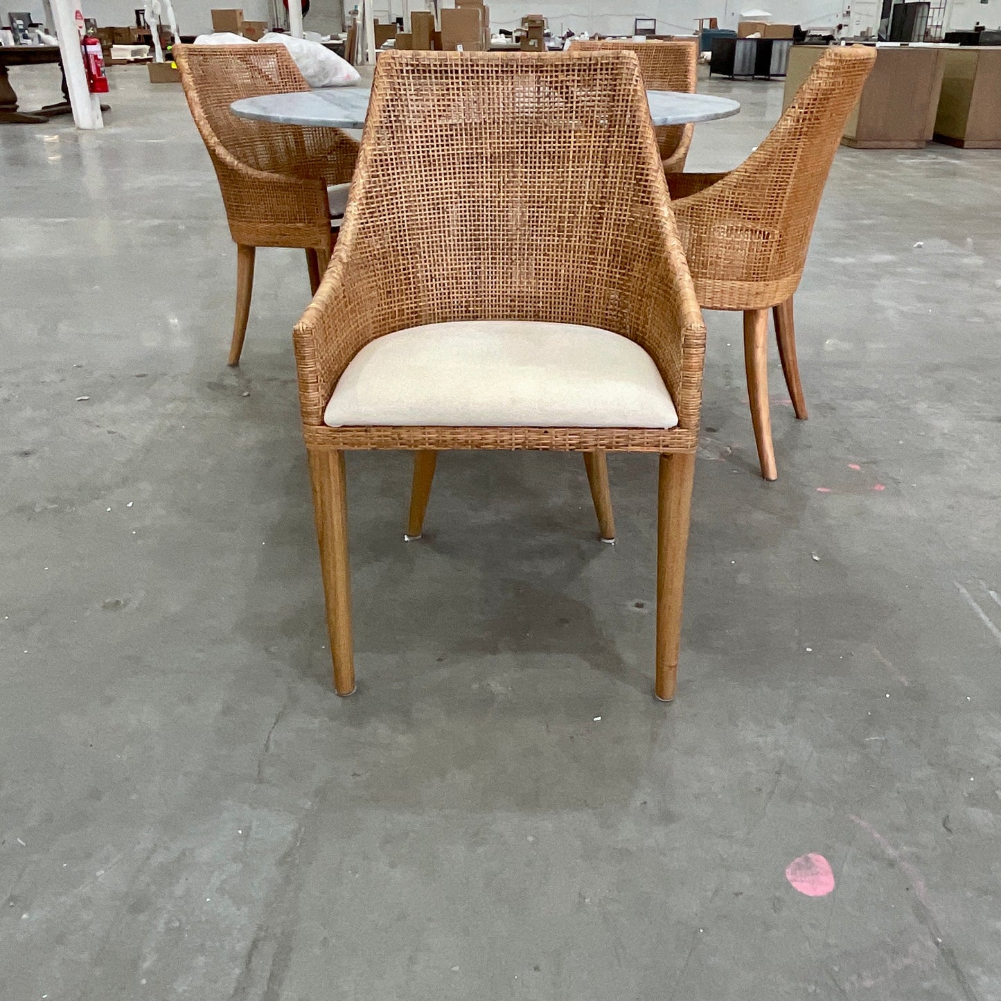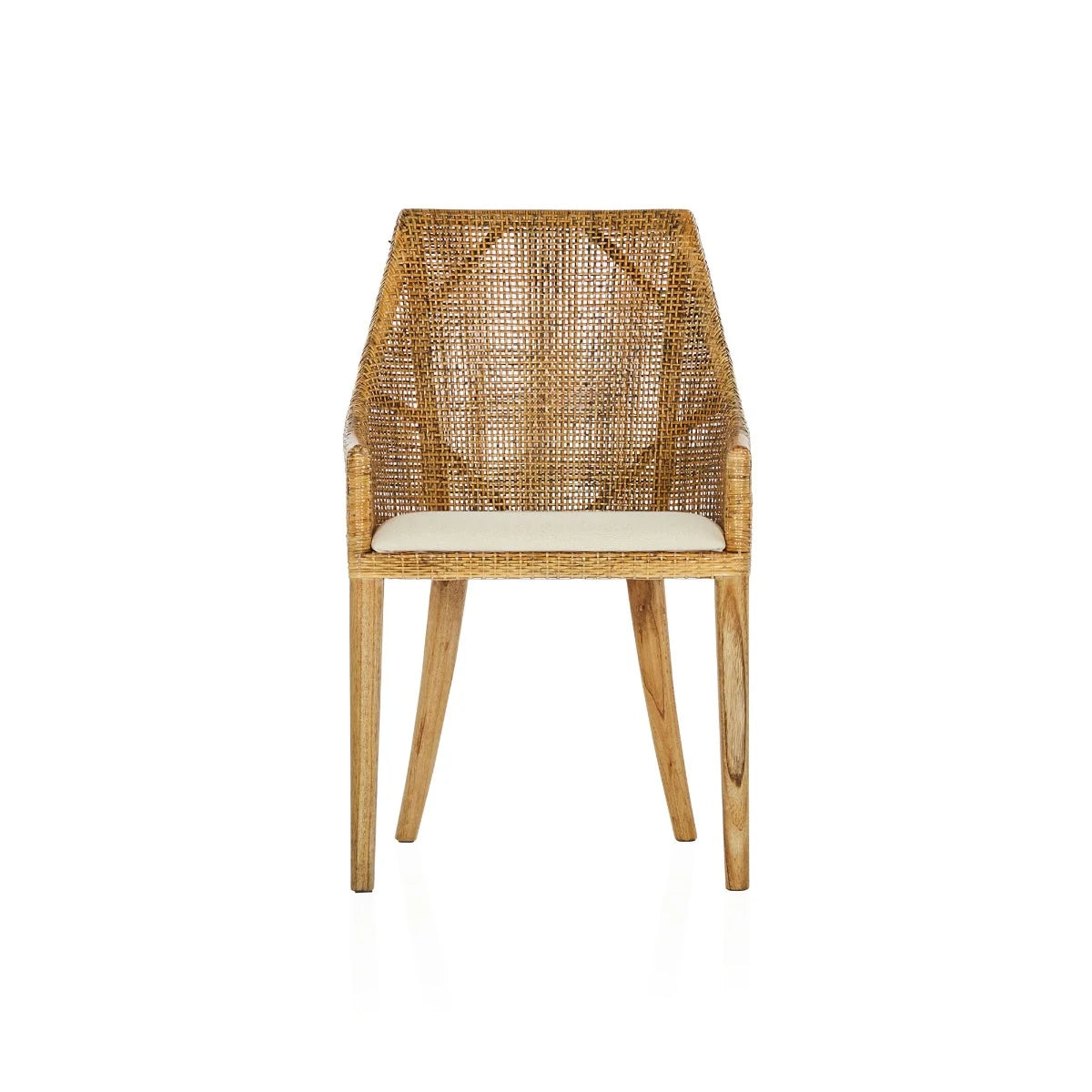 Classic dining chair with hand-woven rattan and upholstered seat. The chairs we have on offer have a natural frame with off white fabric seat.