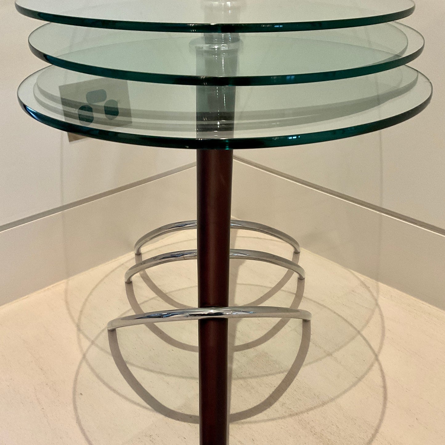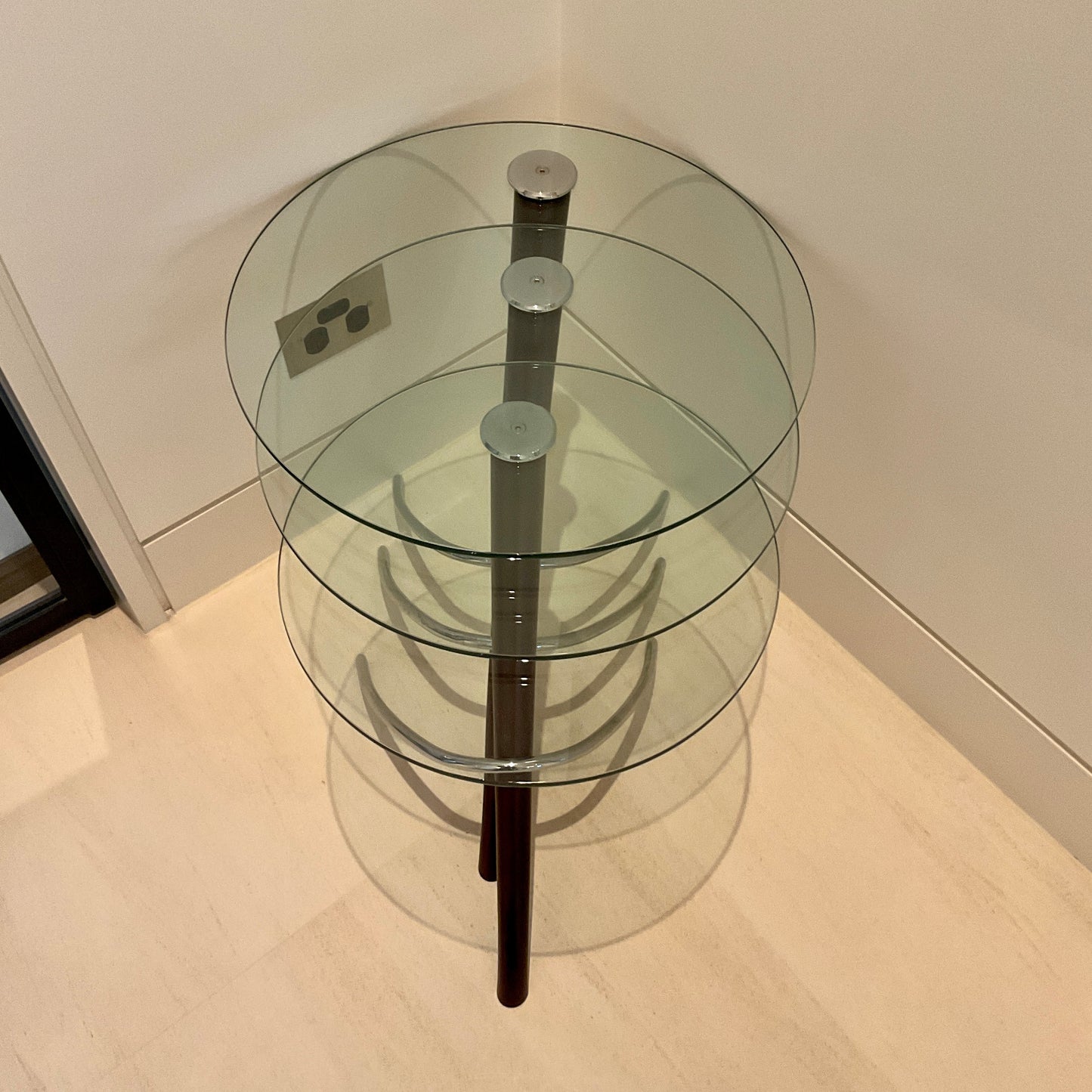 The set of three nesting tables we have on offer have a round clear glass top with a wenge base.