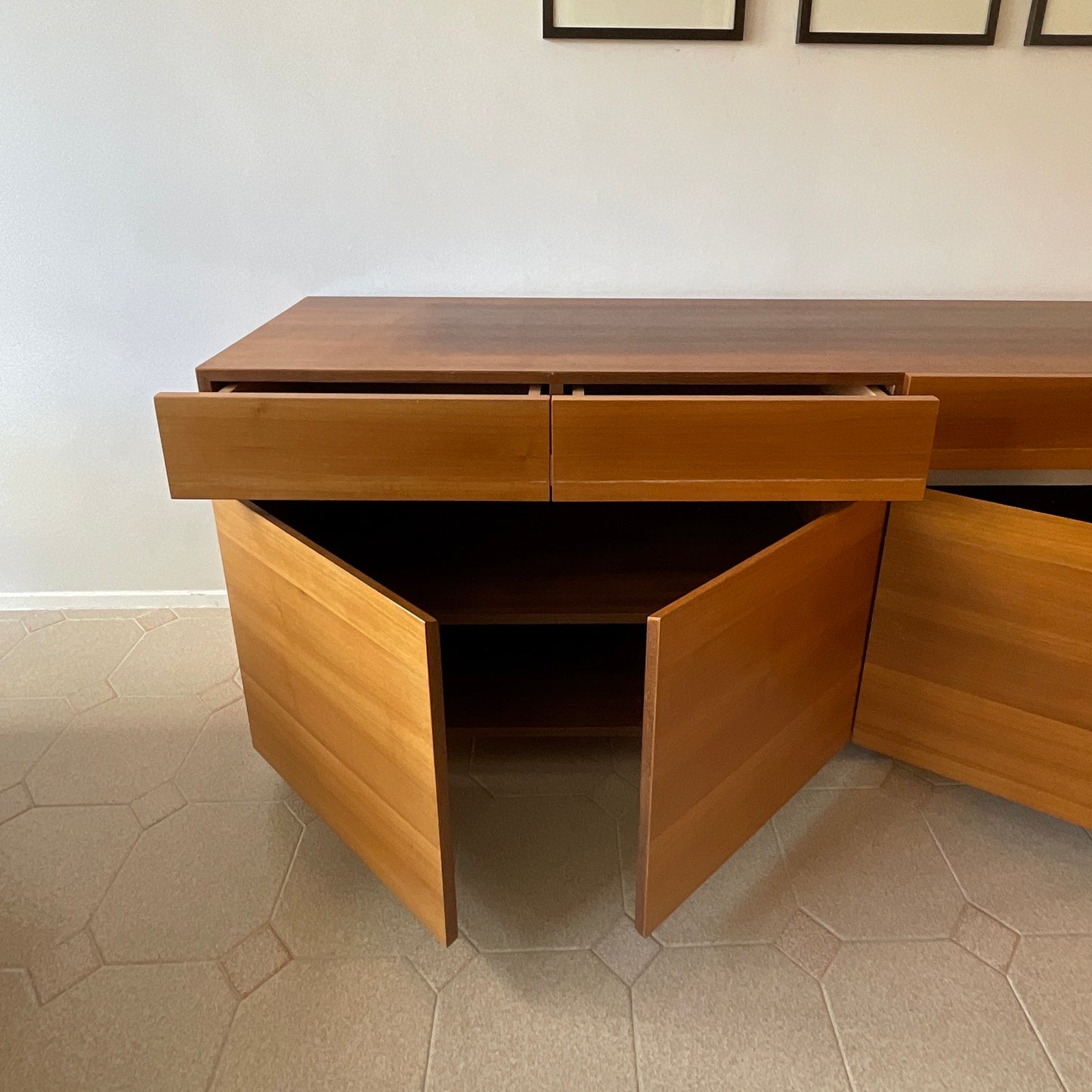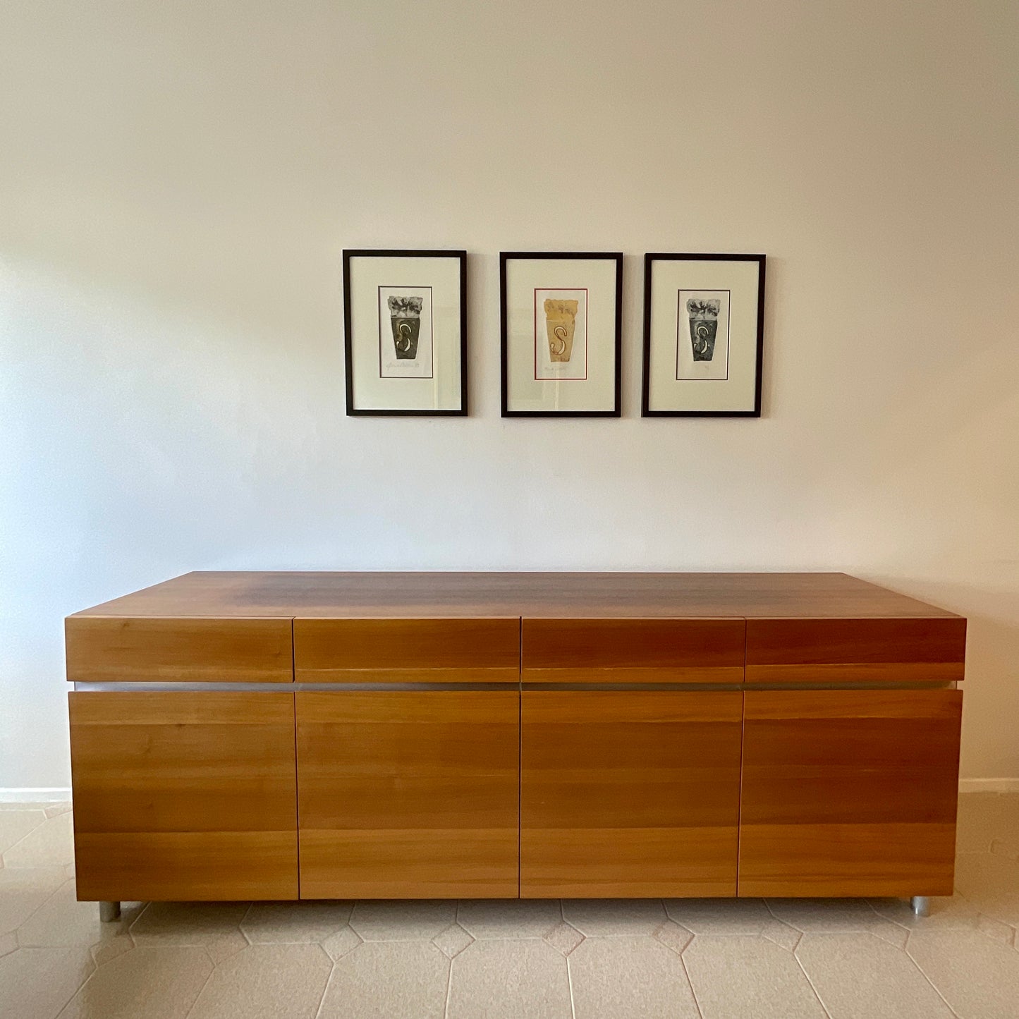 This simply styled sideboard by Fanuli has two separated lower cabinets with an adjustable shelf each and four pullout drawers above. The cabinet has a walnut finish with metal trim.