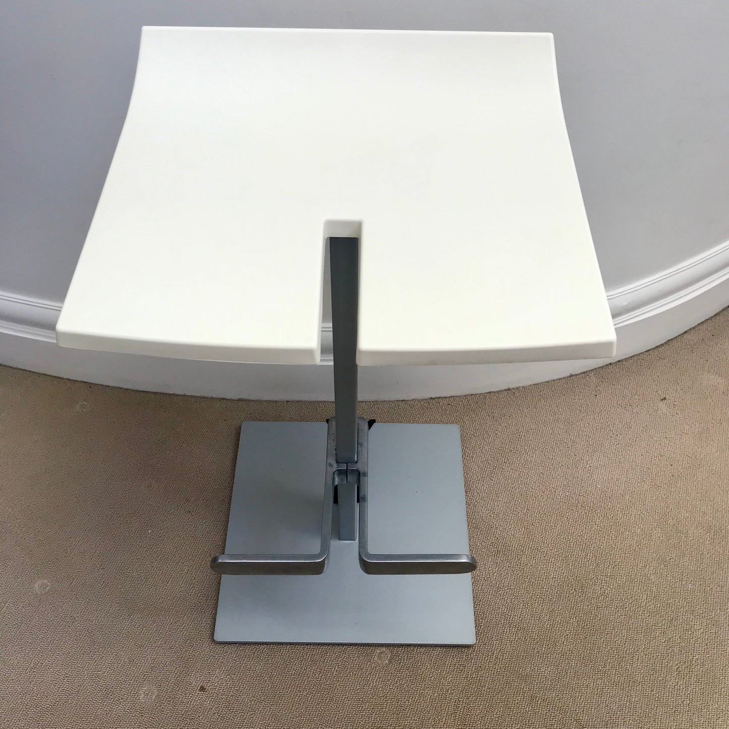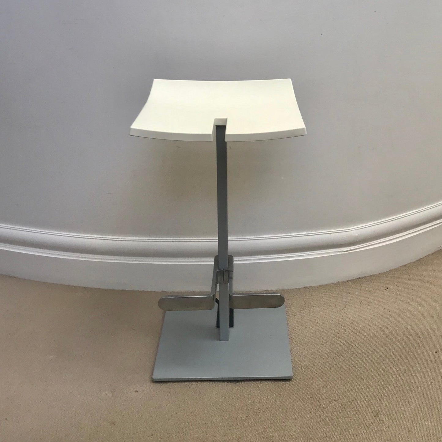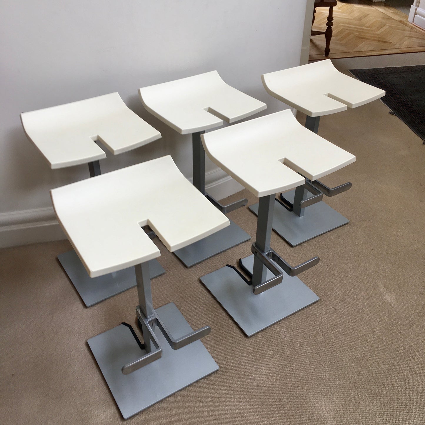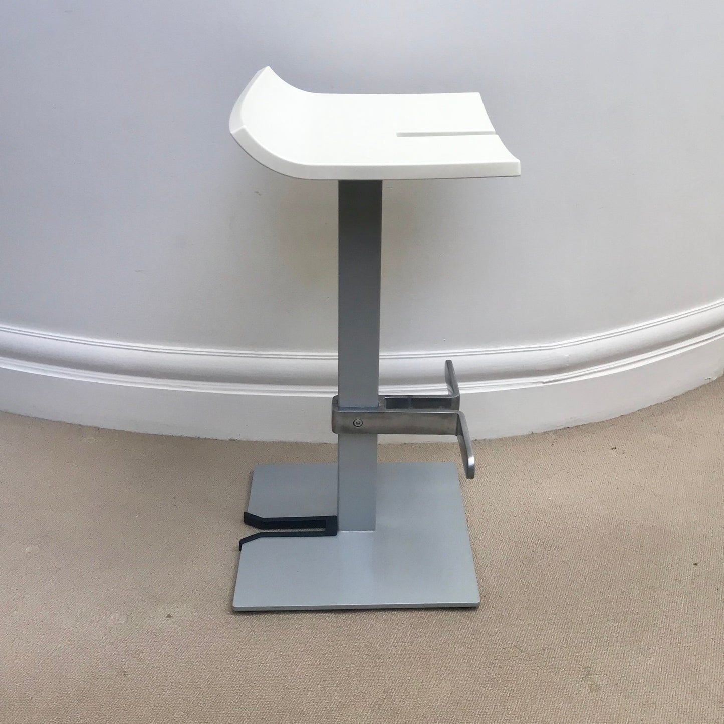 Stacky produced by ENEA and designed by Josep LLuscà. A complete range of stools specially designed for installing and folding away, thanks to their various dimensions and innovative folding system. The materials used (polypropylene, lacquered aluminium and injected aluminium) mean that the product stands up to even the most demanding situations, and meets the strict legislation applicable to the sector. A stool designed for both public and private spaces. Its innovative design makes it stackable for storage and transportation. The stools we have on offer are in white.