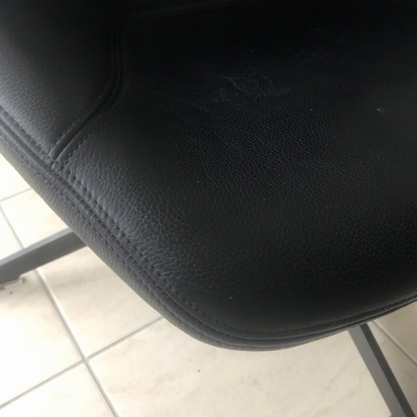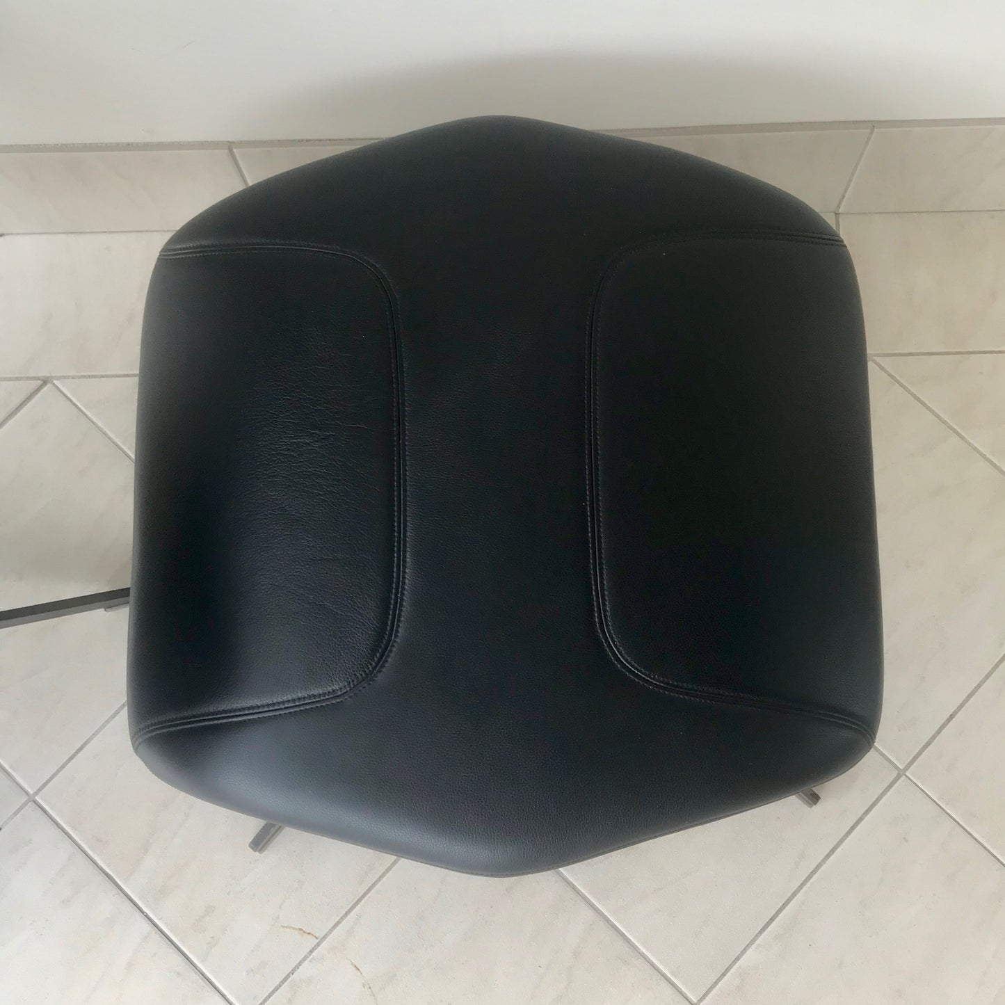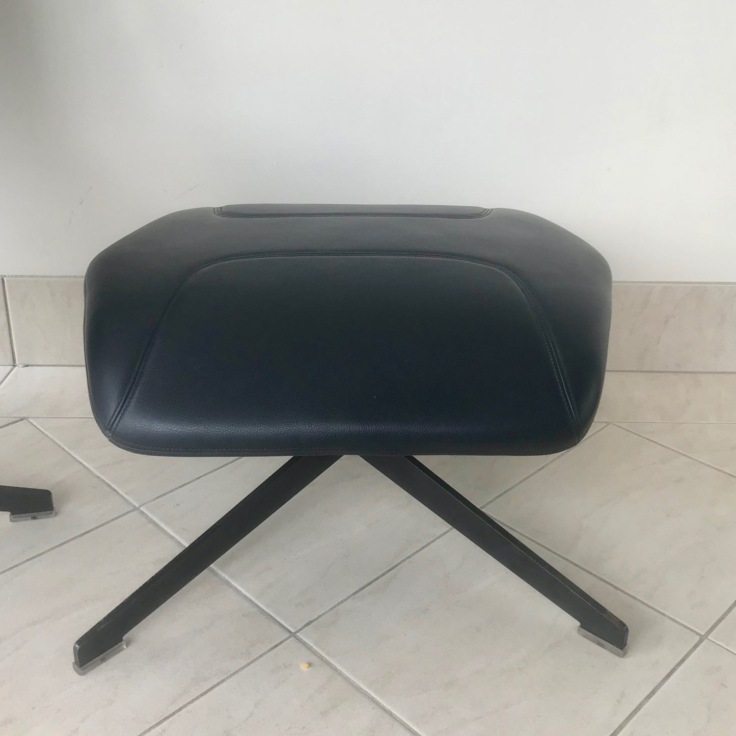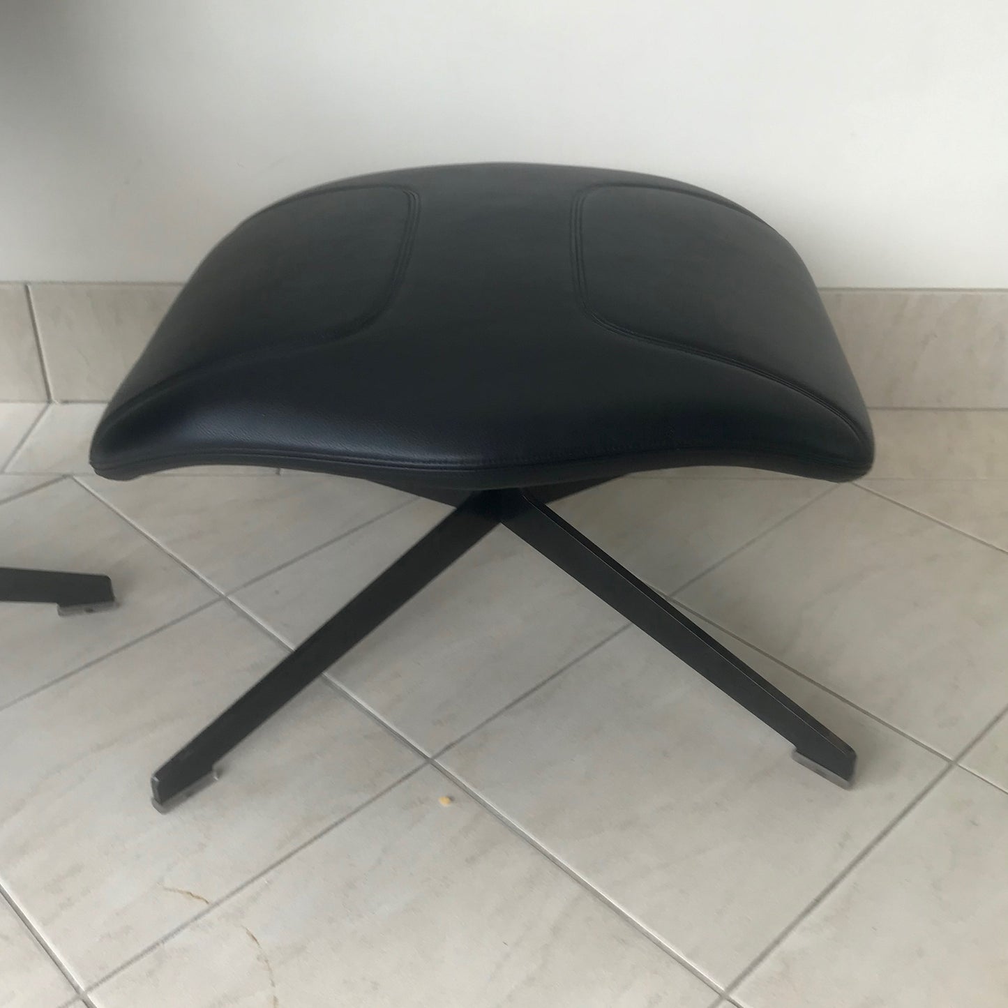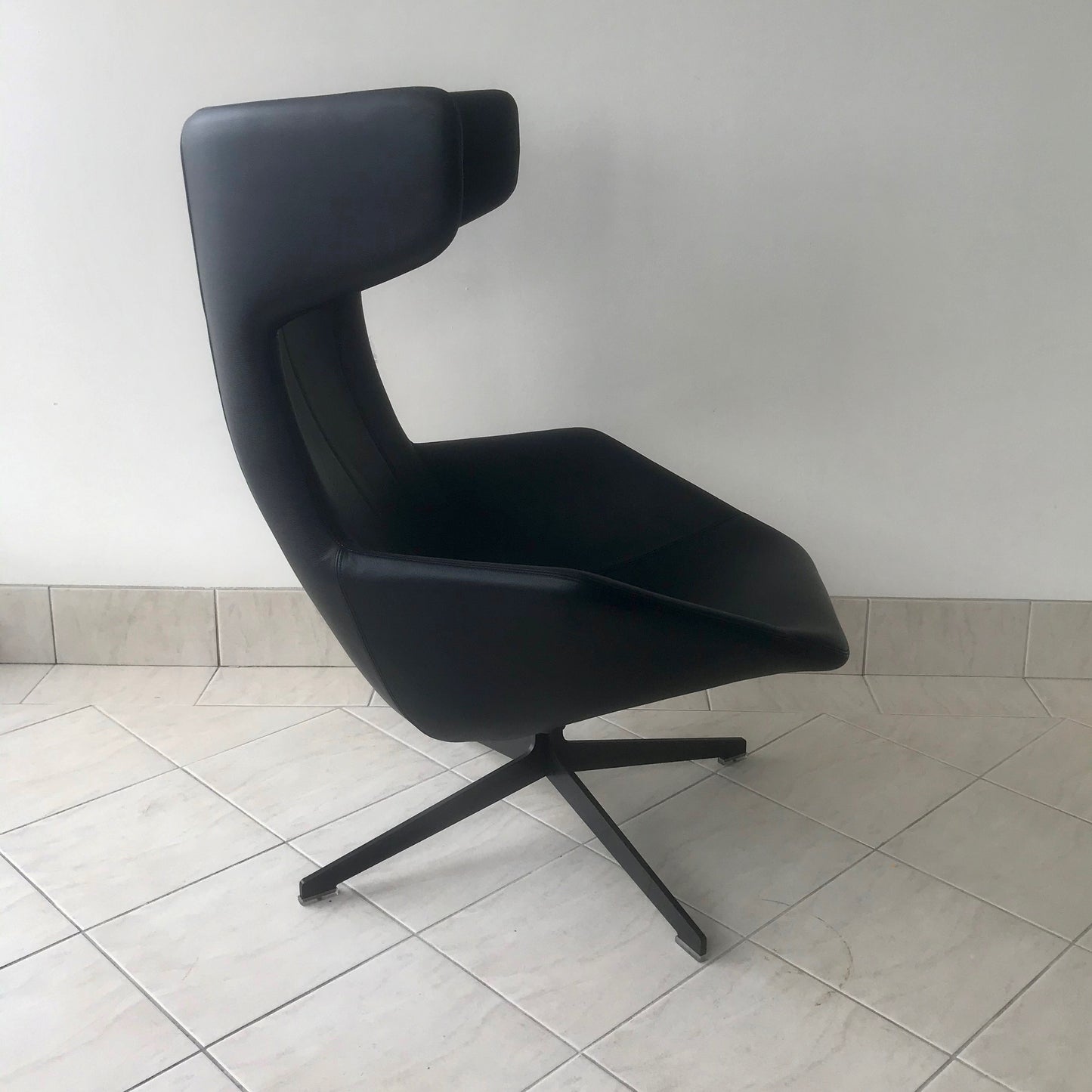 Take A Line For Walk is a collection which comprises an armchair, a sofa and an ottoman. It draws on an archaic yet extremely modern visual force which recalls the idea of a cocooning, motherly comfort; its big ears can be wrapped around the head in search of protection or isolation from the surrounding environment. It is made of a steel frame covered with flame-retardant polyurethane foam and a varnished swivel base. The collection covers are not removable. The chair and footstool we have on offer has a rifle brown swivel base and upholstered in Nero Pelle.