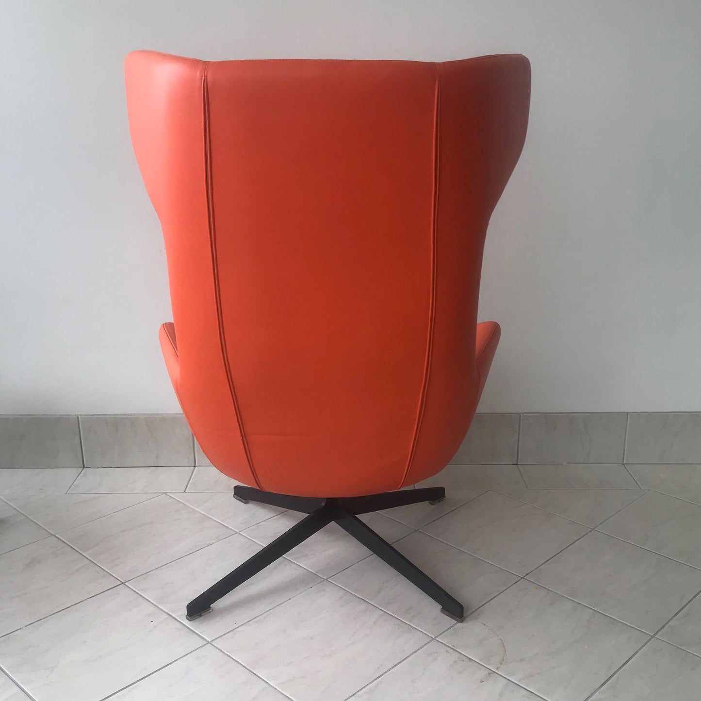 Take A Line For Walk is a collection which comprises an armchair, a sofa and an ottoman. It draws on an archaic yet extremely modern visual force which recalls the idea of a cocooning, motherly comfort; its big ears can be wrapped around the head in search of protection or isolation from the surrounding environment. It is made of a steel frame covered with flame-retardant polyurethane foam and a varnished swivel base. The collection covers are not removable. The chair and footstool we have on offer has a rifle brown swivel base and upholstered in Orange Pelle.