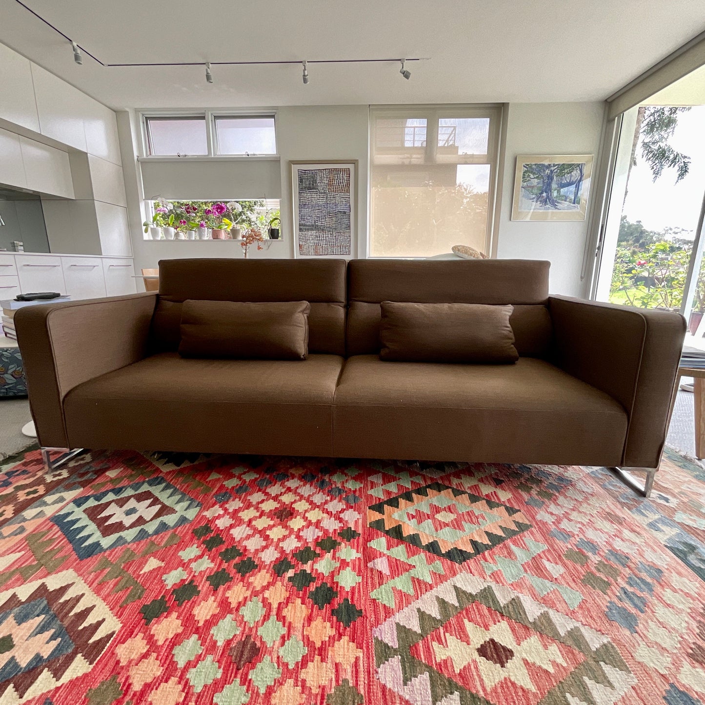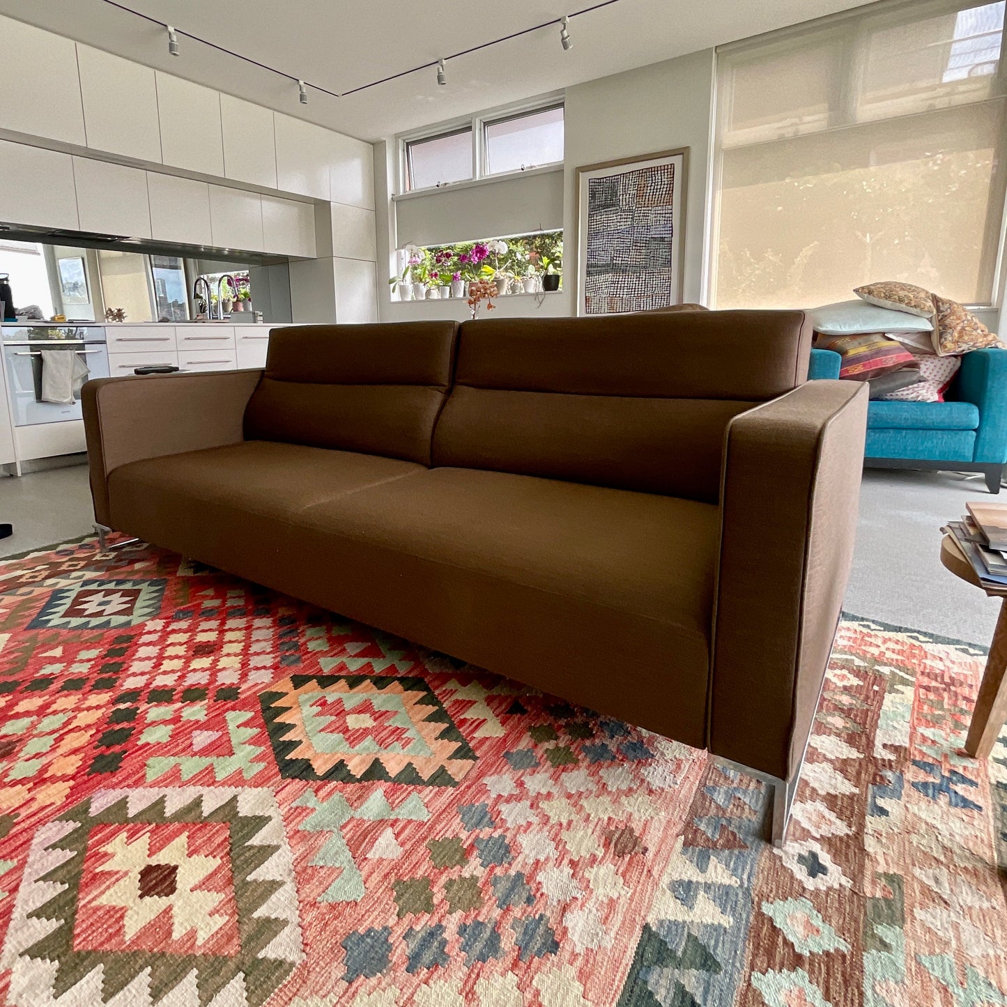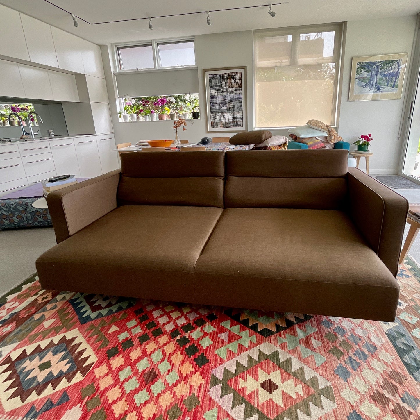 Three seat sofa by Ligne Roset. The seat and back are adjustable. The seat pulls out to make space for a single bed. Upholstered in a brown fabric.