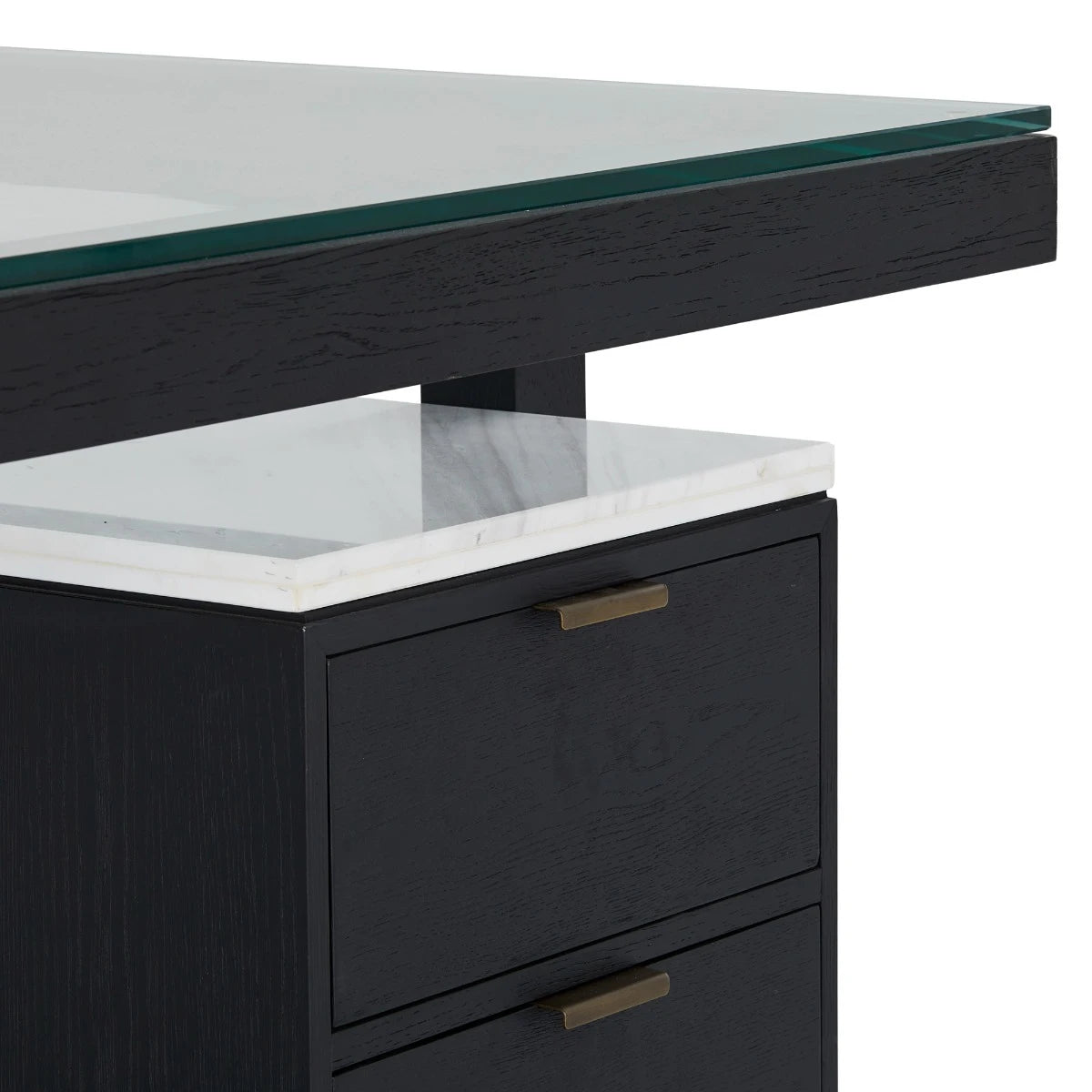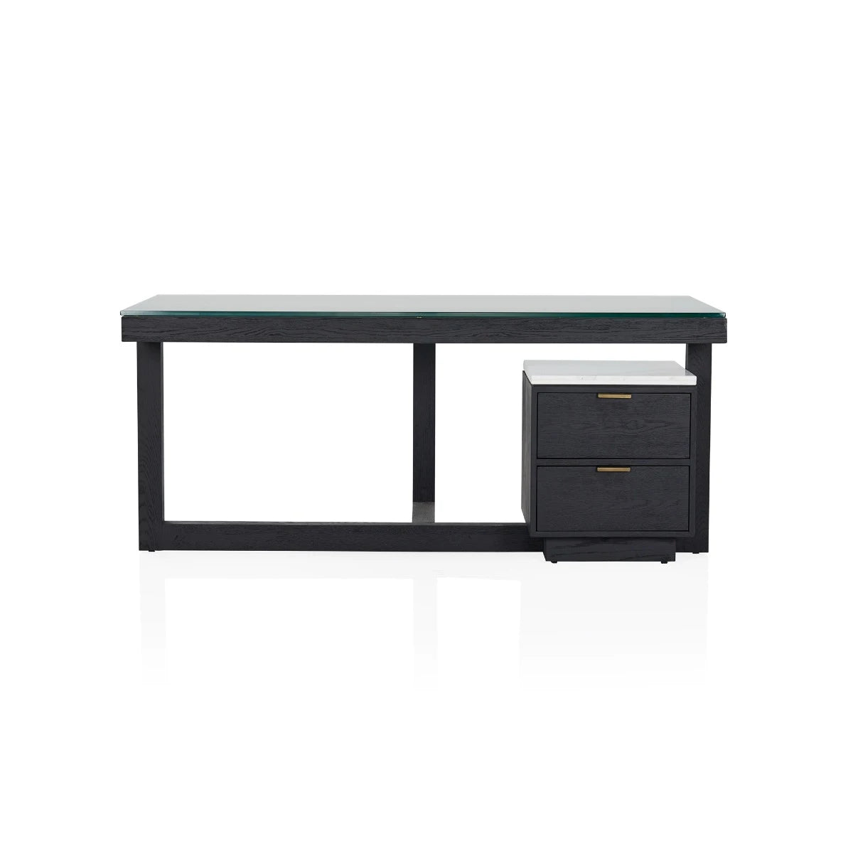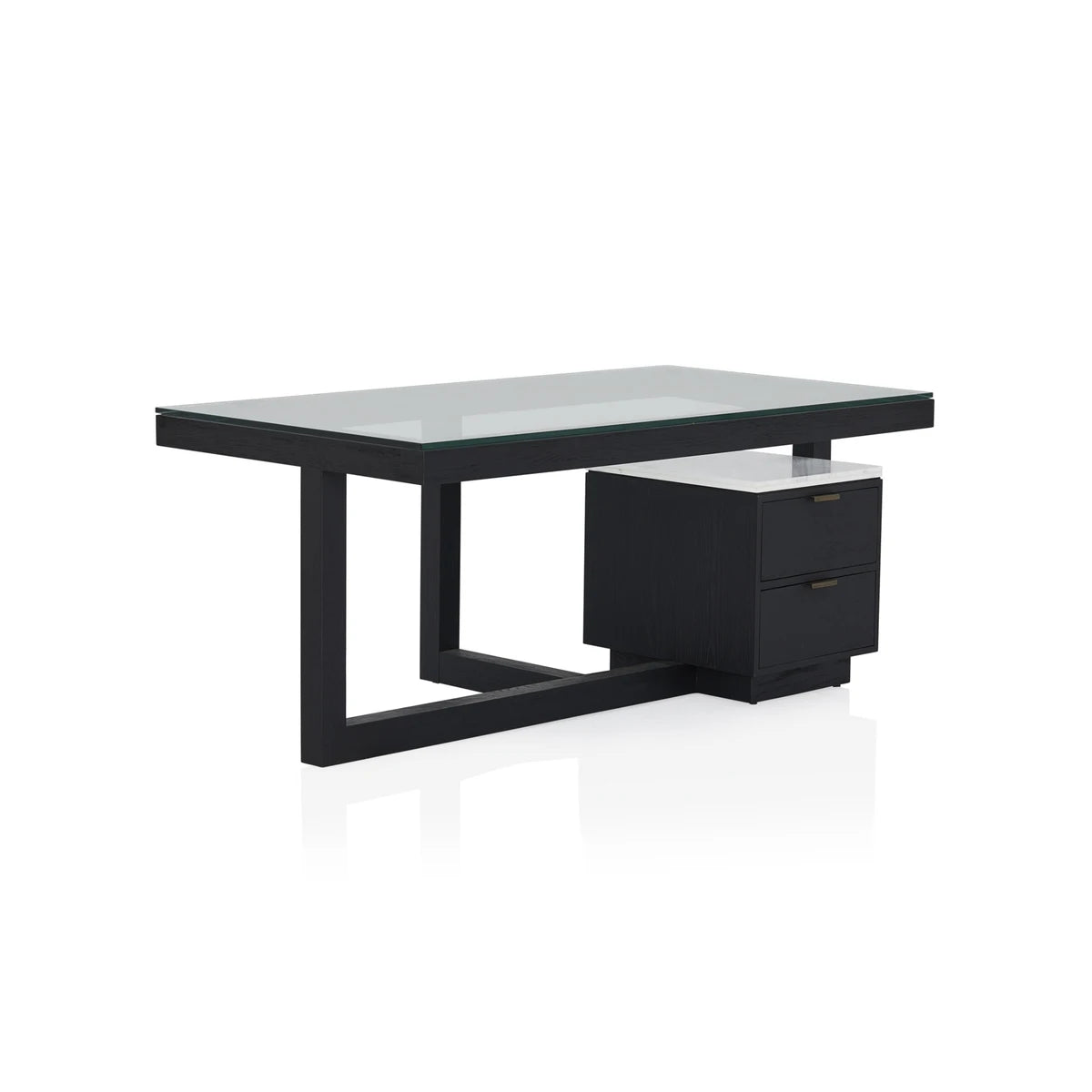 Striking timber desk frame crafted from solid oak with marble and timber drawer unit and clear glass top. The two drawer unit is right side facing.