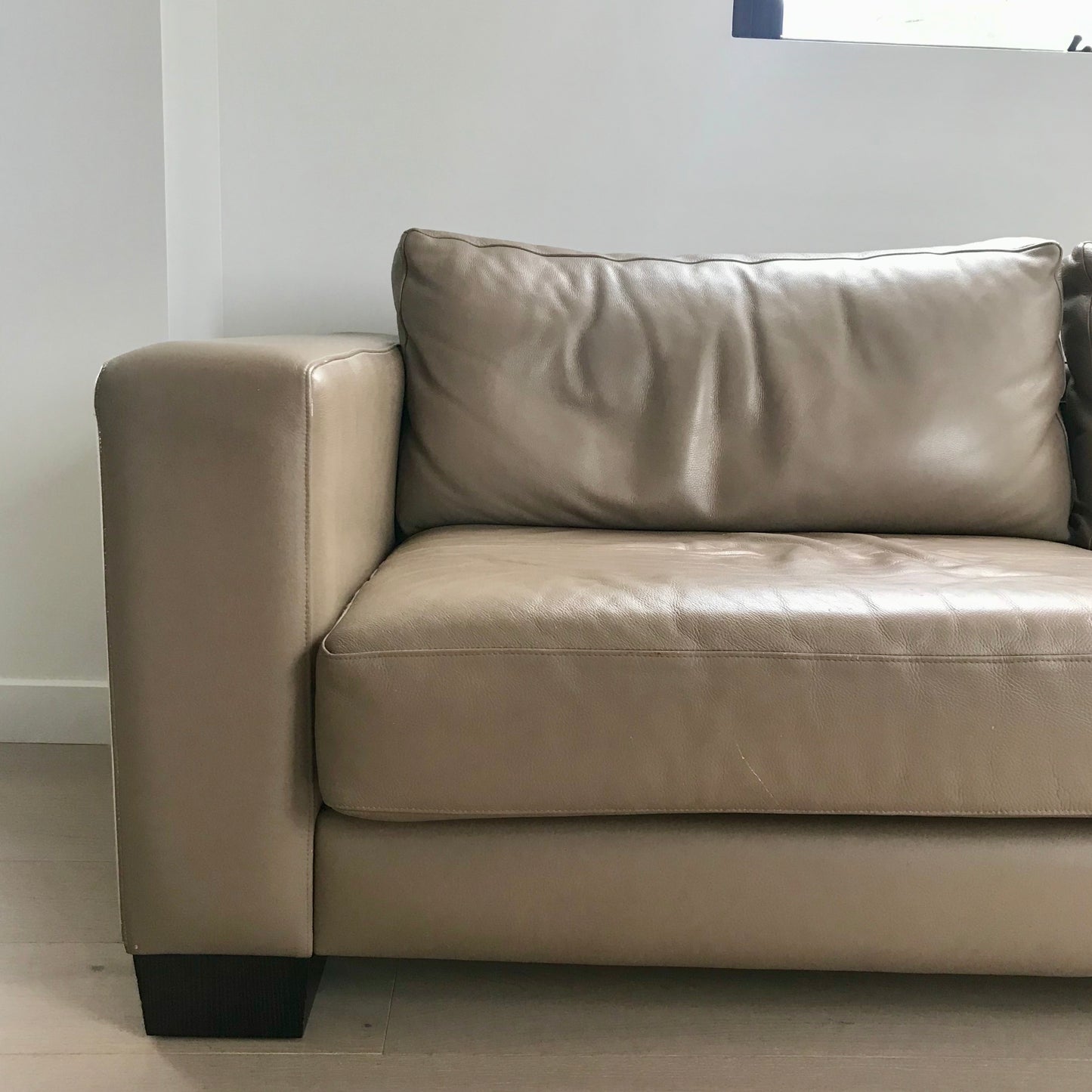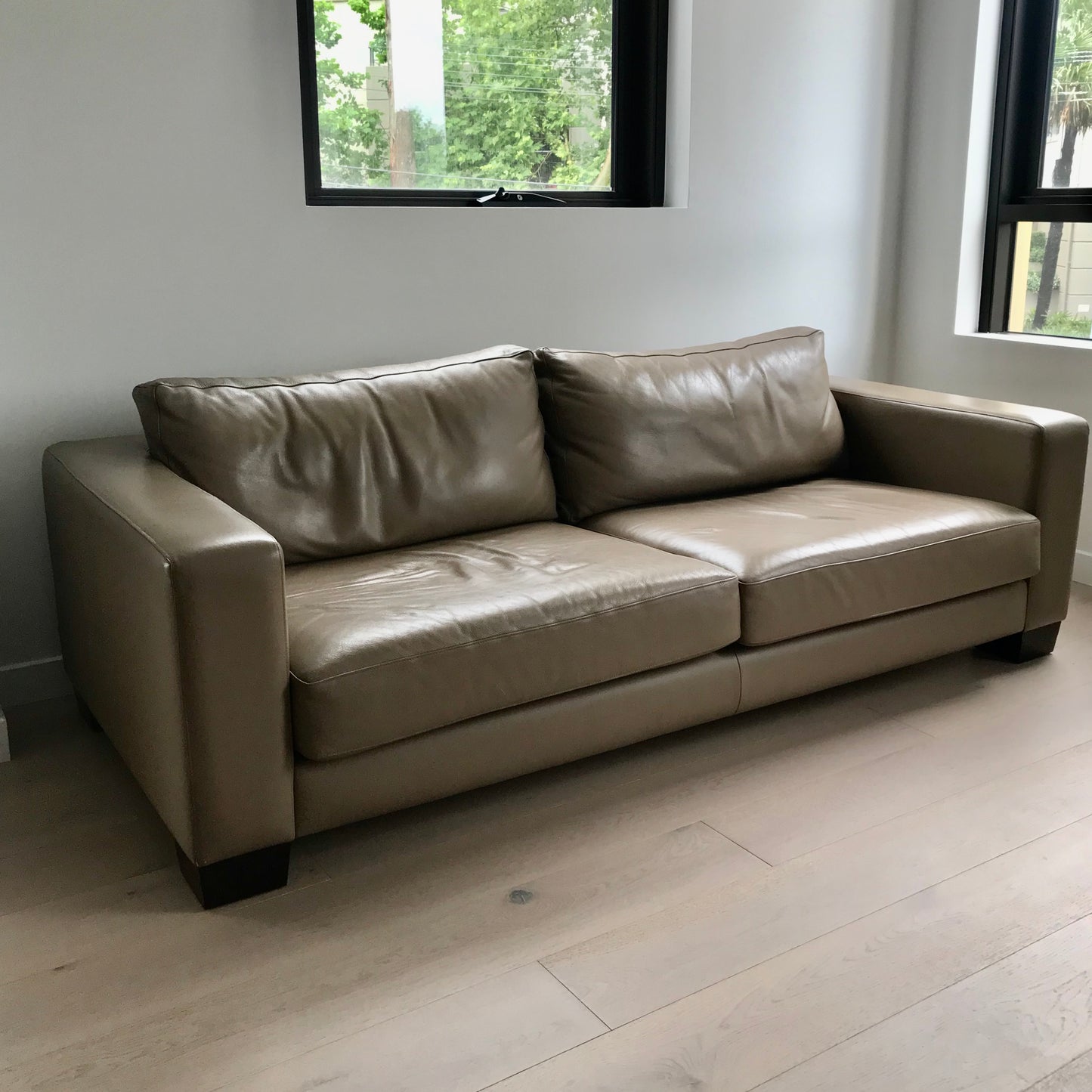 Three seat tuxedo style sofa by fanuli. Upholstered in a tan leather. Seat and back cushions are removable.