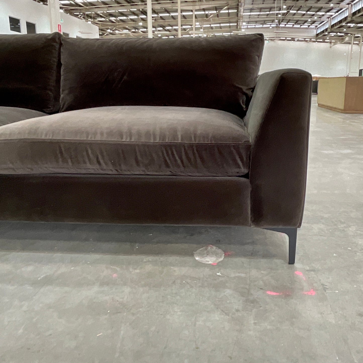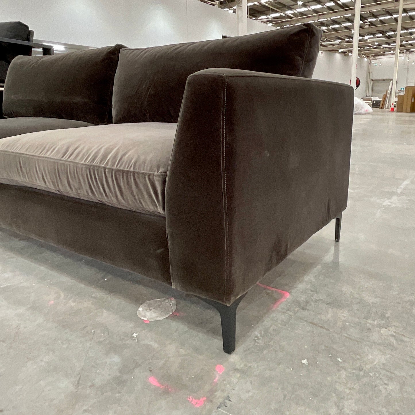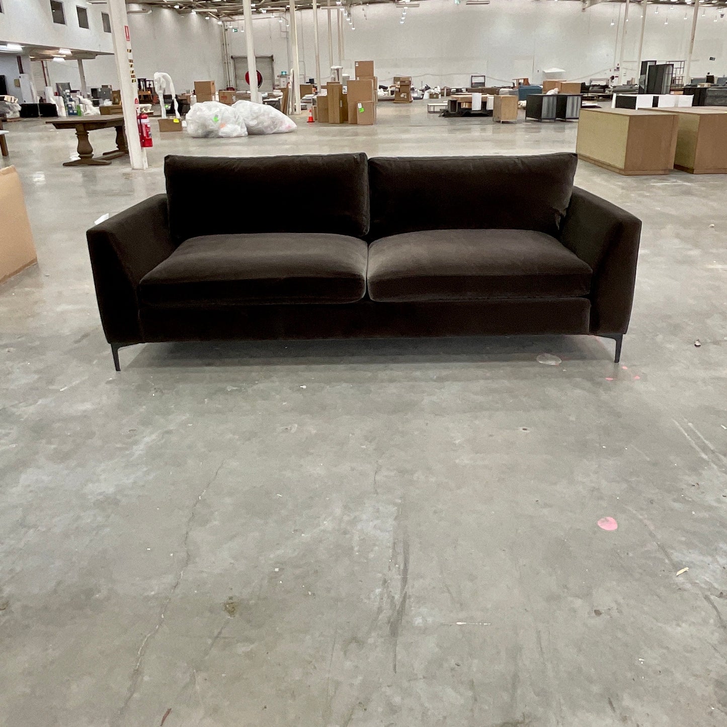 The velvet sofa we have on offer has two loose seat and back cushions and is upholstered in a charcoal velvet with metal legs.