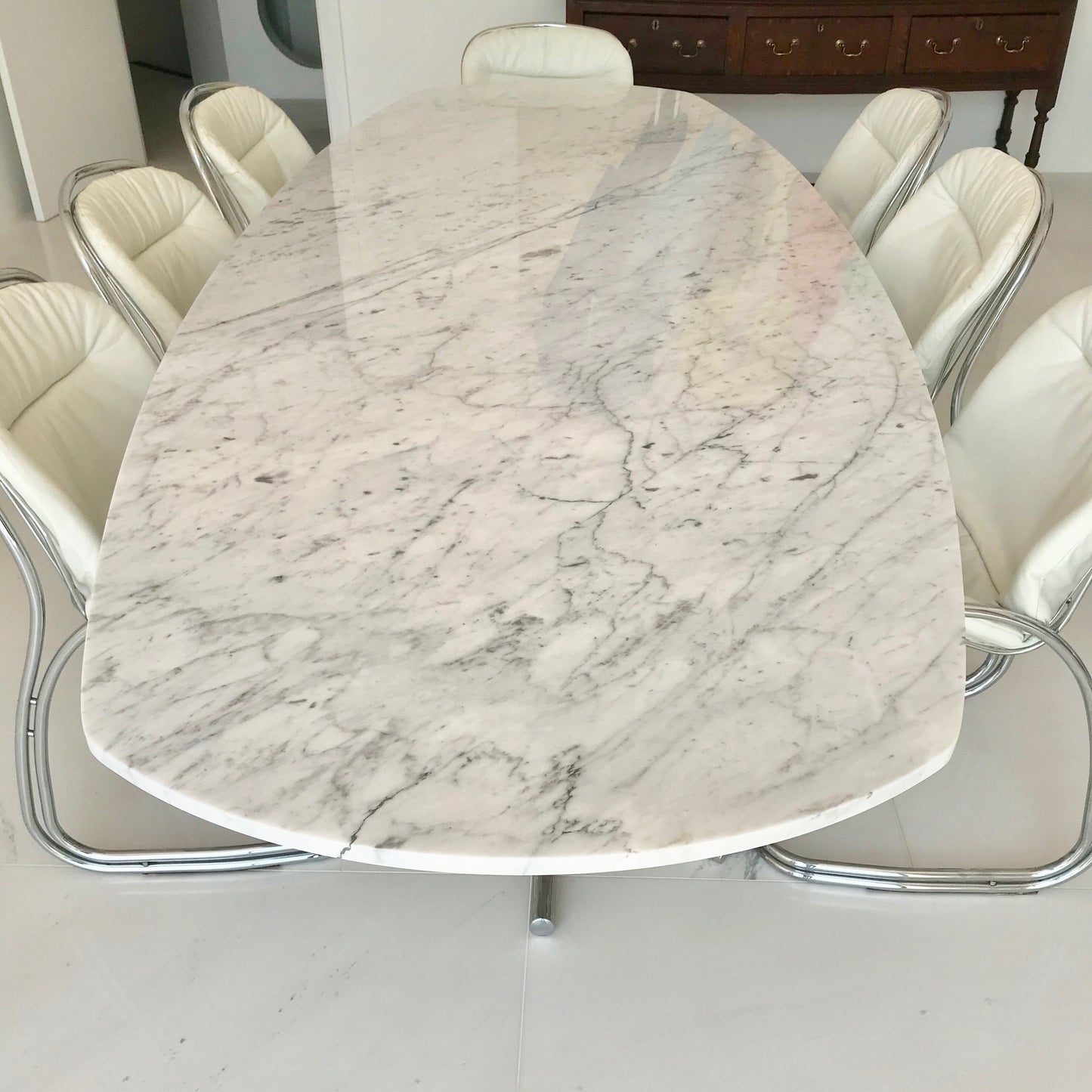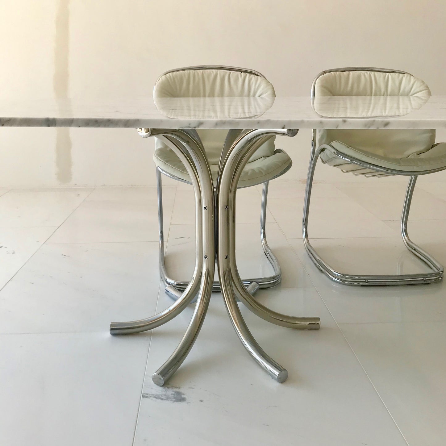 The vintage dining table has a double fluted pedestal base in tubular polished chrome. The table top is new and is Carrara marble.