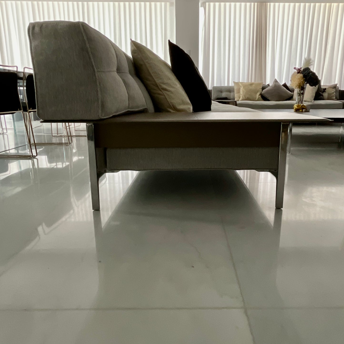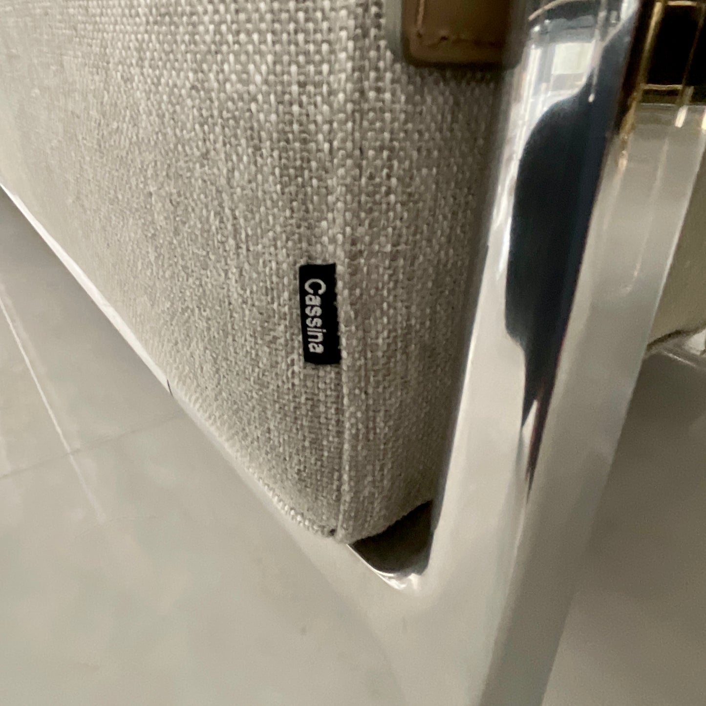A sectional modular sofa characterised by a timelessly elegant aesthetic, suitable to any space. Using an innovated revised technique the traditional button is replaced by a concealed inner fastener. This approach was developed by Philippe Stark. Each and every one of these pieces expresses its own idea of contemporary style, which translates as providing a comfortable and relaxing place in an everyday context. The Volage sofas, armchair, and foot-rests are available both in a textile upholstery or in a special capitonné leather finish. Cassina holds the exclusive international patent for the latter, which provides a guarantee of the upholstery’s quality and longevity. The sofa we have on offer has a taupe leather frame with grey fabric seat and back cushions. The sofa is in two pieces.