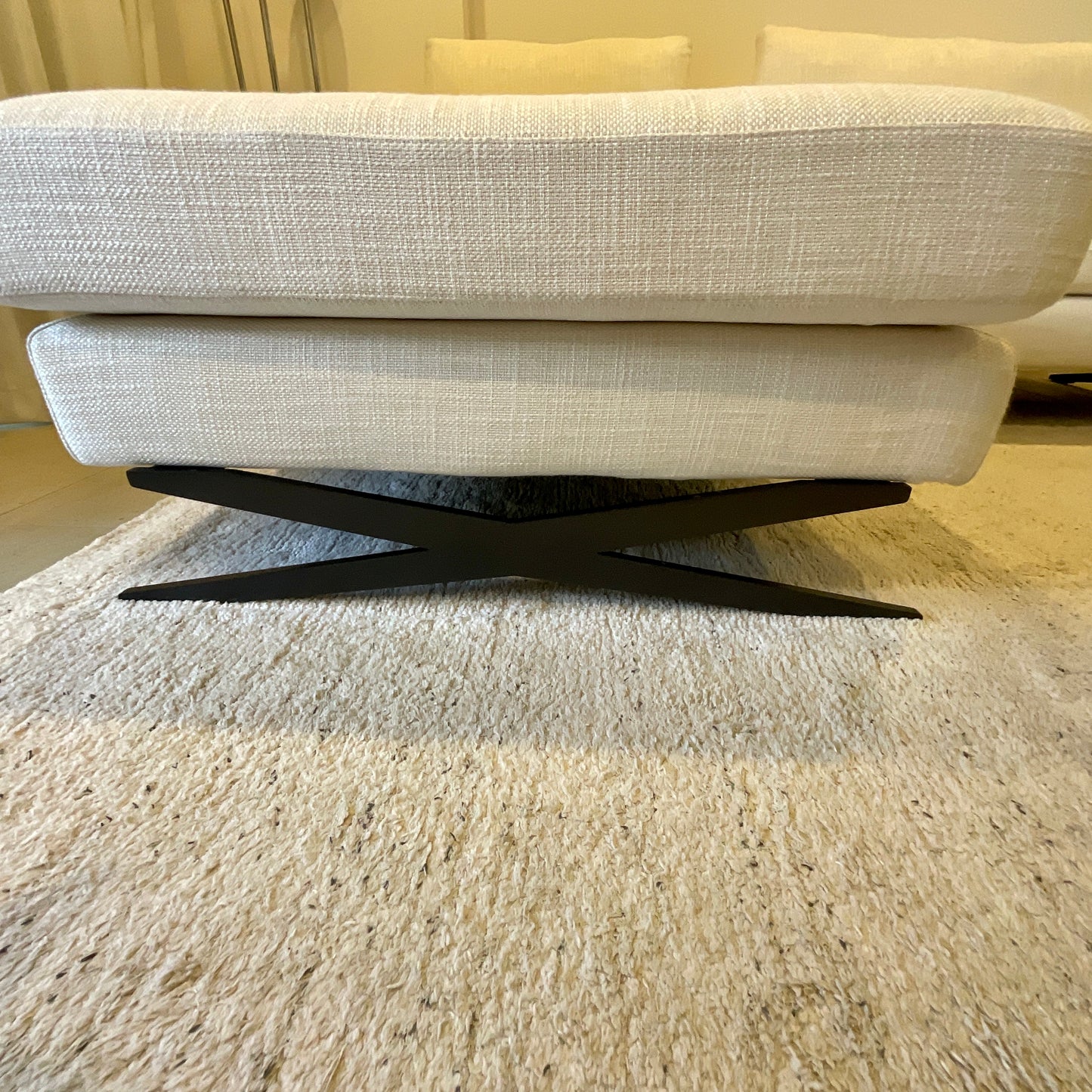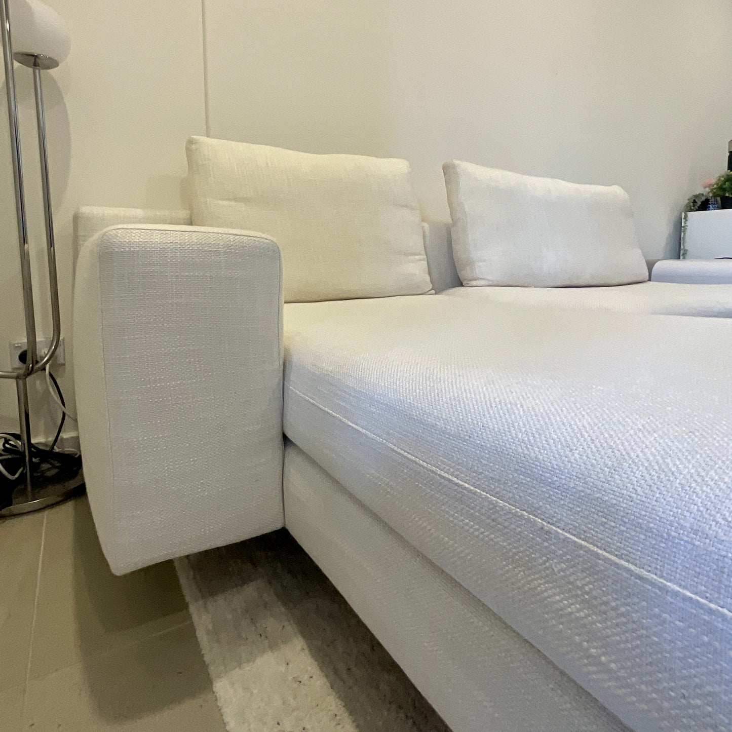 Sleek and sophisticated with an air of Mid-Century design, the Wake Sofa is sure to become the focal point of any modern home. The Wake series’ mix of components allow for extensive customisation. The solid birch frame and cross woven elastic webbing support seats of high resilient polyurethane foam topped with feather down providing comfort atop crisscrossed blackened metallic steel legs. The sofa we have on offer is upholstered in a white fabric.