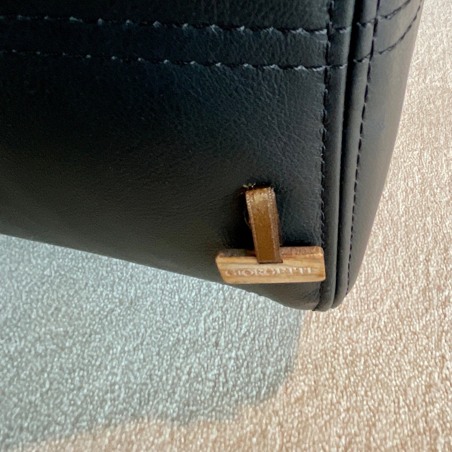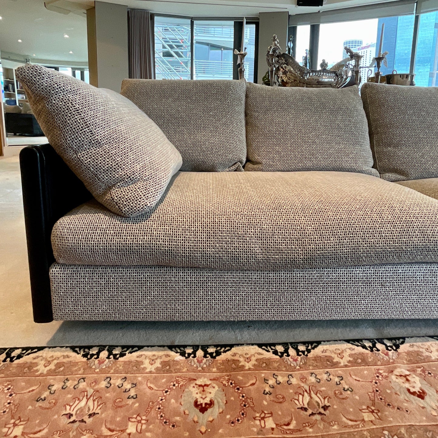 Wally is a series of fixed and modular armchairs and sofas, with a depth of 107 cm and a base structure in metal painted matt black. The structure of the backrest and armrests is in superlight blockboard with fibre padding. The seat bottom is in multi-density polyurethane foam covered in fibre. The seat cushion is in down with a polyurethane foam insert. The sofa we have on offer is upholstered in Giorgetti Fabric with black leather frame.