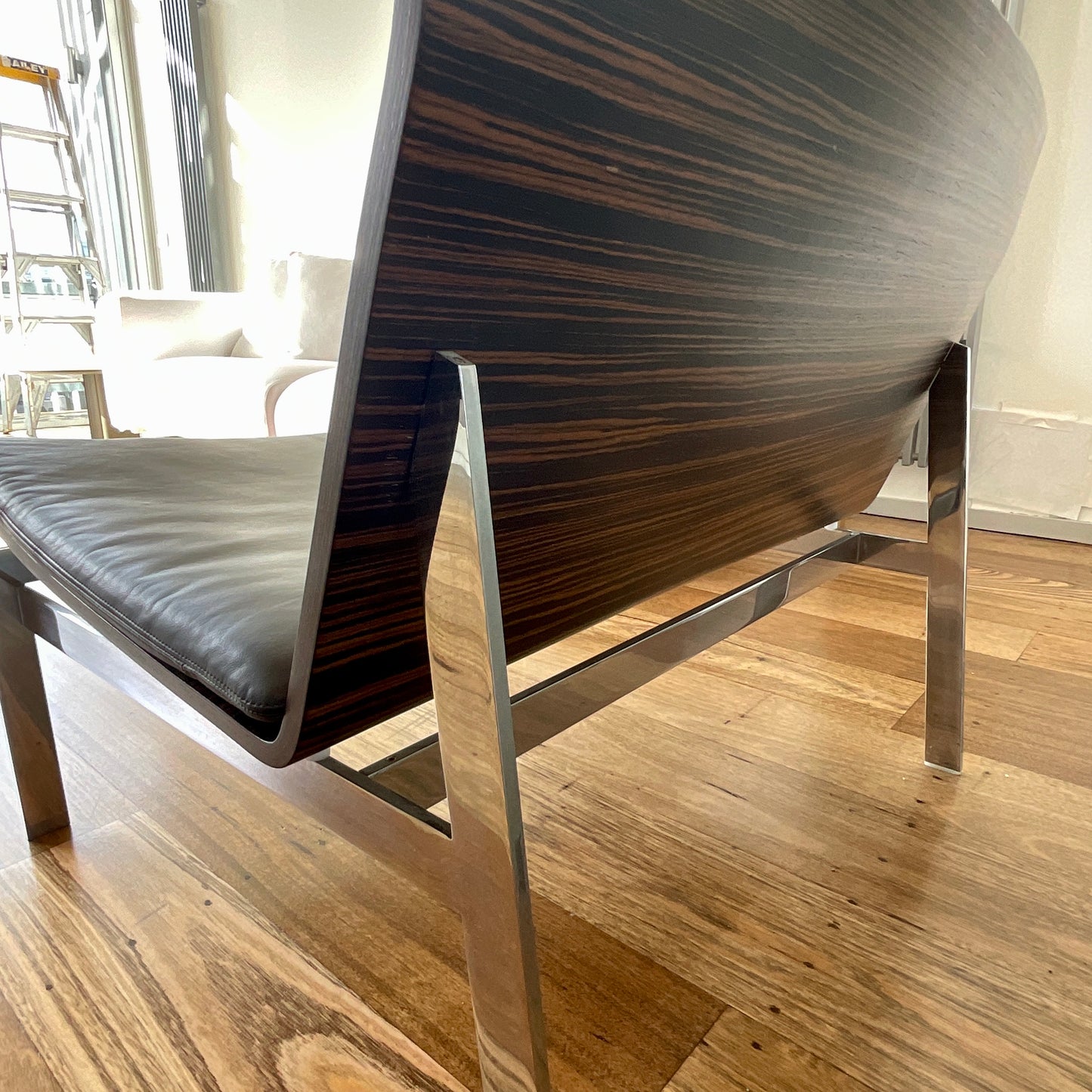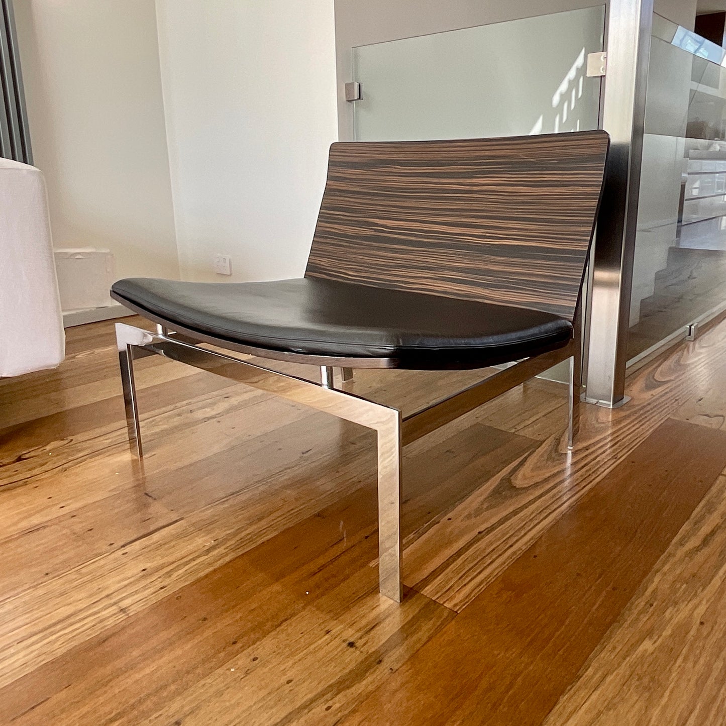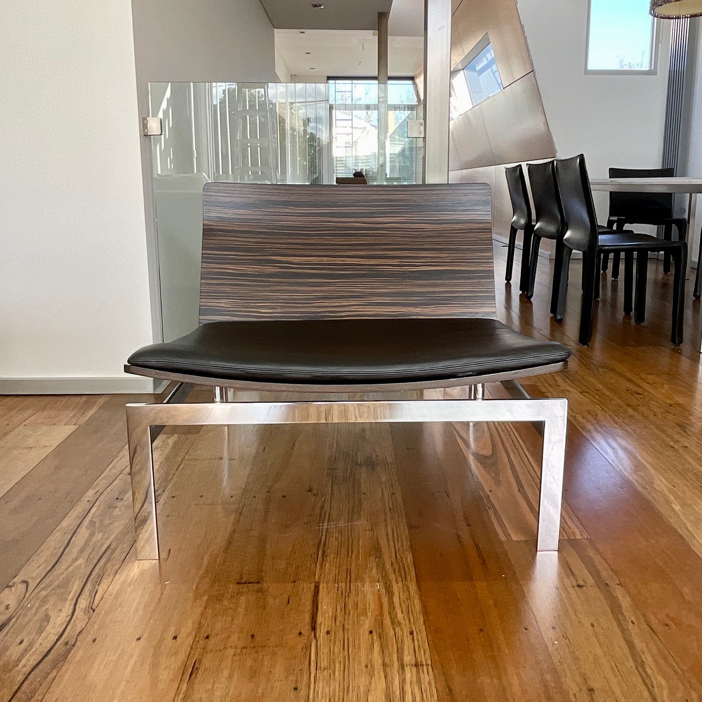 The B&B Italia Words Designer Jeffrey Bernett Arm Chair is a timeless piece of furniture that adds a touch of elegance to any space. This armchair is not only stylish but also sustainable. The chair we have on offer has a polished chrome base with molded timber back and black leather seat pad.
