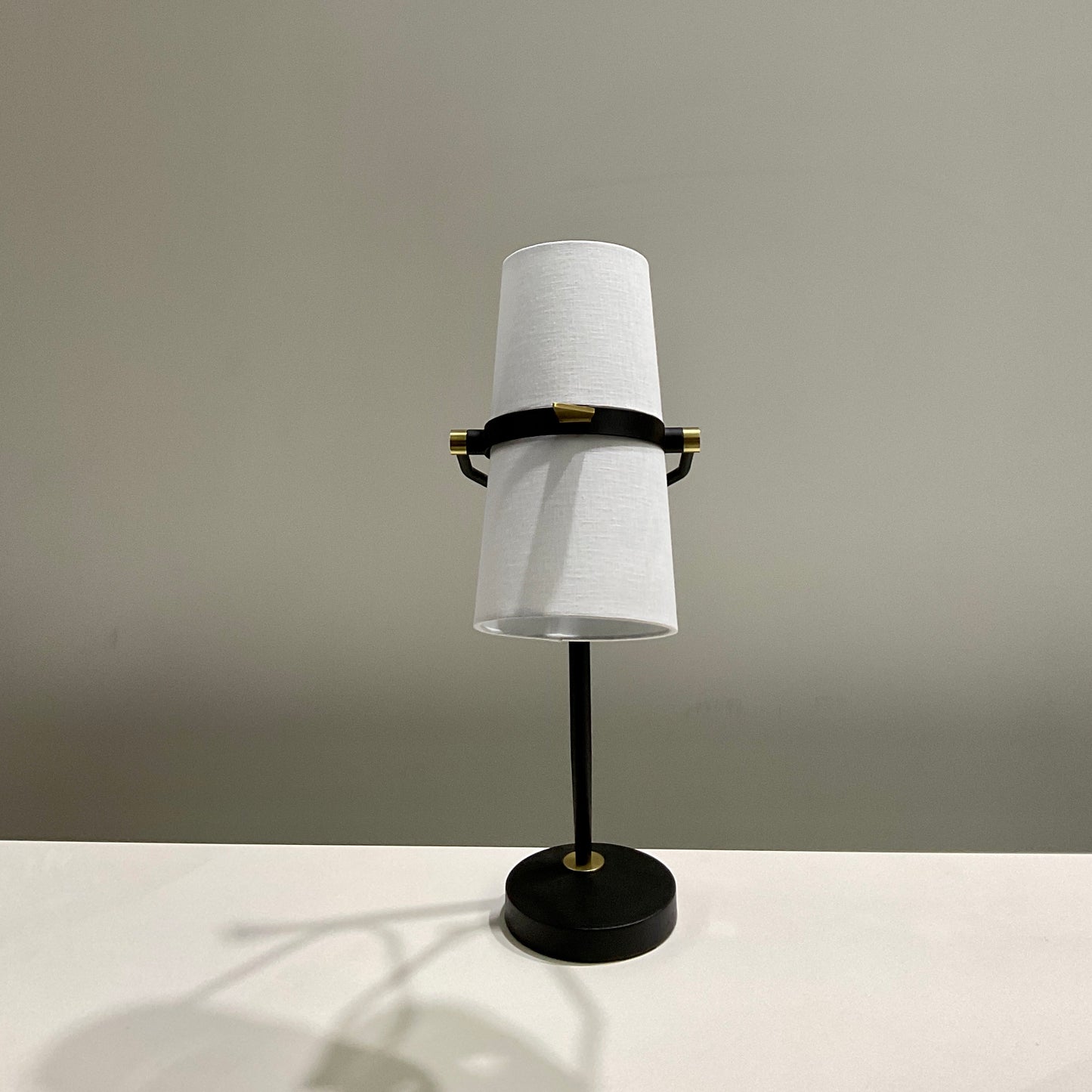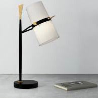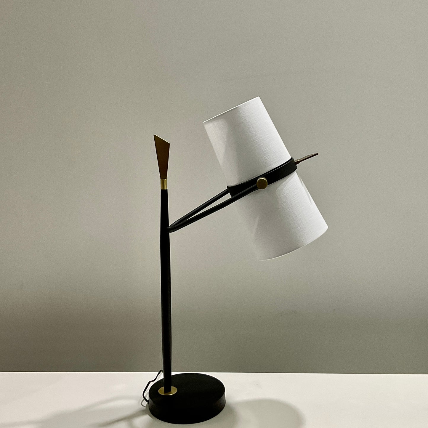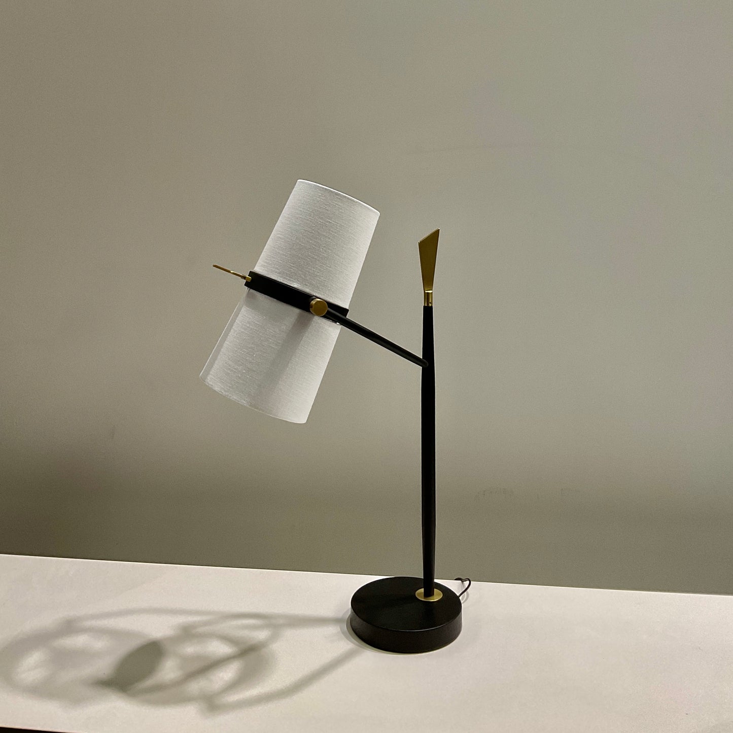 Modern table lamp with a black tapered slender vertical rod and a blade shaped brass finish finial. A white linen cylindrical double shade with off-white cotton lining allows for directing task lighting.