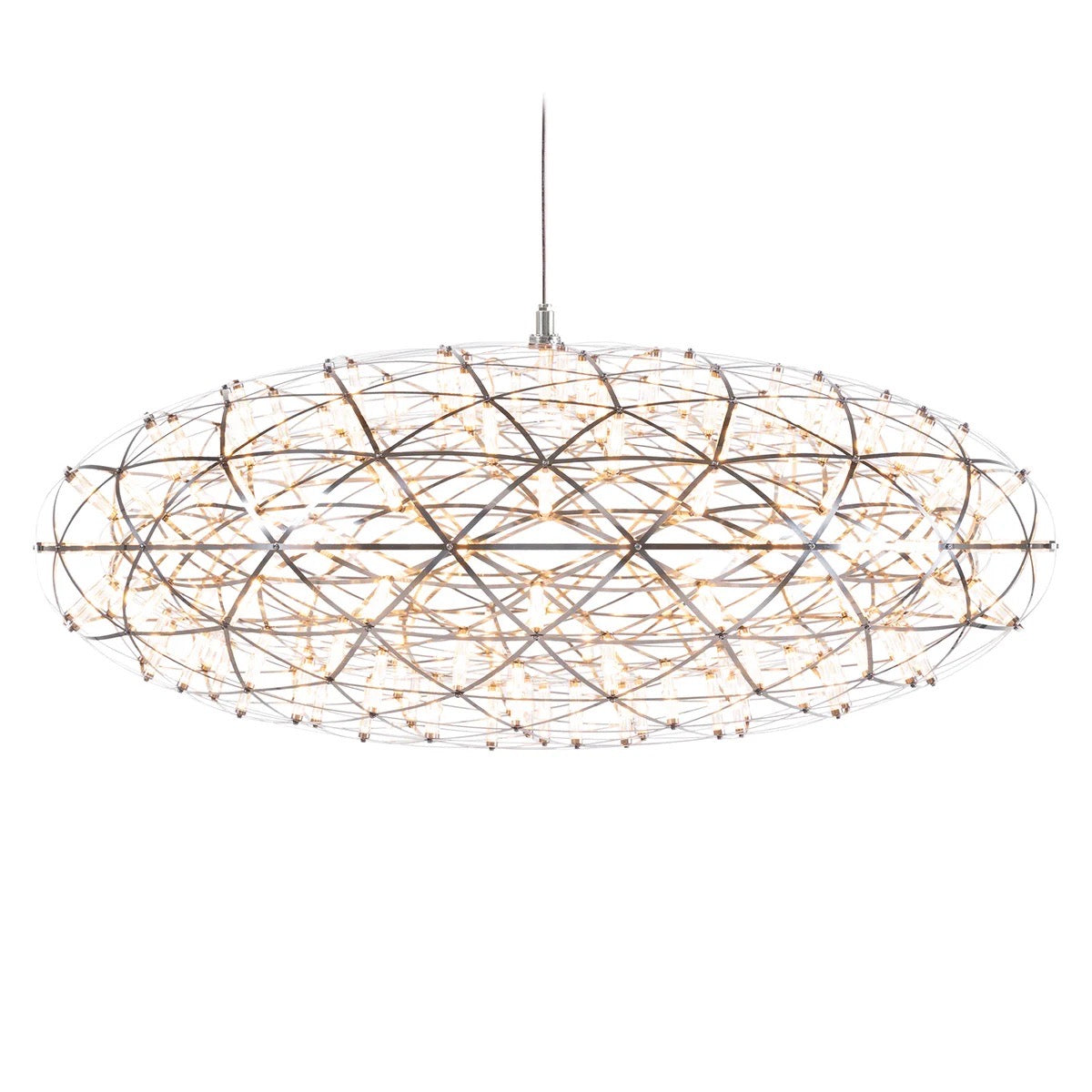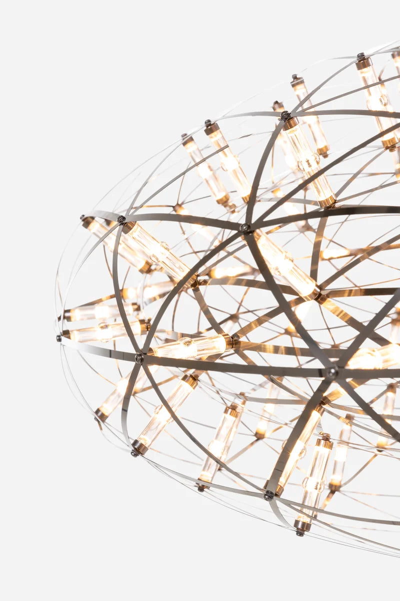 The Raimond Zafu creates an extra-terrestrial effect with its elliptical shape and tiny LED-lights. Like its spherical family members, the Raimond Zafu is made from the same elegant metal strips and mathematical ingredients. The name Zafu comes from the transcendental shape inspired by designer Raimond Puts’ meditation cushion. the suspension light is in stainless steel with LED's 18w, transparent cord with non dimmable power supply.