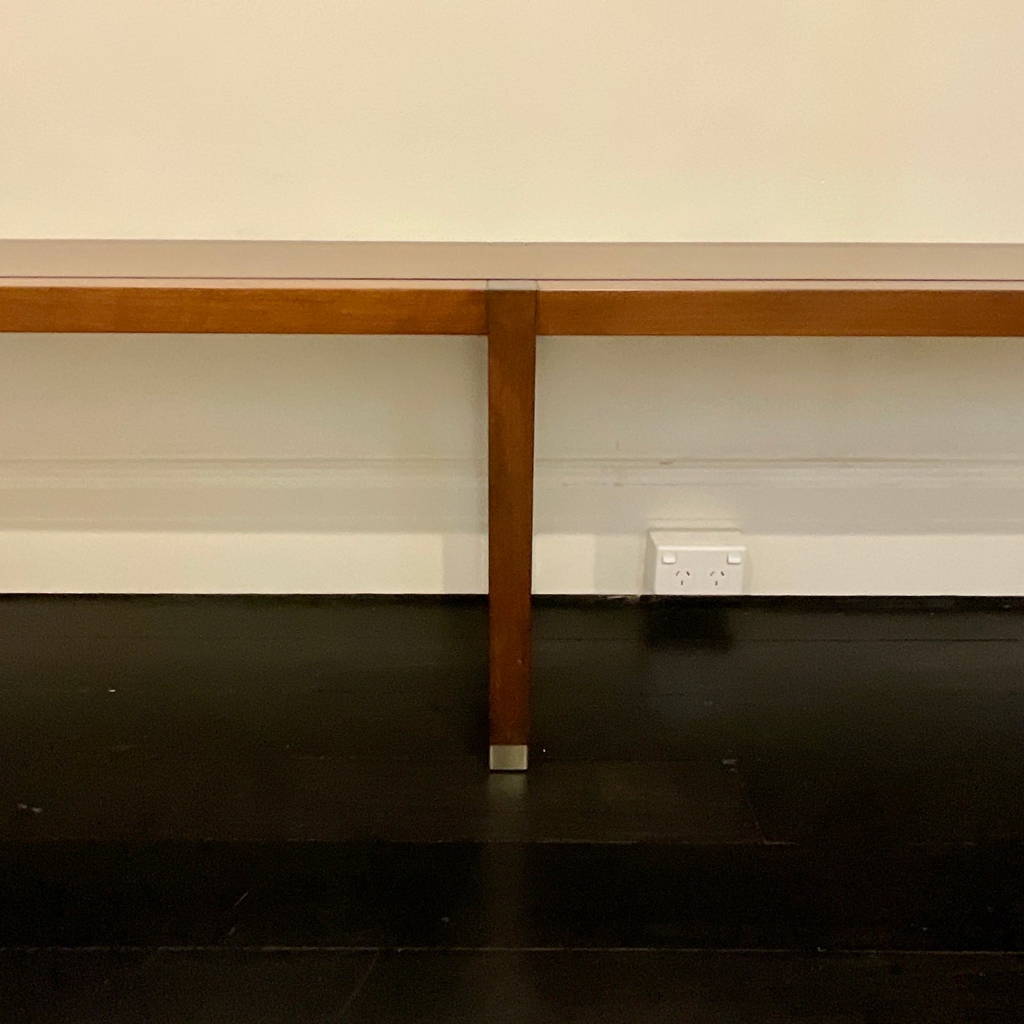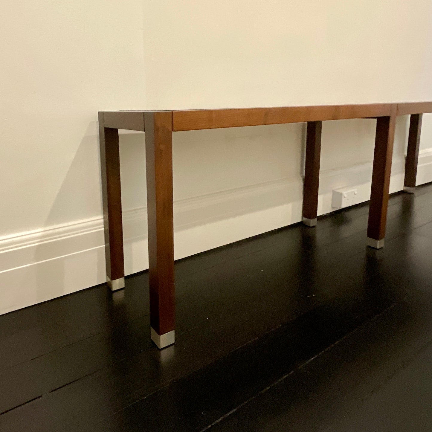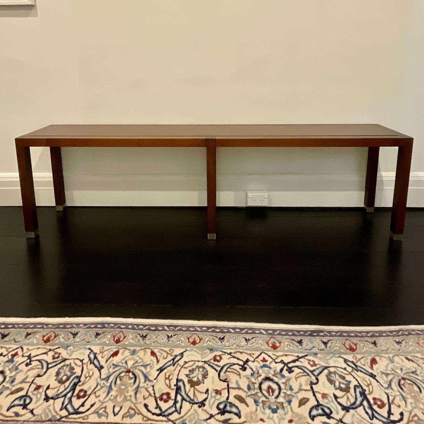 Stylish low sofa table, rare find in this height. Solid timber frame with metal capper feet. Was made to sit behind the Zanzibar Sofa.